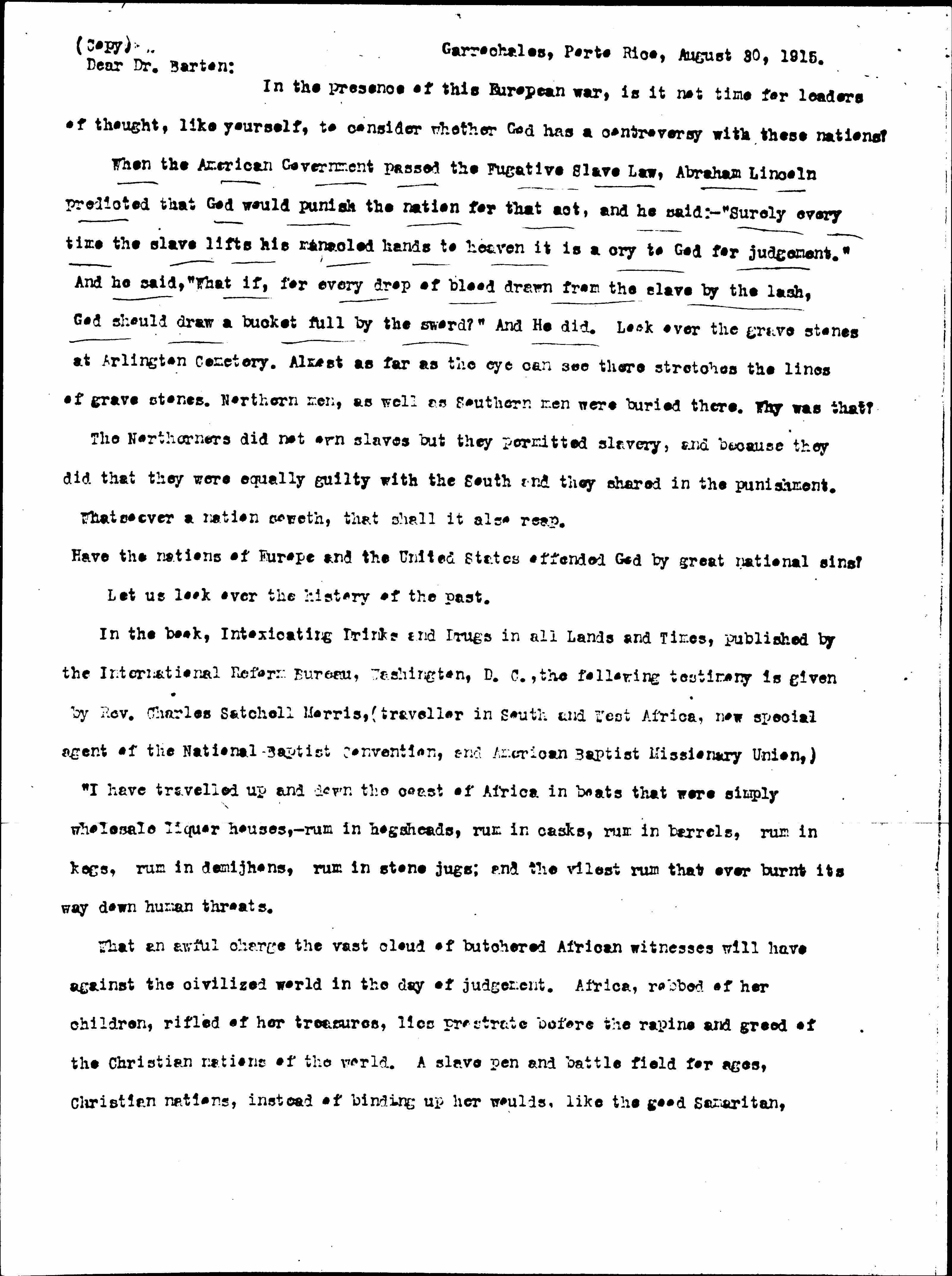 What an awful charge the vast cloud of butchered African witnesses will have against the civilized world in the day of [judgment]. Africa, robbed of her children, rifled of her treasures, lies prostrate before the rapine and greed of the Christian nations of the world. A slave pen and battle field for ages, Christian nations, instead of binding up her [wounds], like the good Samaritan, [page 2] Instead of passing by and leaving her alone, like the Levite and priest: have come to her with ten thousand ship-loads of hell's master-piece of damnation, rum, that is turning her children into human cinders; that has turned the entire West Coast into one long bar-room, from which no less than two million savages go forth to die every year as a result of the traffic. 'Gin, gin,' is the cry all along the West Coast, and, says Joseph Thompson, 'underneath that cry for gin I can hear the reproach, you see what Christian nations have made us.' Africa sends to Europe palm oil, palm kernels, rubber and coffee; Europe sends to Africa powder and balls to slaughter the body, and rum to slay the soul."
