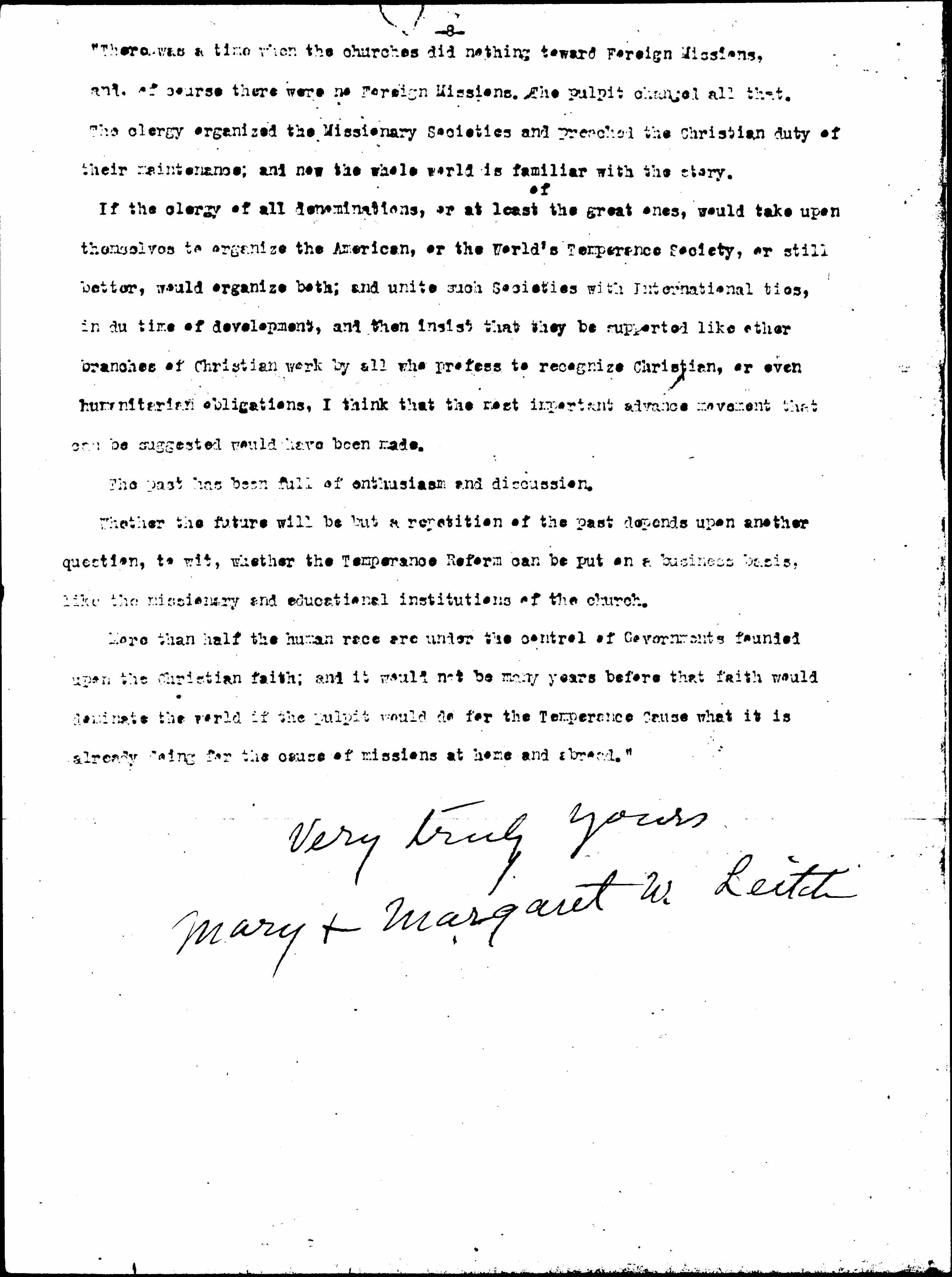 If the clergy of all denominations, or at least <of> the great ones, would take upon themselves to organize the American, or the World's Temperance Society, or still better, would organize both; and united such Societies with International ties, in [due] time of development, and then insist that they be supported like other branches of Christian work by all who profess to recognize Christian, or even humanitarian obligations, I think that the most important advance movement that can be suggested would have been made.