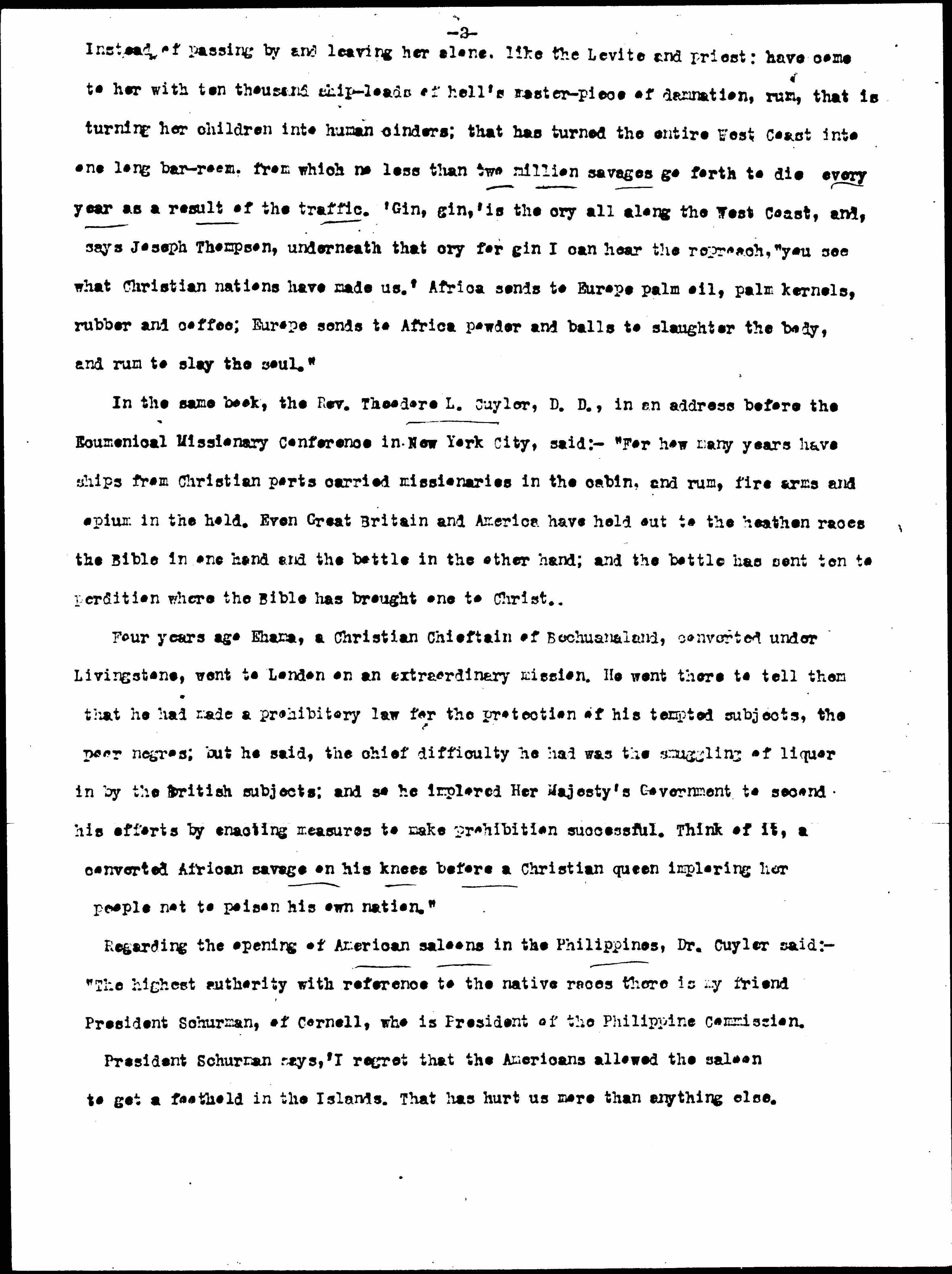 In the same book, the Rev. Theodore L. Cuyler, D.D., in an address before the Ecumenical Missionary Conference in New York City, said: -- "For how many years have ships from Christian ports carried missionaries in the cabin, and rum, fire arms and opium in the hold. Even Great Britain and America have held out to the heathen races the Bible in one hand and the bottle in the other hand; and the bottle has sent ten to perdition where the Bible has brought one to Christ.