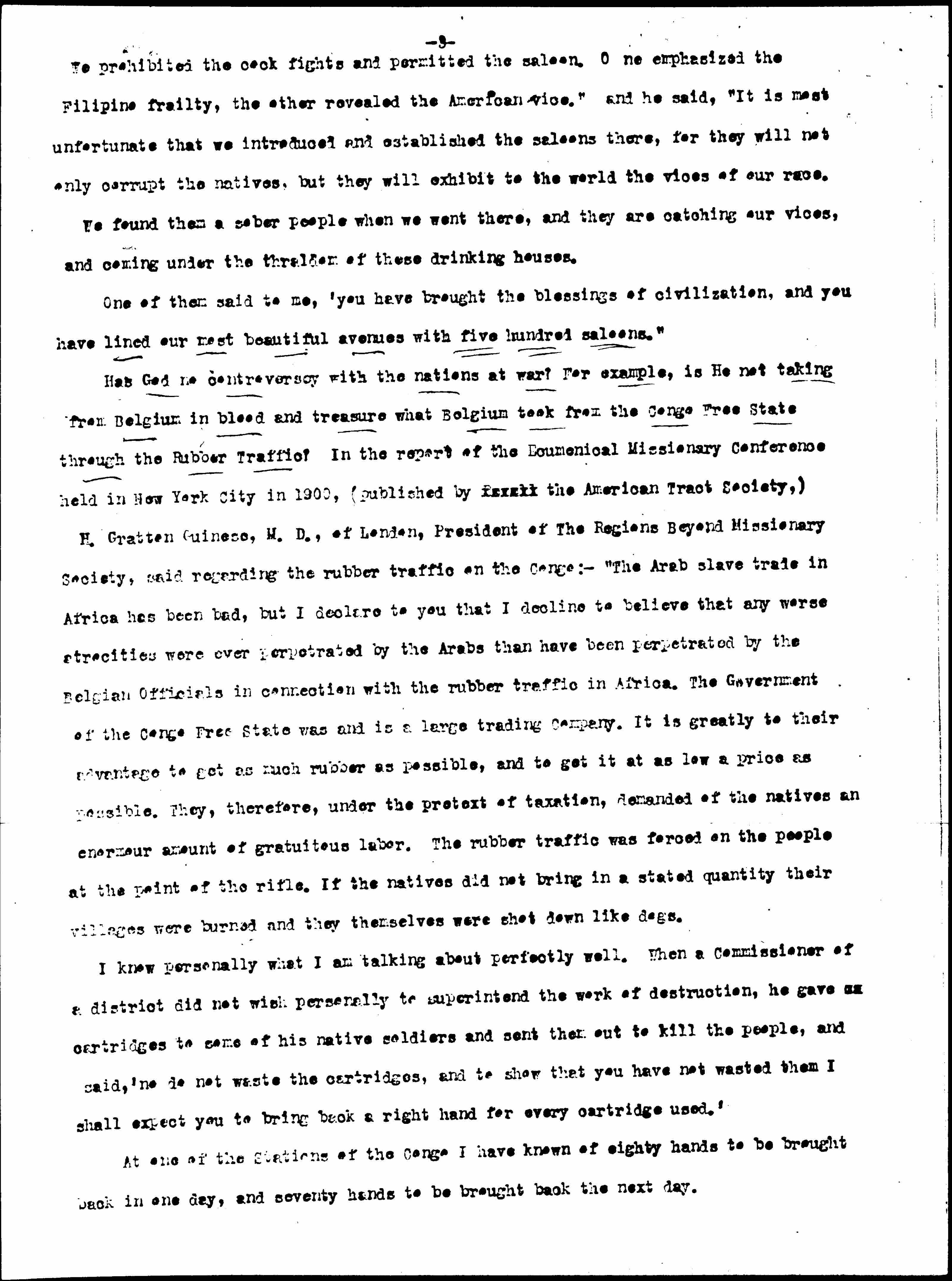 Has God no [controversy] with the nations at war? For example, is He not taking from Belgium in blood and treasure what Belgium took from the Congo Free State through the Rubber Traffic? In the report of the Ecumenical Missionary Conference held in New York City in 1900, (published by [illegible] the American Tract Society,) H. [Grattan Guinness], M.D., of London, President of The Regions Beyond Missionary Society, said regarding the rubber traffic on the Congo: -- "The Arab slave trade in Africa has been bad, but I declare to you that I decline to believe that any worse atrocities were ever perpetrated by the Arabs than have been perpetrated by the Belgian Officials in connection with the rubber traffic in Africa. The Government of the Congo Free State was and is a large trading company. It is greatly to their advantage to get as much rubber as possible, and to get it at as low a price as possible. They, therefore, under the pretext of taxation, demanded of the natives an [enormous] amount of gratuitous labor. The rubber traffic was forced on the people at the point of the rifle. If the natives did not bring in a stated quantity their villages were burned and they themselves were shot down like dogs.