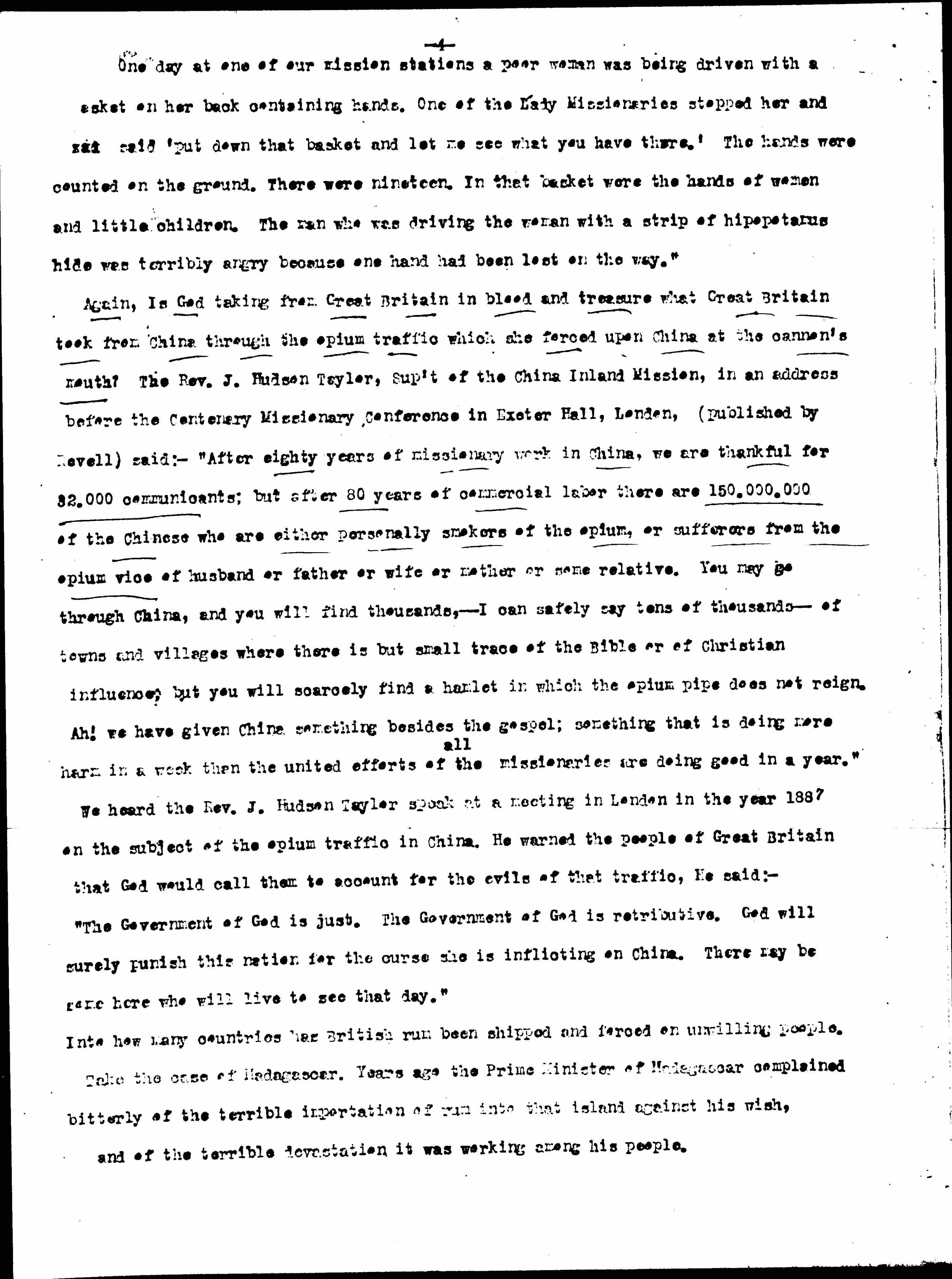One day at one of our mission stations a poor woman was being driven with a [basket] on her back containing hands. One of the Lady Missionaries stopped her and [illegible] said 'put down that basket and let me see what you have there.' The hands were counted on the ground. There were nineteen. In that basket were the hands of women and little children. The [man] who was driving the woman with a strip of [hippopotamus] hide was terribly angry because one hand had been lost on the way."Again, Is God taking from Great Britain in blood and treasure what Great Britain took from China through the opium traffic which she forced upon China at the cannon's mouth? The Rev. J. Hudson Taylor, Sup't of the China Inland Mission, in an address before the Centenary Missionary Conference in Exeter Hall, London, (published by Revell) said: -- "After eighty years of missionary work in China, we are thankful for 32,000 communicants; but after 80 years of commercial labor there are 150,000,000 of the Chinese who are either personally smokers of the opium, or sufferers from the opium vice of husband or father or wife or mother or some relative. You may go through China, and you will find thousands, -- I can safely say tens of thousands -- of towns and villages where there is but small trace of the Bible or of Christian influence, but you will scarcely find a hamlet in which the opium pipe does not reign. Ah! we have given China something besides the gospel; something that is doing more harm in a week than the united efforts of <all> the missionaries are doing good in a year."