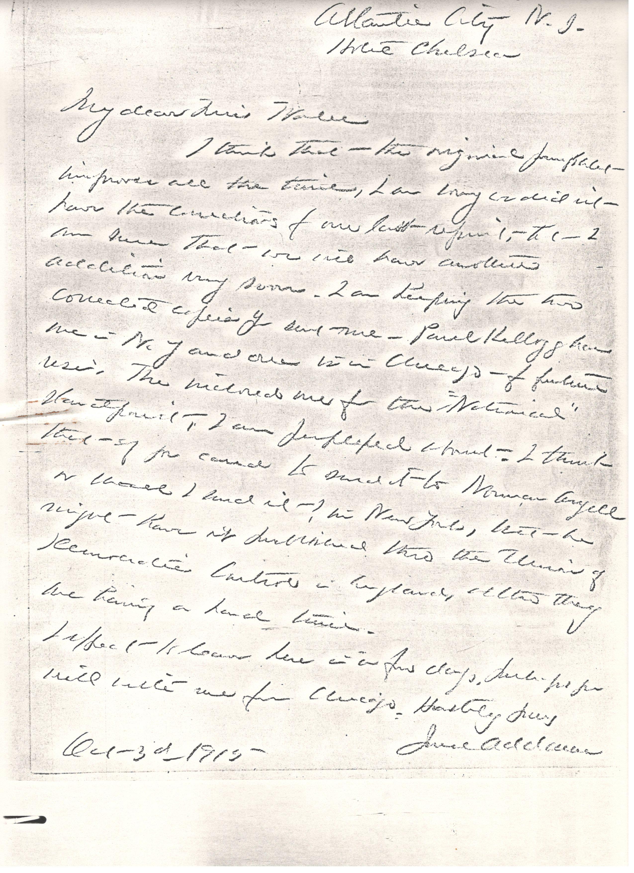I think that the original pamphlet improves all the time. I am sorry we didn't have the corrections [for] our last reprint, but I am sure that we will have another addition very soon. I am keeping the two corrected copies you sent me -- Paul Kellogg has one in N.Y and one is in Chicago -- for future use. The [enclosed] one for the "National" standpoint, I am perplexed about. I think that if you cared to send it to Norman Angell or should I send it? in New York, that he might have it published [through] the Union of Democratic Control in England, [although] they are having a hard time.