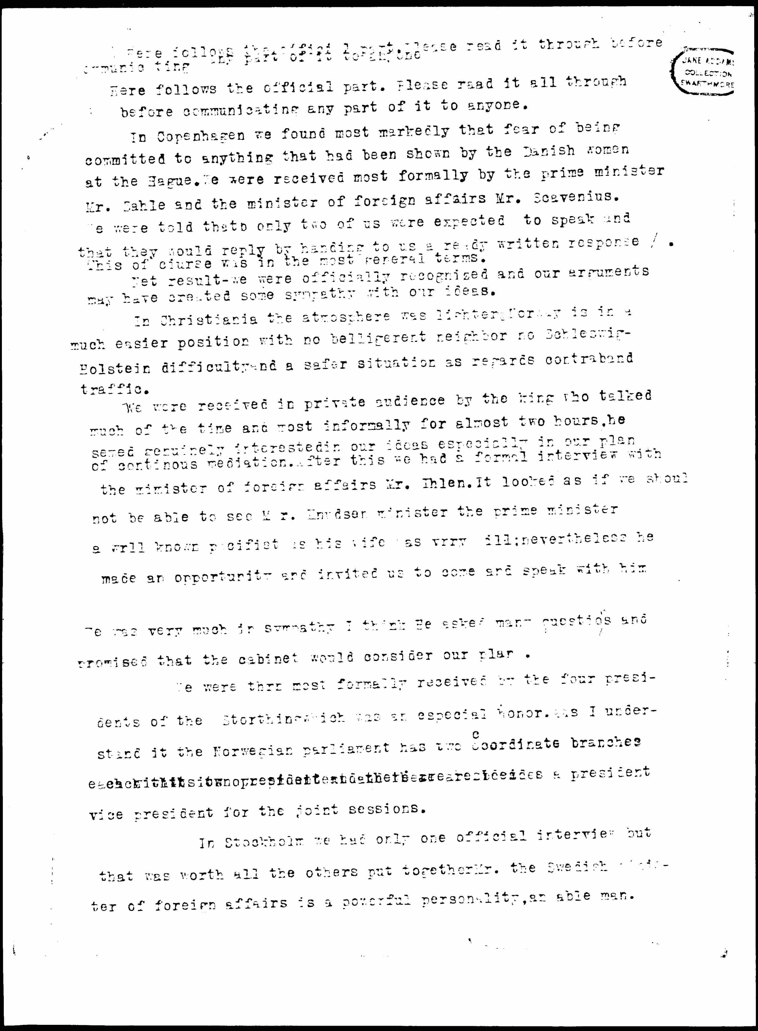 We were received in private audience by the king who talked much of the time and most informally for almost two hours, he [seemed] genuinely interested in our ideas especially in our plan of [continuous] mediation. After this we had a formal interview with the minister of foreign affairs Mr. Ihlen. It looked as if we should not be able to see Mr. Knudsen minister the prime minister a well known pacifist as his wife was very ill; nevertheless he made an opportunity and invited us to come and speak with him. He was very much in sympathy I think. He asked many questions and promised that the cabinet would consider our plan.