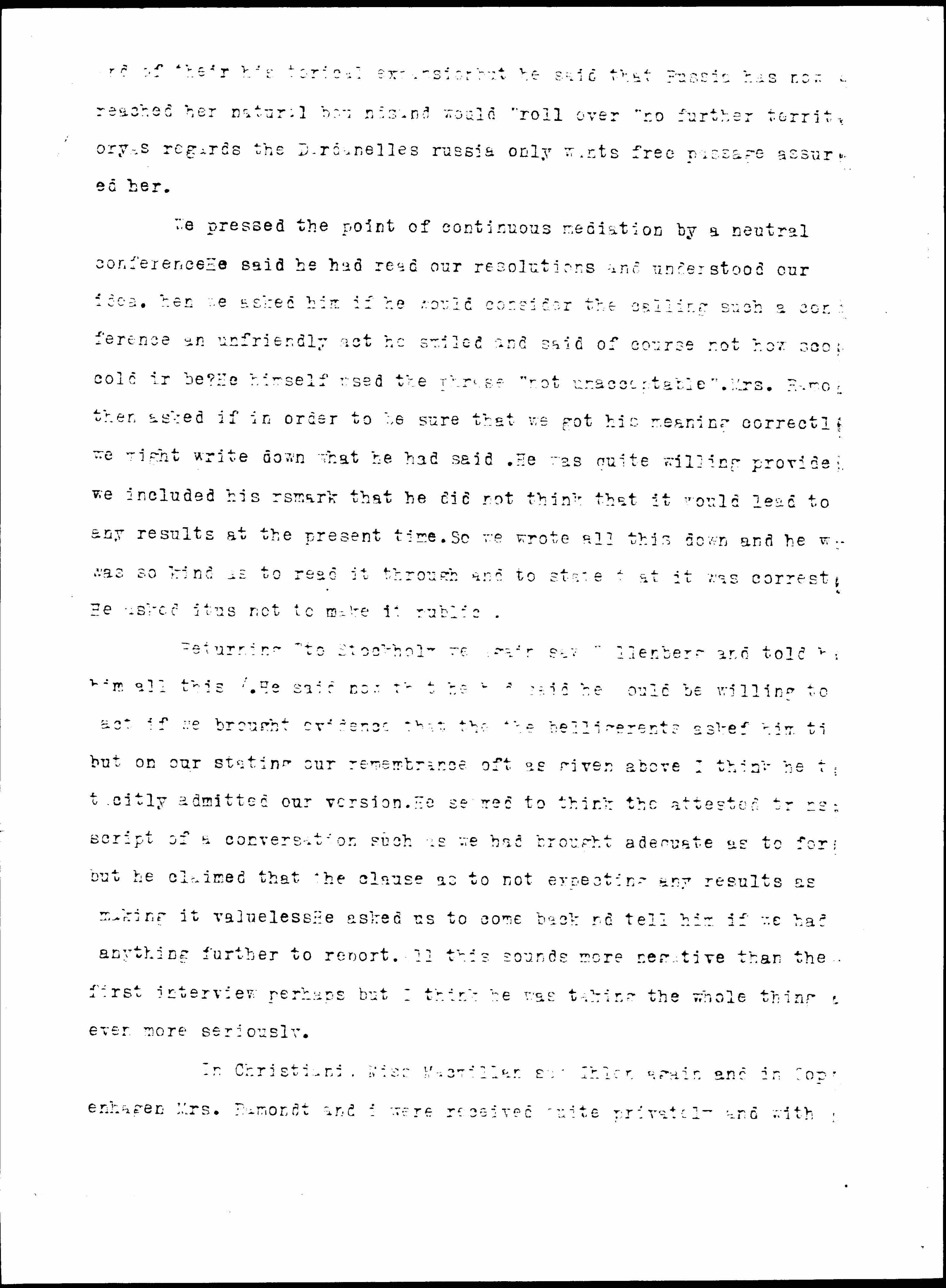 In Christiania Miss Macmillan saw Ihlen again and in Copenhagen Mrs. Ramondt and I were received quite privately and with [page 9] a request not to put it in the newspapers by Mr. [Edvard] Brandes the minister of finance. He was cynical or at least very [skeptical] but said he did not doubt that Denmark would join a neutral conference if Sweden and Norway did so. [Doubtless] Norway would say the same.