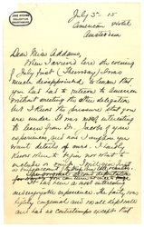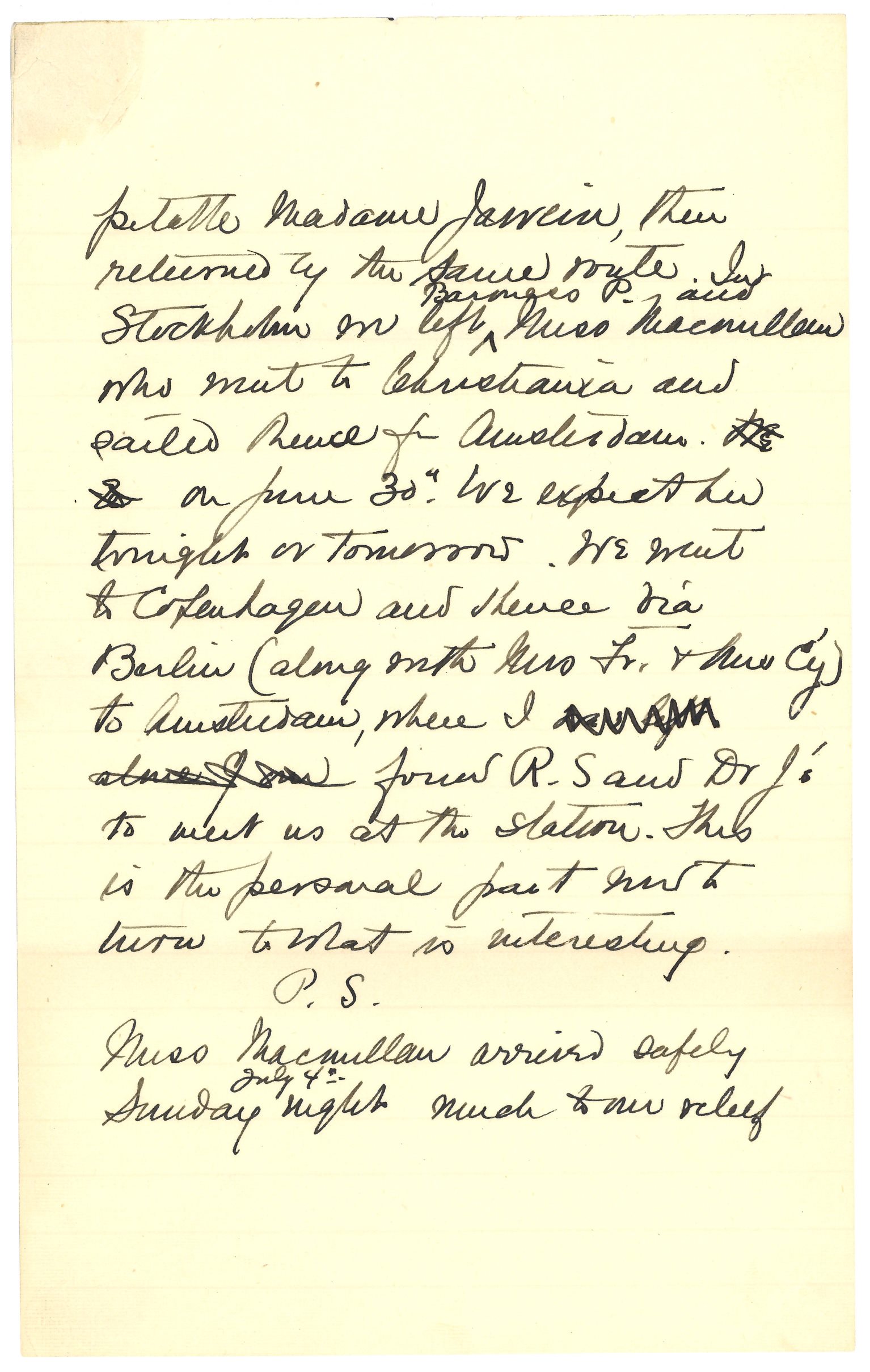 At Stockholm [Miss?] Baroness Pal Ellen Palmstierna was added to our party in place of R. S. The sea route being dangerous and in fact impossible we went <to Petrograd> round the Gulf of Bothnia by rail a journey of 3 days & 3 nights. We were in Petrograd hanging along for 2 weeks, staying with [illegible] hospitable [page 4] Madame Jawein, then returned by the same route. In Stockholm we left <Baroness P. and> Miss Macmillan who went to Christiania and sailed thence for Amsterdam [illegible words] on June 30th. We expect her tonight or tomorrow. We went to Copenhagen and thence via Berlin (along with Mrs Fr. & Mrs C'y) to Amsterdam, where I was left alone [illegible] forced R. S and Dr J's to meet us at the station. This is the personal part now to turn to what is interesting.