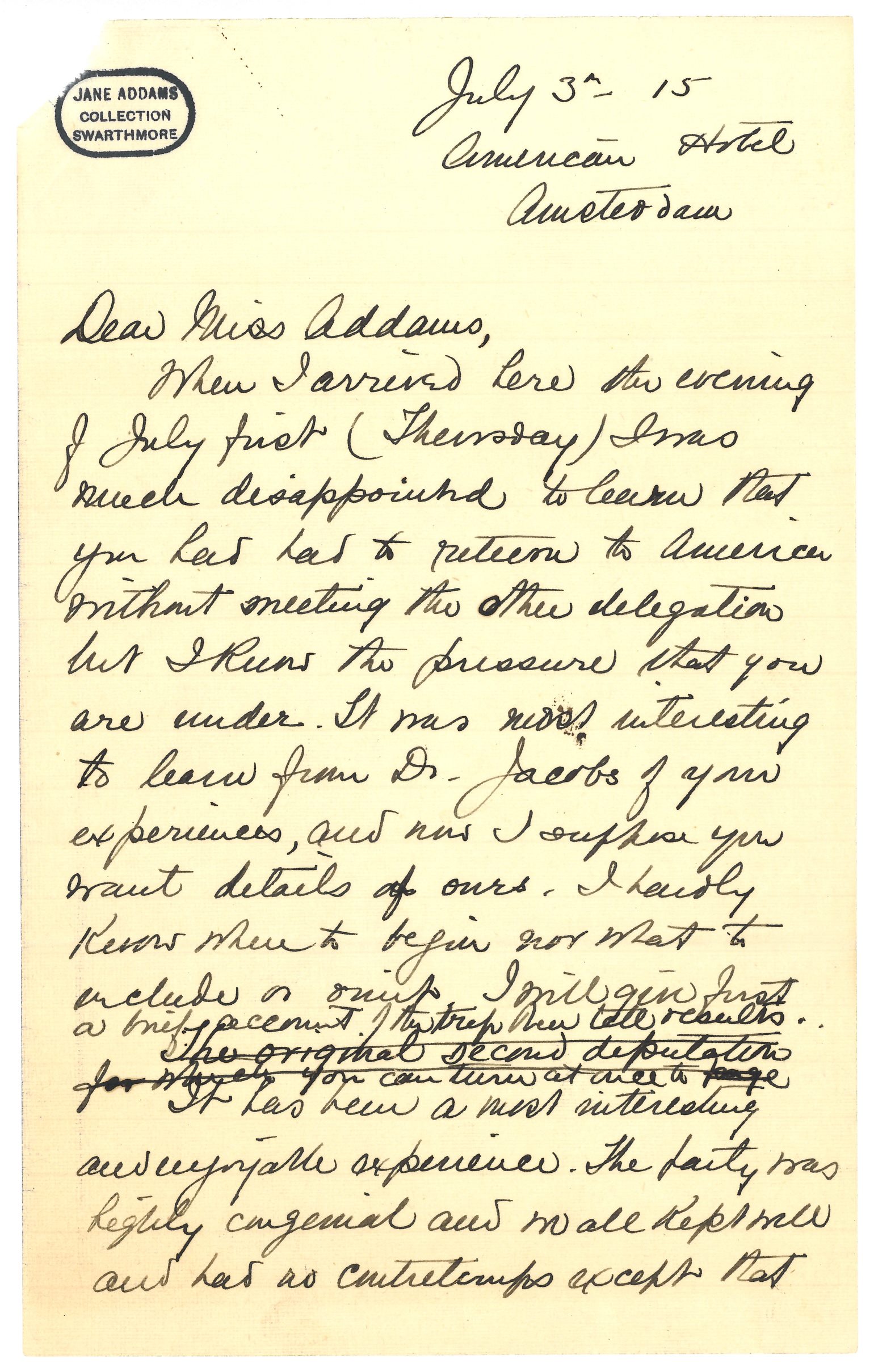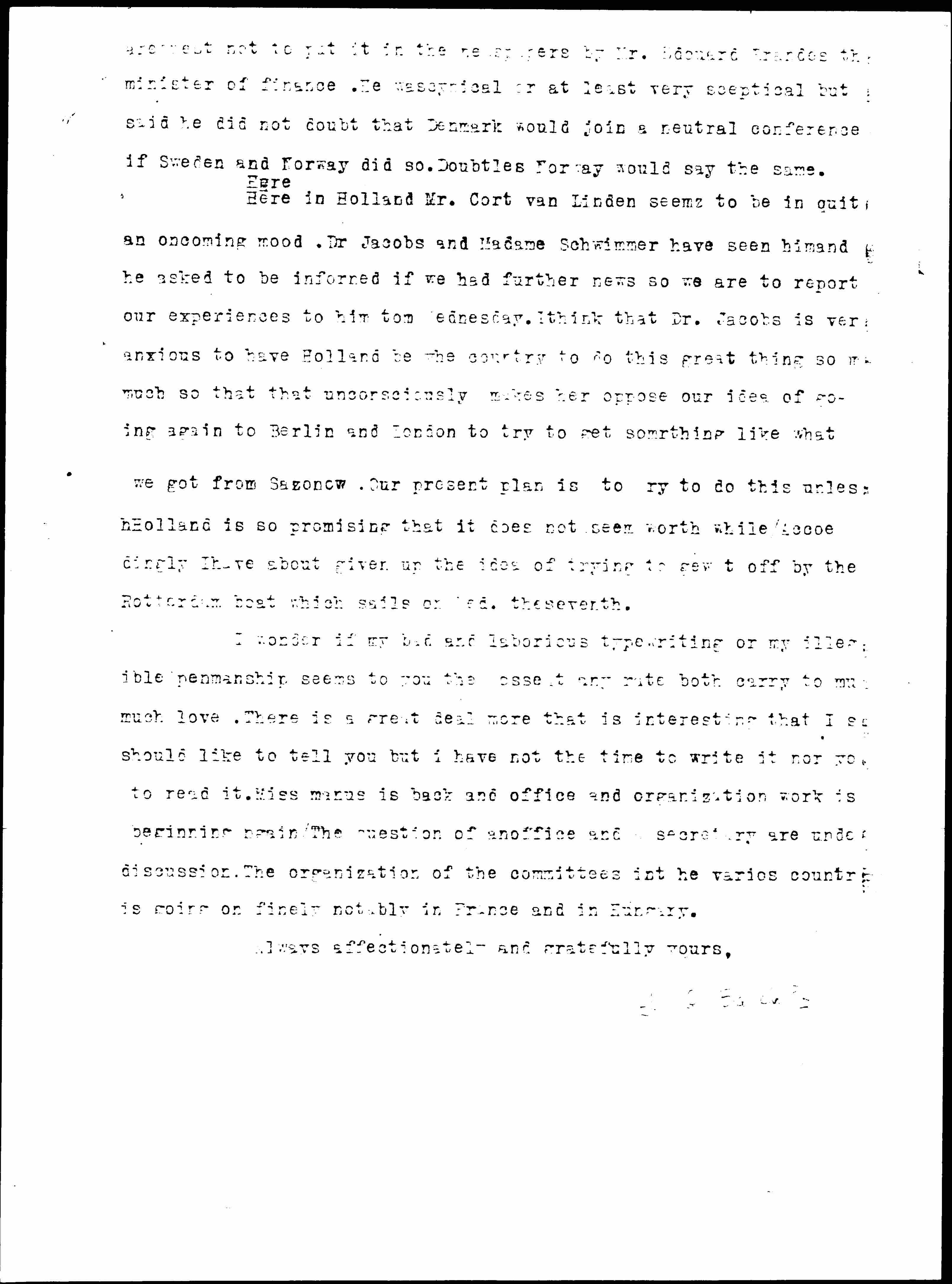 Here in Holland Mr. Cort van Linden [seems] to be in quite an oncoming mood. Dr Jacobs and Madame Schwimmer have seen him and he asked to be informed if we had further news so we are to report our experiences to him [on?] Wednesday. I think that Dr. Jacobs is very anxious to have Holland be the country to do this great thing so much so that that unconsciously makes her oppose our idea of going again to Berlin and London to try to get something like what we got from [Sazonov]. Our present plan is to [try] to do this unless Holland is so promising that it does not seem worth while. [Accordingly] I have about given up the idea of trying to [get?] off by the Rotterdam boat which sails on Wed. the seventh.