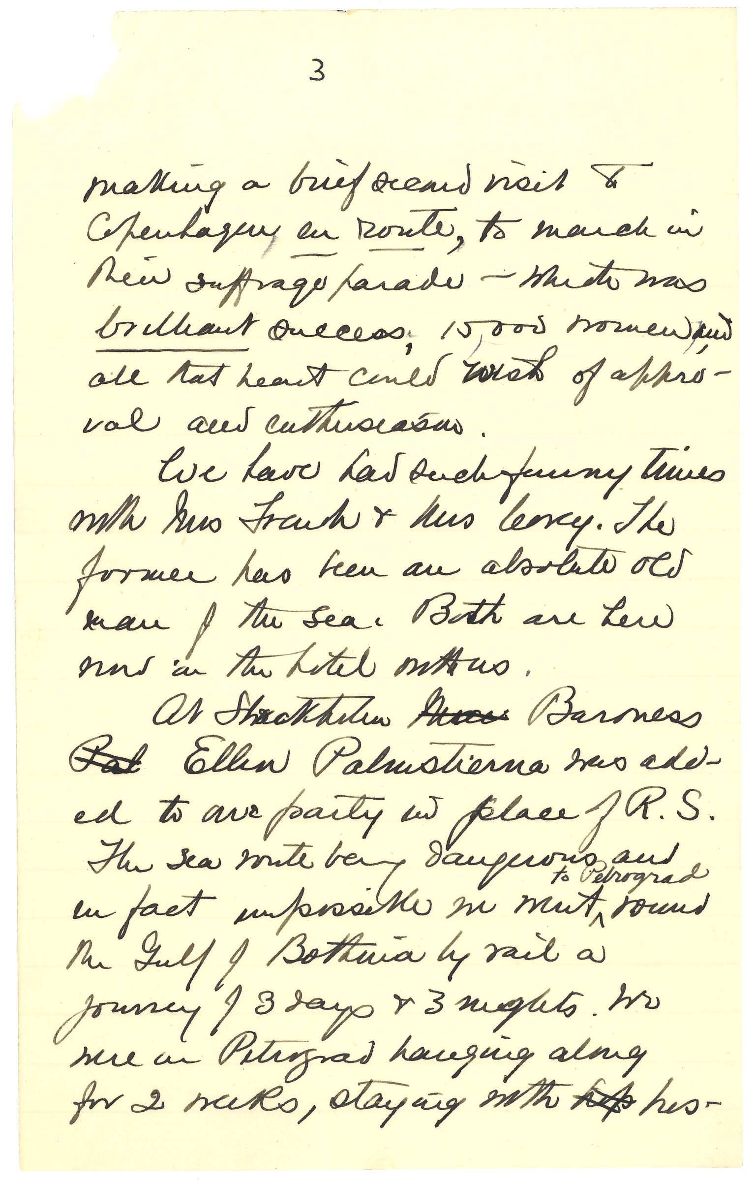 In Stockholm Madame Schwimmer left us returning to Berlin via Budapest through Berlin, and taking [page 3] making a brief second visit to Copenhagen en route, to march in their suffrage parade -- which was brilliant success; 15,000 women, and all that heart could wish of approval and enthusiasm.