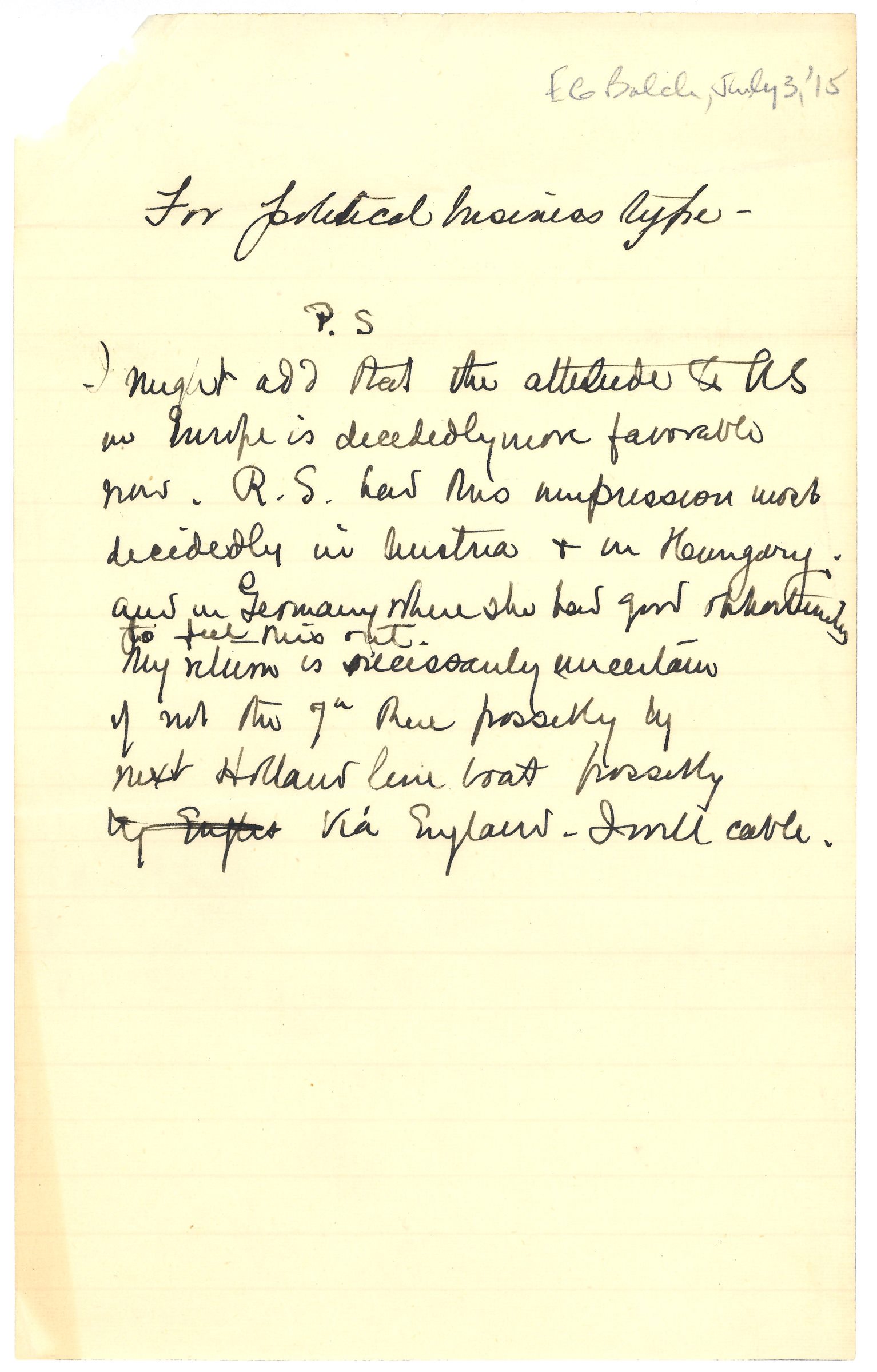 I might add that the attitude [to] US in Europe is decidedly more favorable now. R. S. had this impression most decidedly in Austria & in Hungary, and in Germany where she had good opportunity <to feel this out.> My return is necessarily uncertain if not the [7th] then possibly by next Holland line boat possibly by Englis via England. I will cable. [page 6]