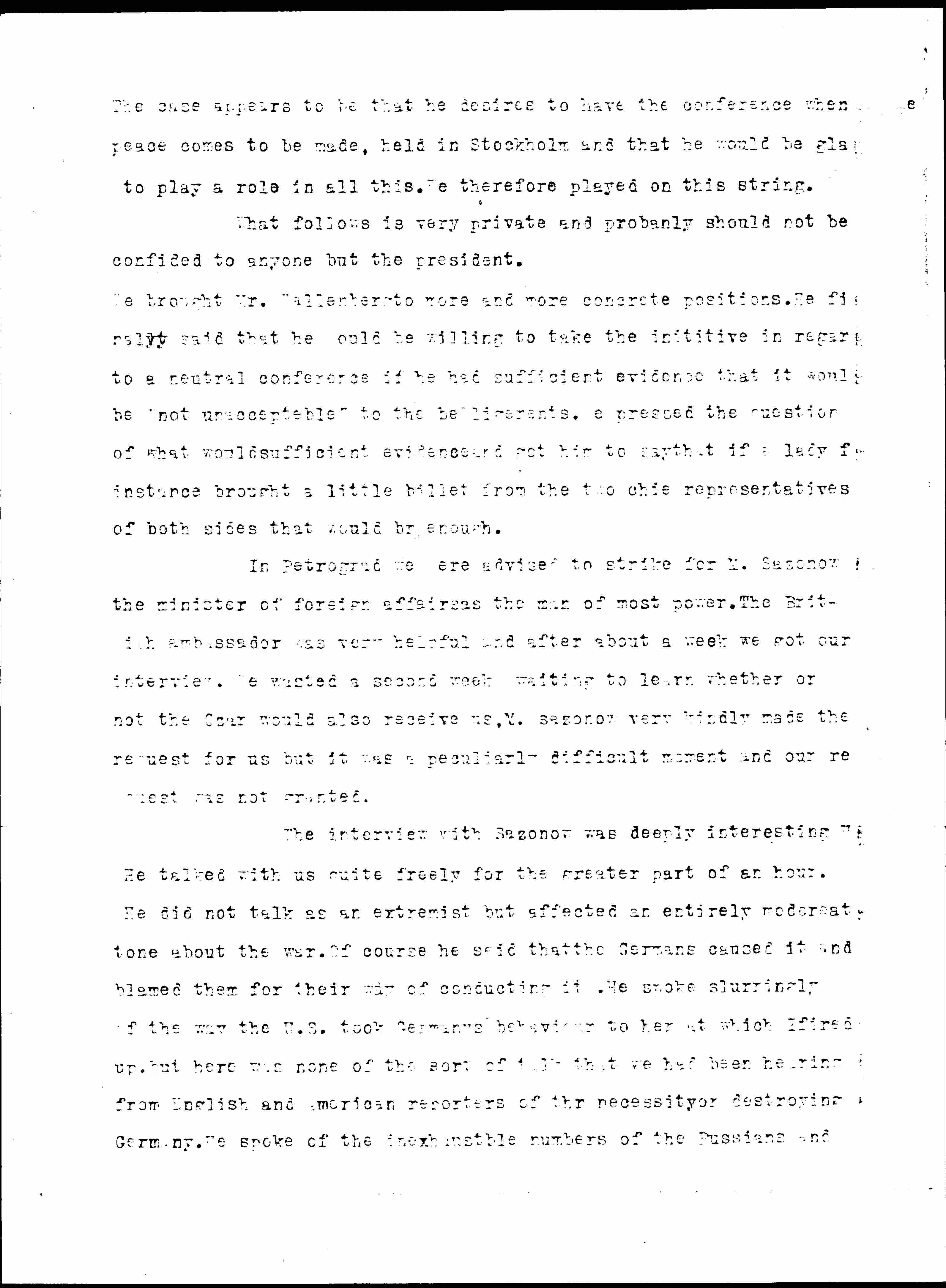 Returning to Stockholm we again saw Wallenberg and told him all this. He said now that he had said he [would] be willing to act if we brought evidence that the belligerents asked him to but on our stating our remembrance of [it] as given above I think he tacitly admitted our version. He seemed to think the attested transcript of a conversation such as we had brought adequate as to [form?] but he claimed that the clause as to not expecting any results as making it valueless. He asked us to come back and tell him if we had anything further to report. All this sounds more negative than the first interview perhaps but I think he was taking the whole thing even more seriously.