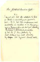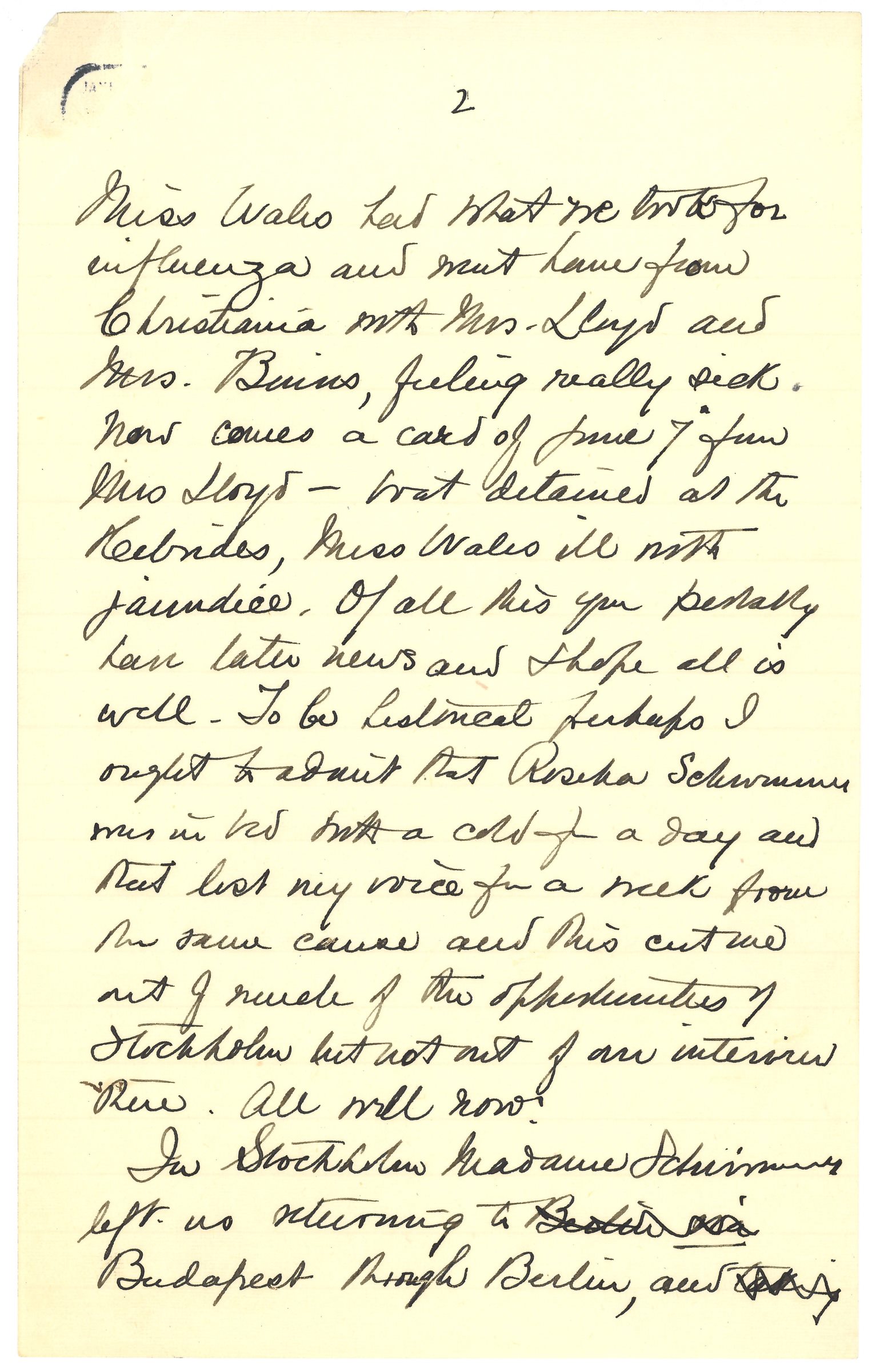 It has been a most interesting and enjoyable experience. The party was highly congenial and in all kept well and had no contretemps except that [page 2] Miss Wales had what we took for influenza and went home from Christiania with Mrs. Lloyd and Mrs. Binns, feeling really sick. Now comes a card of June 7 from Mrs Lloyd -- boat detained at the Hebrides, Miss Wales ill with jaundice. Of all this you probably have later news and I hope all is well. To be historical perhaps I ought to admit that Rosika Schwimmer was in bed with a cold for a day and that lost my voice for a week from the same cause and this cut me out of much of the opportunities of Stockholm but not out of our interview there. All well now.