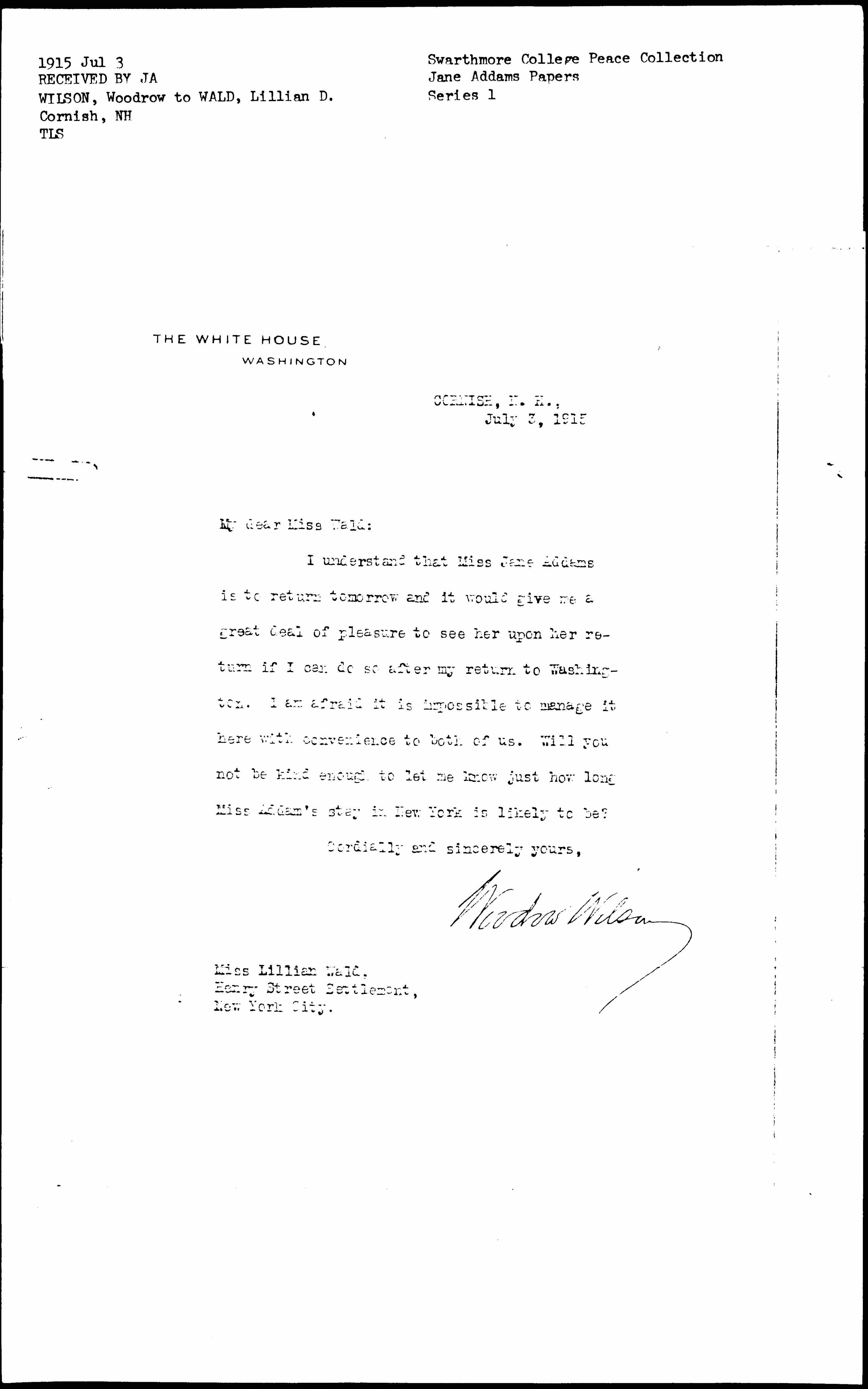 I understand that Miss Jane Addams is to return tomorrow and it would give me a great deal of pleasure to see her upon her return if I can do so after my return to Washington. I am afraid it is impossible to manage it here with convenience to both of us. Will you not be kind enough to let me know just how long Miss Addams' stay in New York is likely to be?