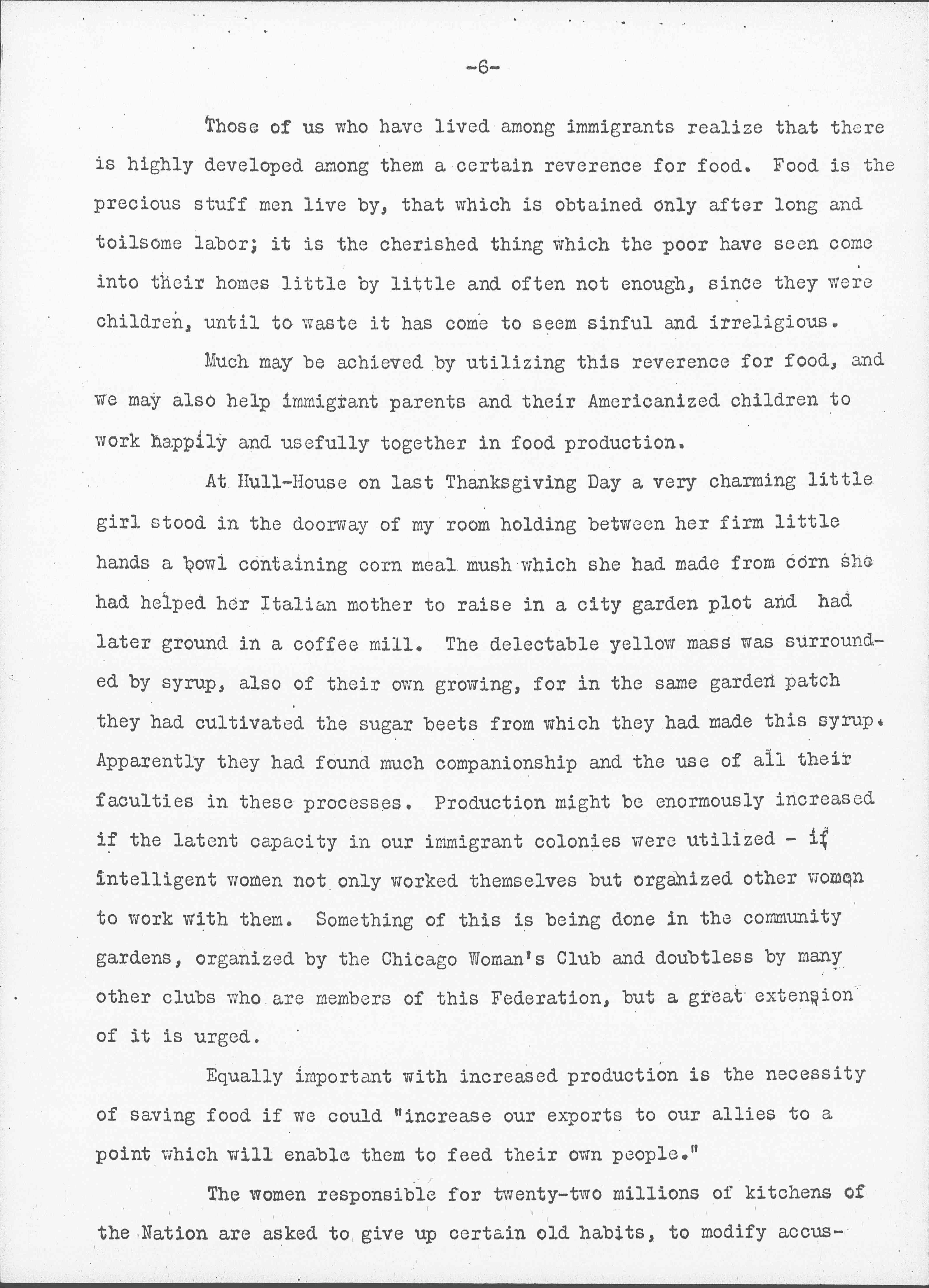 At Hull-House on last Thanksgiving Day a very charming little girl stood in the doorway of my room holding between her firm little hands a bowl containing corn meal mush which she had made from corn she had helped her Italian mother to raise in a city garden plot and had later ground in a coffee mill. The detectable yellow mass was surrounded by syrup, also of their own growing, for in the same garden patch they had cultivated the sugar beets from which they had made this syrup. Apparently they had found much companionship and the use of all their faculties in these processes. Production might be enormously increased if the latent capacity in our immigrant colonies were utilized -- if intelligent women not only worked themselves but organized other women to work with them. Something of this is being done in the community gardens, organized by the Chicago Woman's Club and doubtless by many other clubs who are members of this Federation, but a great extension of it is urged.