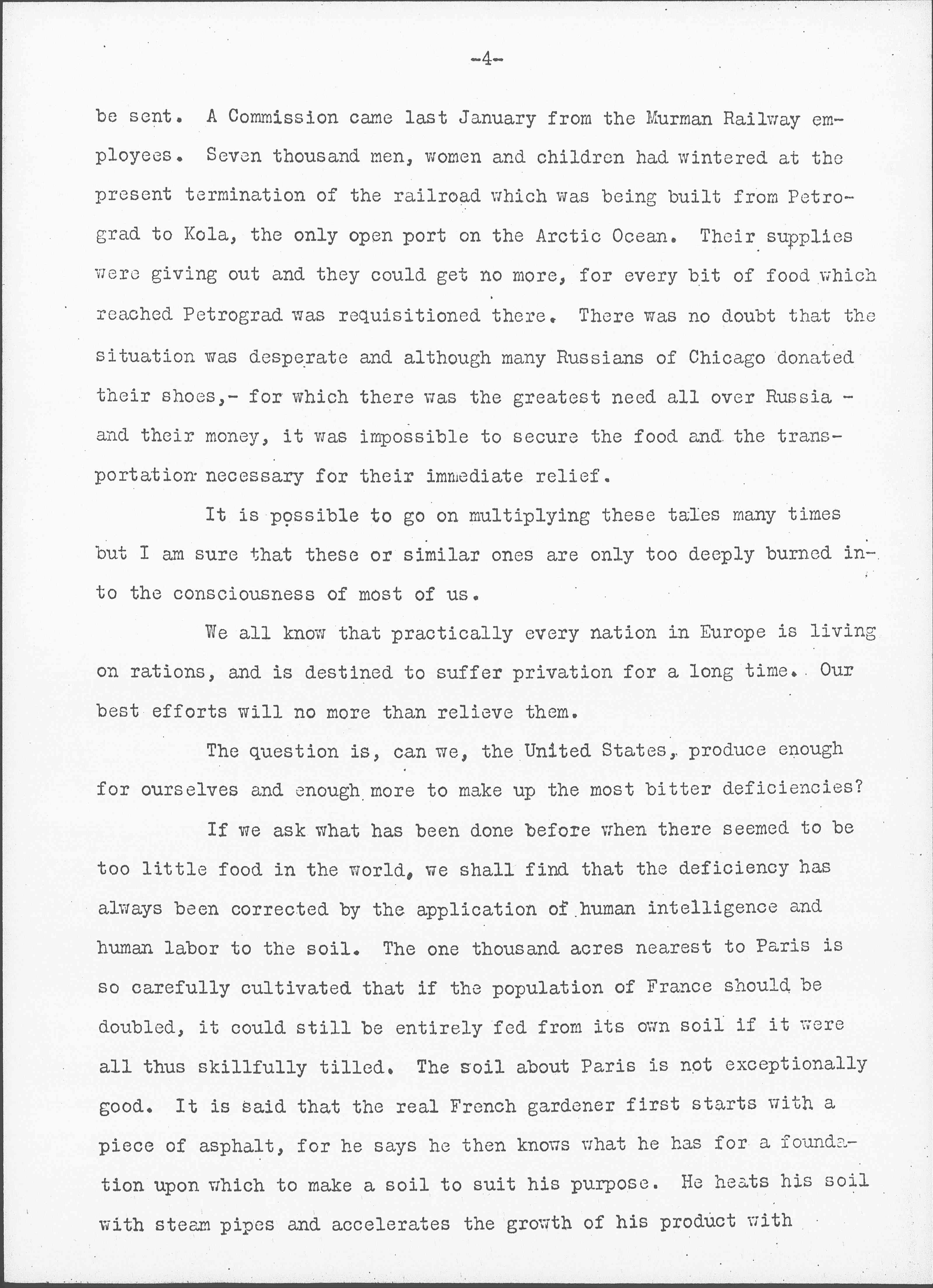 In addition Russia is suffering from a complete disorganization of her transportation facilities, so that whatever grain there may be in the South cannot possibly be shipped to Petrograd or Finland. There is something very touching in the belief revealed form time to time that if the situation could but be clearly stated in America, food would at once [page 4] be sent. A Commission came last January from the Murman Railway employees. Seven thousand men, women and children had wintered at the present termination of the railroad which was being built from Petrograd to Kola, the only open port on the Arctic Ocean. Their supplies were giving out and they could get no more, for every bit of food which reached Petrograd was requisitioned there. There was no doubt that the situation was desperate and although many Russians of Chicago donated their shoes, -- for which there was the greatest need all over Russia -- and their money, it was impossible to secure the food and the transportation necessary for their immediate relief.