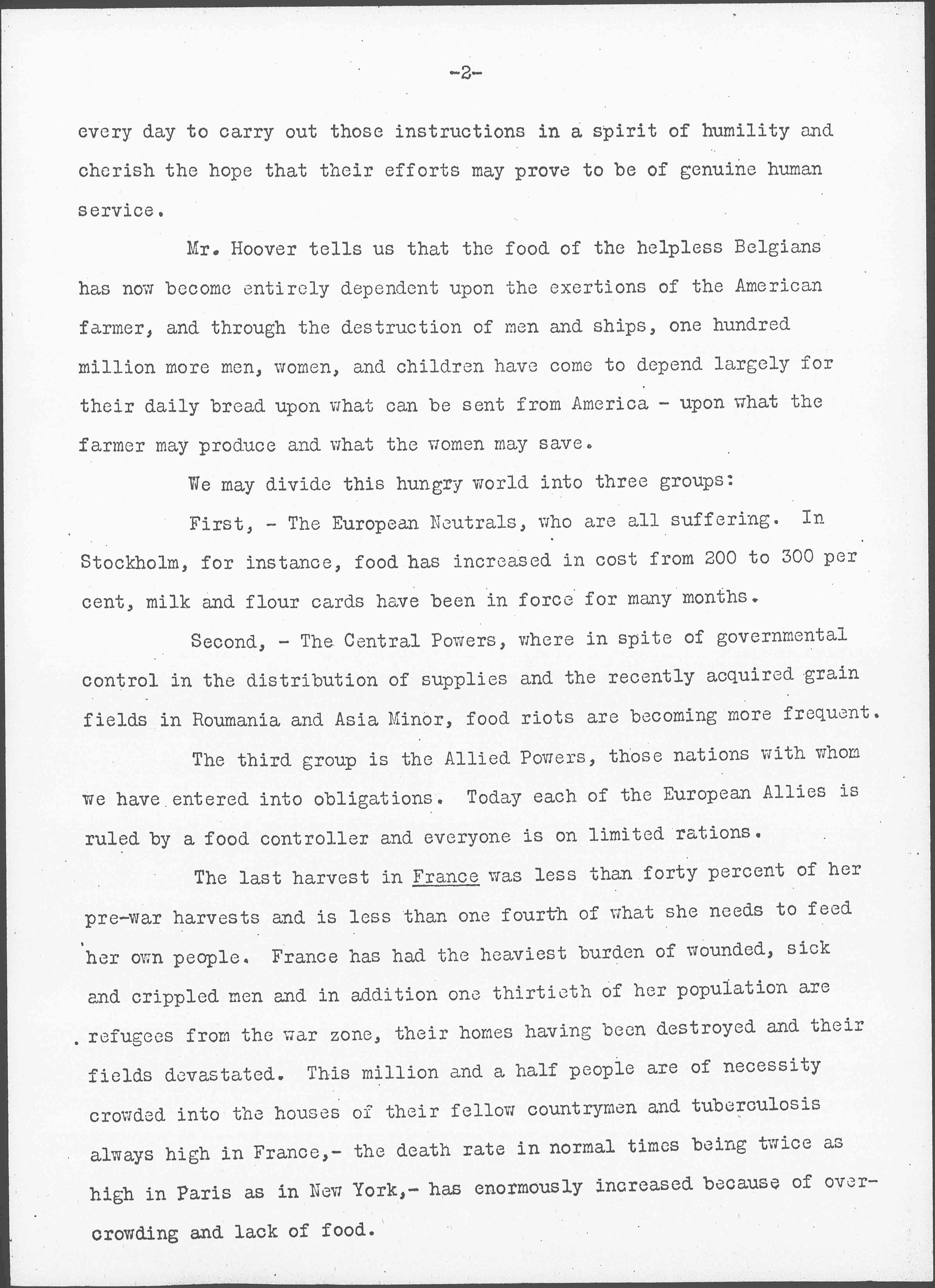 The last harvest in France was less than forty percent of her pre-war harvests and is less than one fourth of what she needs to feed her own people. France has had the heaviest burden of wounded, sick and crippled men and in addition one thirtieth of her population are refugees from the war zone, their homes having been destroyed and their fields devastated. This million and a half people are of necessity crowded into the houses of their fellow countrymen and tuberculosis always high in France, -- the death rate in normal times being twice as high in Paris as in New York, -- has enormously increased because of overcrowding and lack of food. [page 3]