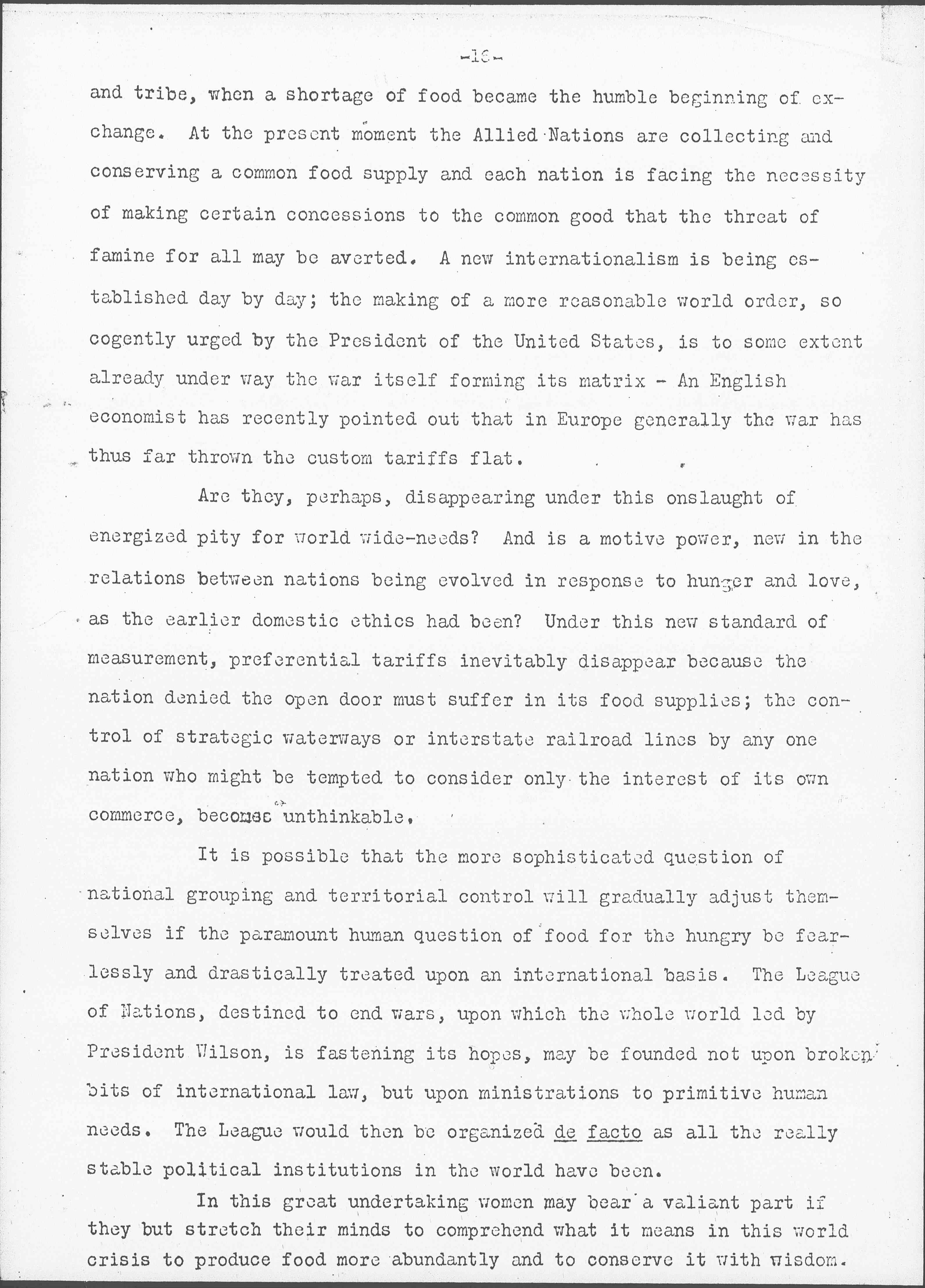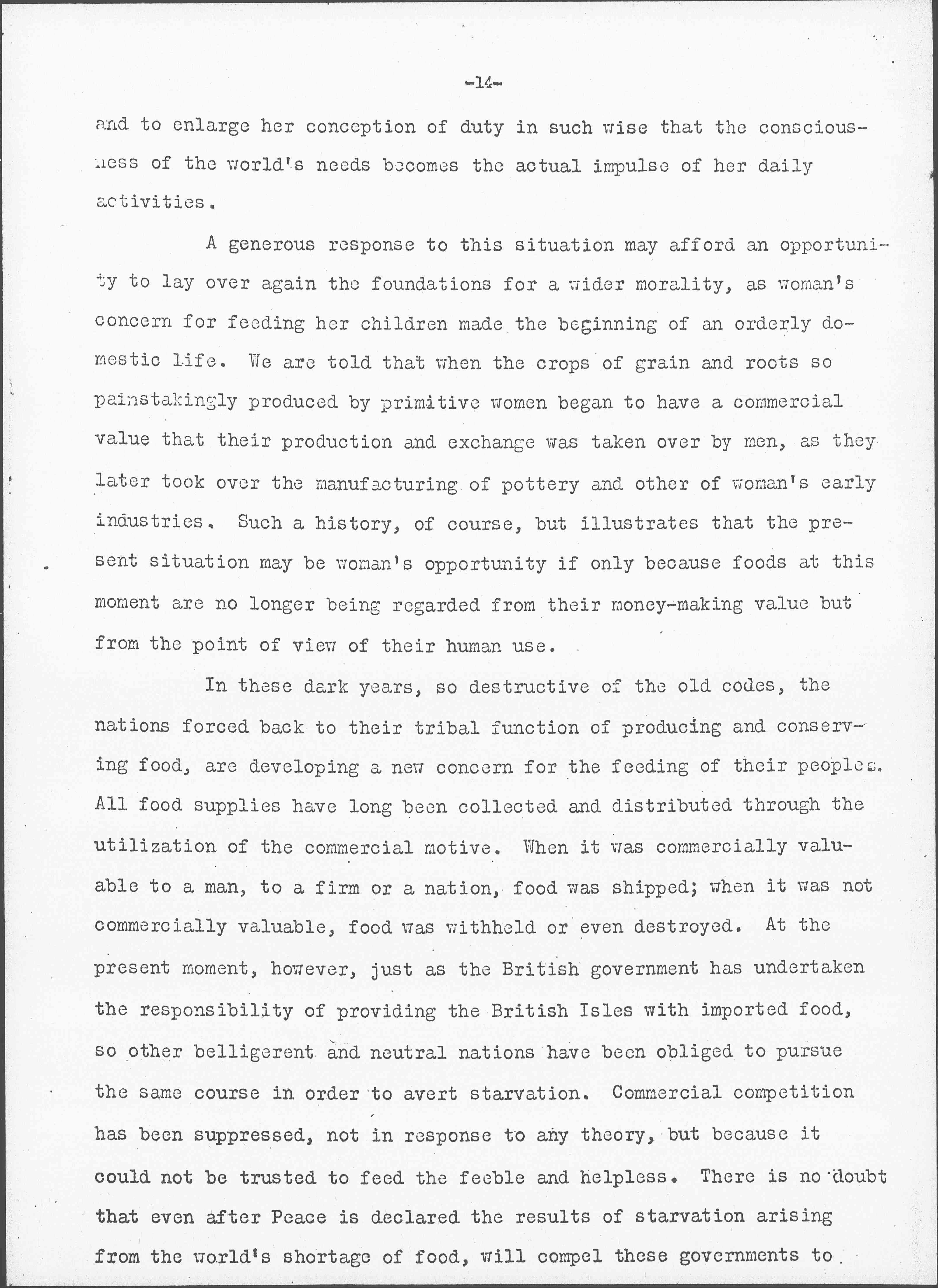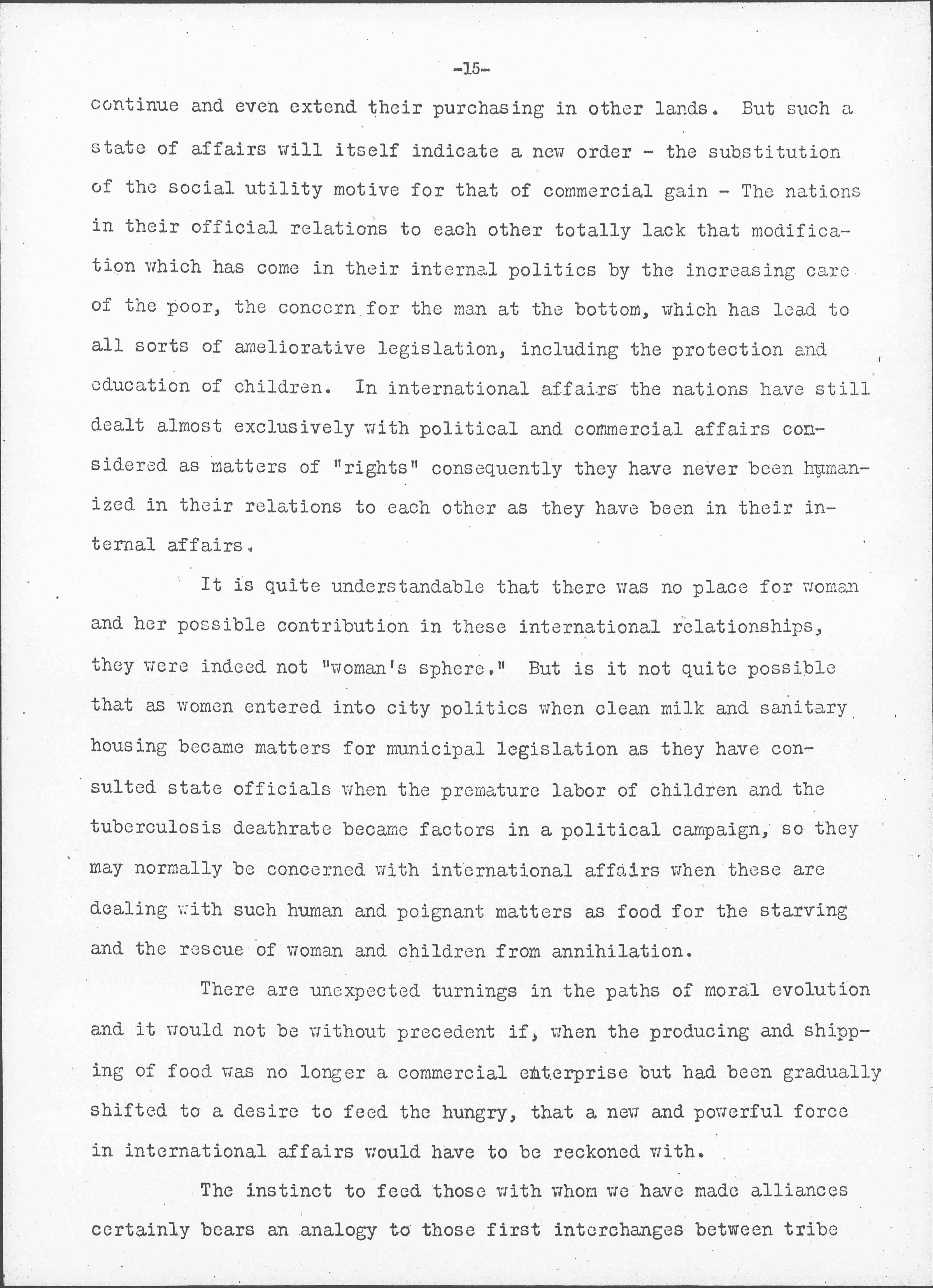 In these dark years, so destructive of the old codes, the nations forced back to their tribal function of producing and conserving food, are developing a new concern for the feeding of their peoples. All food supplies have long been collected and distributed through the utilization of the commercial motive. When it was commercially valuable to a man, to a firm or a nation, food was shipped; when it was not commercially valuable, food was upheld or even destroyed. At the present moment, however, just as the British government has undertaken the responsibility of providing the British Isles with imported food, so other belligerent and neutral nations have been obliged to pursue the same course in order to avert starvation. Commercial competition has been suppressed, not in response to any theory, but because it could not be trusted to feed the feeble and helpless. There is no doubt that even after Peace is declared the results of starvation arising from the world's shortage of food, will compel these governments to [page 15] continue and even extend their purchasing in other lands. But such a state of affairs will itself indicate a new order -- the substitution of the social utility motive for that of commercial gain -- The nations in their official relations to each other totally lack that modification which has come in their internal politics by the increasing care of the poor, the concern for the man at the bottom, which has [led] to all sorts of ameliorative legislation, including the protection and education of children. In international affairs the nations have still dealt almost exclusively with political and commercial affairs considered as matters of "rights" consequently they have never been humanized in their relations to each other as they have been in their internal affairs.
