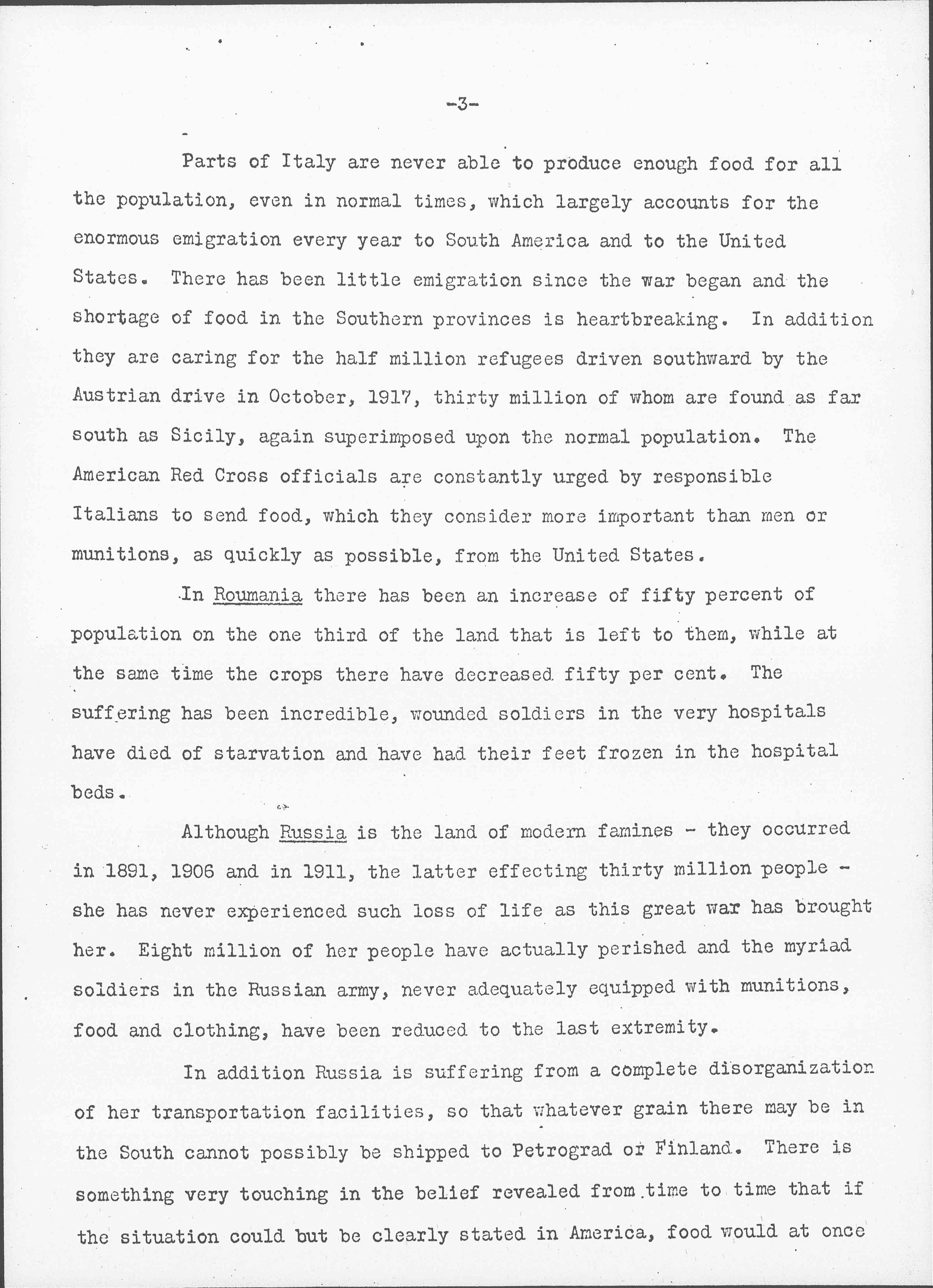 In [Romania] there has been an increase of fifty percent of population on the one third of the land that is left to them, while at the same time the crops there have decreased fifty [percent]. The suffering has been incredible, wounded soldiers in the very hospitals have died of starvation and have had their feet frozen in the hospital beds.