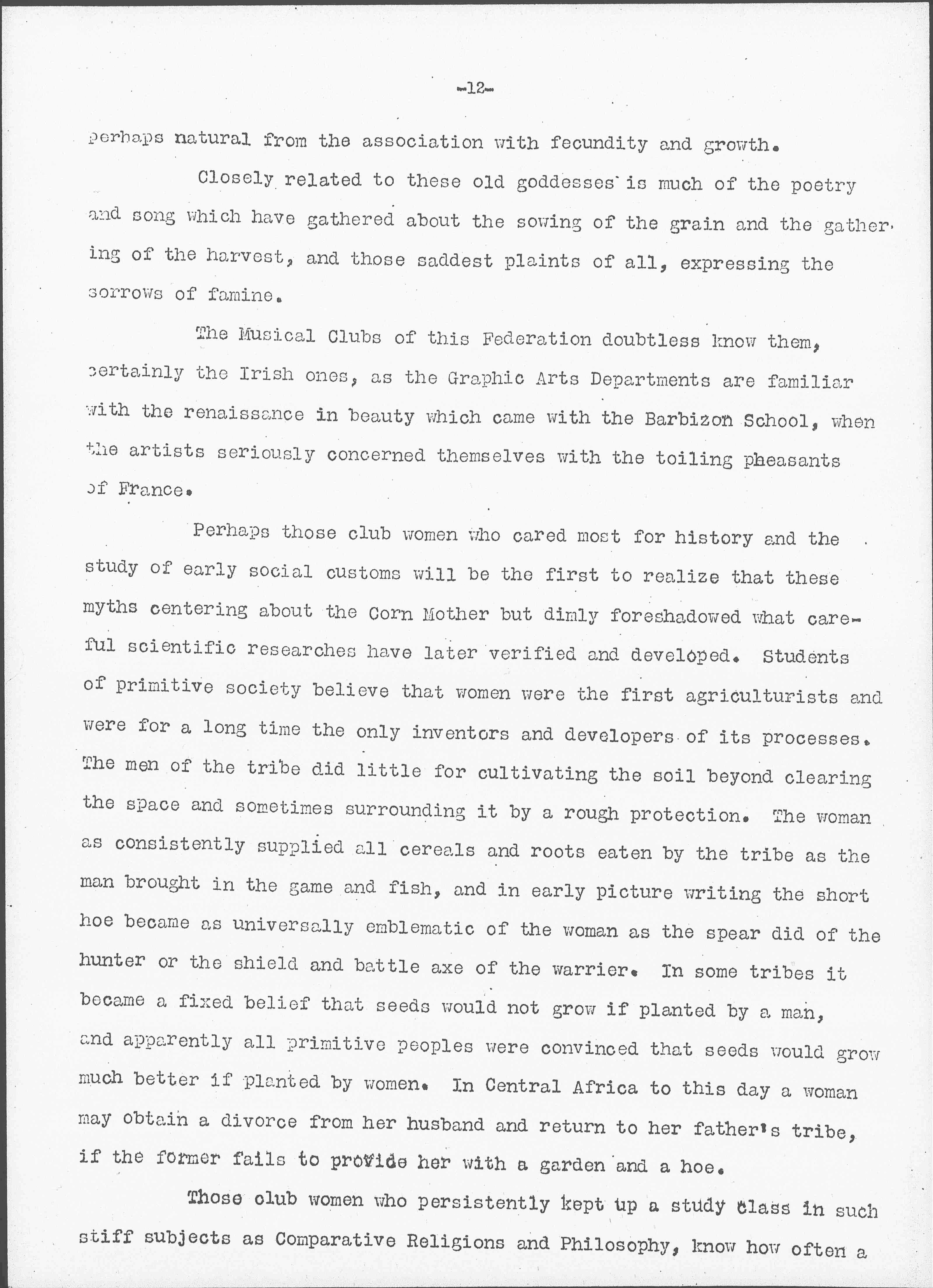 Perhaps those club women who cared most for history and the study of early social customs will be the first to realize that these myths centering about the Corn Mother but dimly foreshadowed what careful scientific researches have later verified and developed. Students of primitive society believe that women were the first agriculturists and were for a long time the only inventors and developers of its processes. The men of the tribe did little for cultivating the soil beyond clearing the space and sometimes surrounding it by a rough protection. The woman as consistently supplied all cereals and roots eaten by the tribe as the man brought in the game and fish, and in early picture writing the short hoe became as universally emblematic of the woman as the spear did of the hunter or the shield and battle axe of the [warrior]. In some tribes it became a fixed belief that seeds would not grow if planted by a man, and apparently all primitive peoples were convinced that seeds would grow much better if planted by women. In Central Africa to this day a woman may obtain a divorce from her husband and return to her father's tribe, if the former fails to provide her with a garden and a hoe.