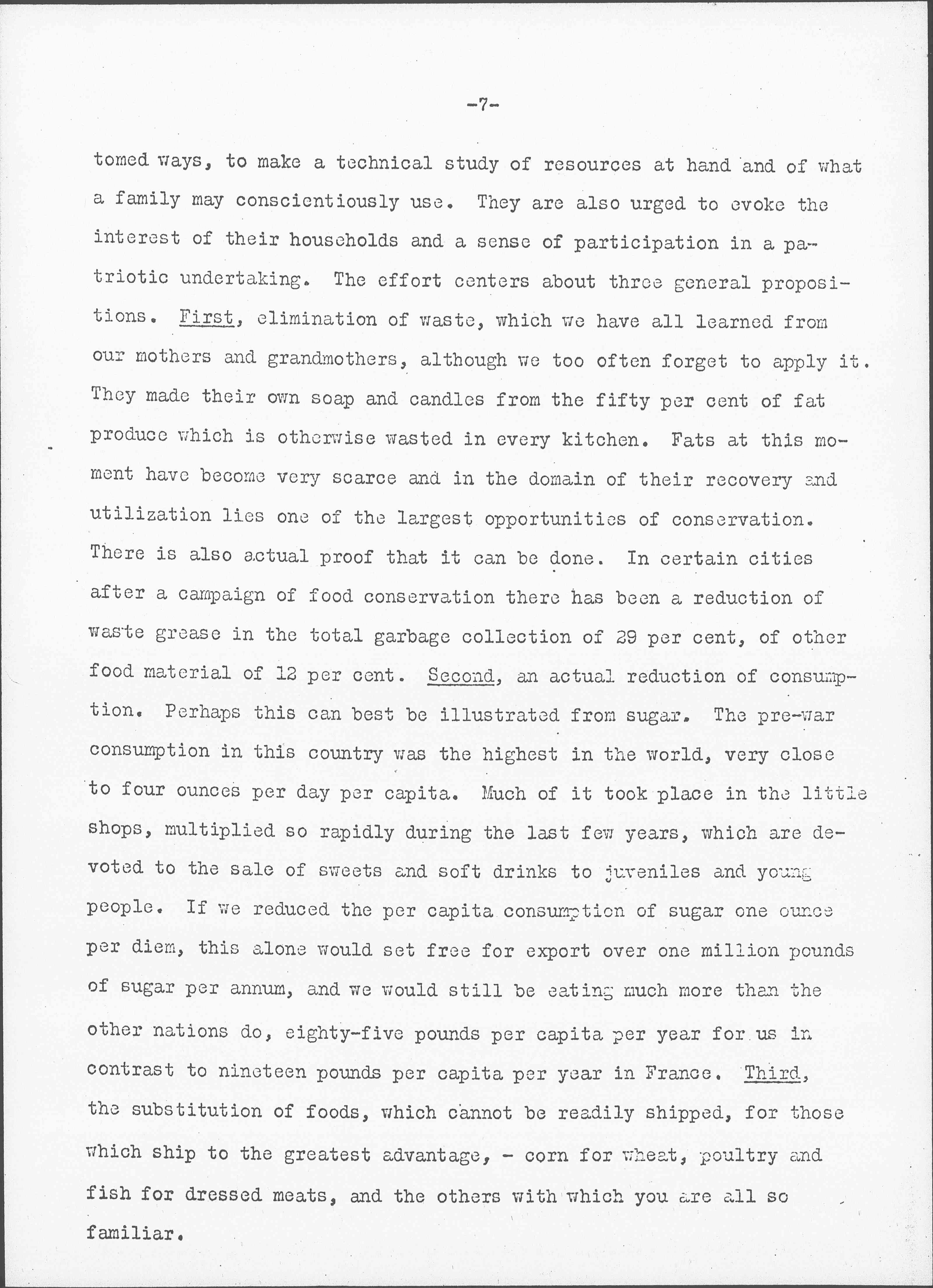 The women responsible for twenty-two millions of kitchens of the Nation are asked to give up certain old habits, to modify accustomed [page 7] ways, to make a technical study of resources at hand and of what a family may conscientiously use. They are also urged to evoke the interest of their households and a sense of participation in a patriotic undertaking. The effort centers about three general propositions. First, elimination of waste, which we have all learned from our mothers and grandmothers, although we too often forget to apply it. They made their own soap and candles from the fifty [percent] of fat produce which is otherwise wasted in every kitchen. Fats at this moment have become very scarce and in the domain of their recovery and utilization lies one of the largest opportunities of conservation. There is also actual proof that it can be done. In certain cities after a campaign of food conservation there has been a reduction of waste grease in total garbage collection of 29 [percent], of other food material of 12 [percent]. Second, an actual reduction of consumption. Perhaps this can best be illustrated from sugar. The pre-war consumption in this country was the highest in the world, very close to four ounces per day per capita. Much of it took place in the little shops, multiplied so rapidly during the last few years, which are devoted to the sale of sweets and soft drinks to juveniles and young people. If we reduced the per capita consumption of sugar one ounce per diem, this alone would set free for export over one million pounds of sugar per annum, and we would still be eating much more than the other nations do, eighty-five pounds per capita per year for us in contrast to nineteen pounds per capita per year in France. Third, the substitution of foods, which cannot be readily shipped, for those which ship to the greatest advantage, -- corn for wheat, poultry and fish for dressed meats, and the others with which you are all so familiar. [page 8]