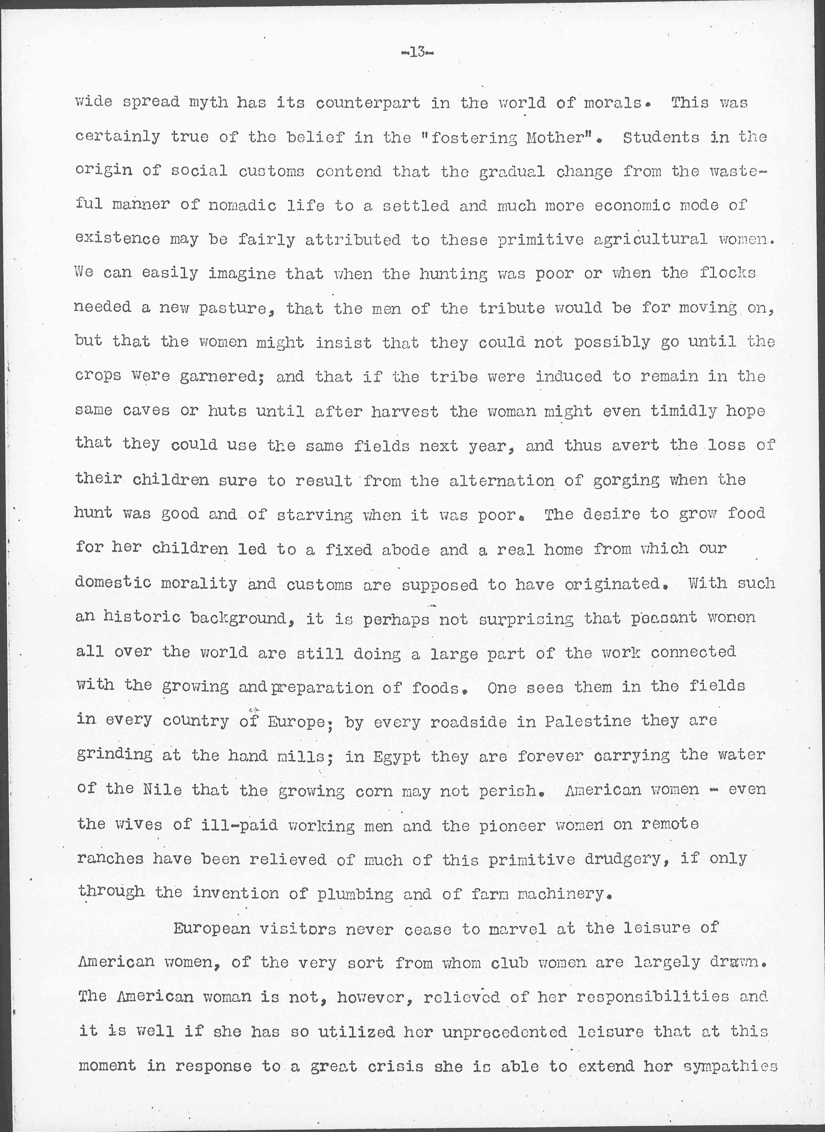 Those club women who persistently kept up a study class in such stiff subjects as Comparative Religions and Philosophy, know how often a [page 13] wide spread myth has its counterpart in the world of morals. This was certainly true of the belief in the "fostering Mother". Students in the origin of social customs contend that the gradual change from the wasteful manner of nomadic life to a settled and much more economic mode of existence may be fairly attributed to these primitive agricultural women. We can easily imagine that when the hunting was poor or when the flocks needed a new pasture, that the men of the [tribe] would be for moving on, but that the women might insist that they could not possibly go until the crops were garnered; and that if the tribe were induced to remain in the same caves or huts until after harvest the woman might even timidly hope that they could use the same fields next year, and thus avert the loss of their children sure to result from the alternation of gorging when the hunt was good and of starving when it was poor. The desire to grow food for her children led to a fixed abode and a real home from which our domestic morality and customs are supposed to have originated. With such an historic background, it is perhaps not surprising that peasant women all over the world are still doing a large part of the work connected with the growing and preparation of foods. One sees them in the fields in every country of Europe; by every roadside in Palestine they are grinding at the hand mills; in Egypt they are forever carrying the water of the Nile that the growing corn may not perish. American women -- even the wives of ill-paid working men and the pioneer women on remote ranches have been relieved of much of this primitive drudgery, if only through the invention of plumbing and of farm machinery.