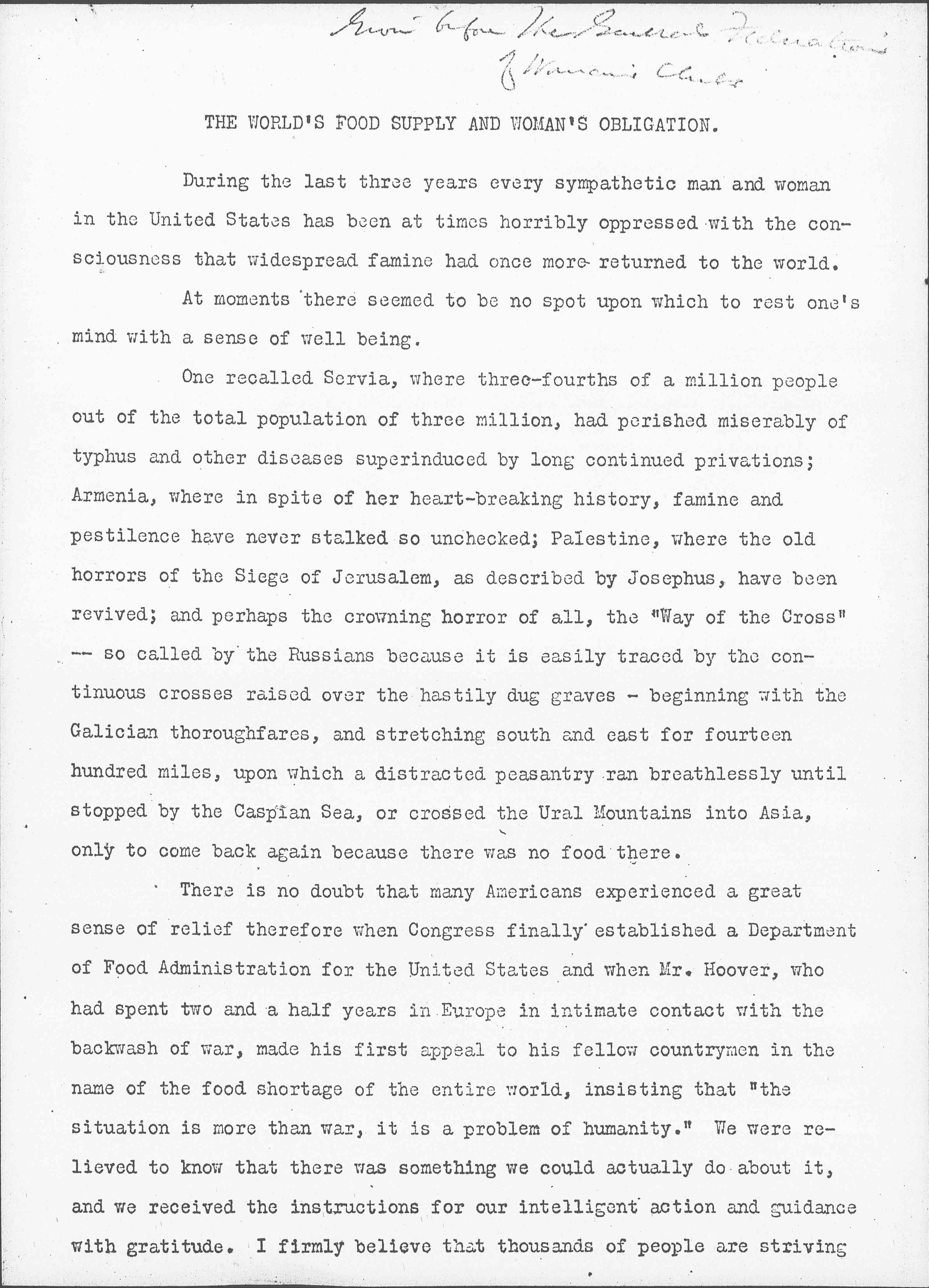 There is no doubt that many Americans experienced a great sense of relief therefore when Congress finally established a Department of Food Administration for the United States and when Mr. Hoover, who had spent two and a half years in Europe in intimate contact with the backwash of war, made his first appeal to his fellow countrymen in the name of the food shortage of the entire world, insisting that "the situation is more than war, it is a problem of humanity." We were relieved to know that there was something we could actually do about it, and we received the instructions for our intelligent action and guidance with gratitude. I firmly believe that thousands of people are striving [page 2] every day to carry out those instructions in a spirit of humility and cherish the hope that their efforts may prove to be of genuine human service.