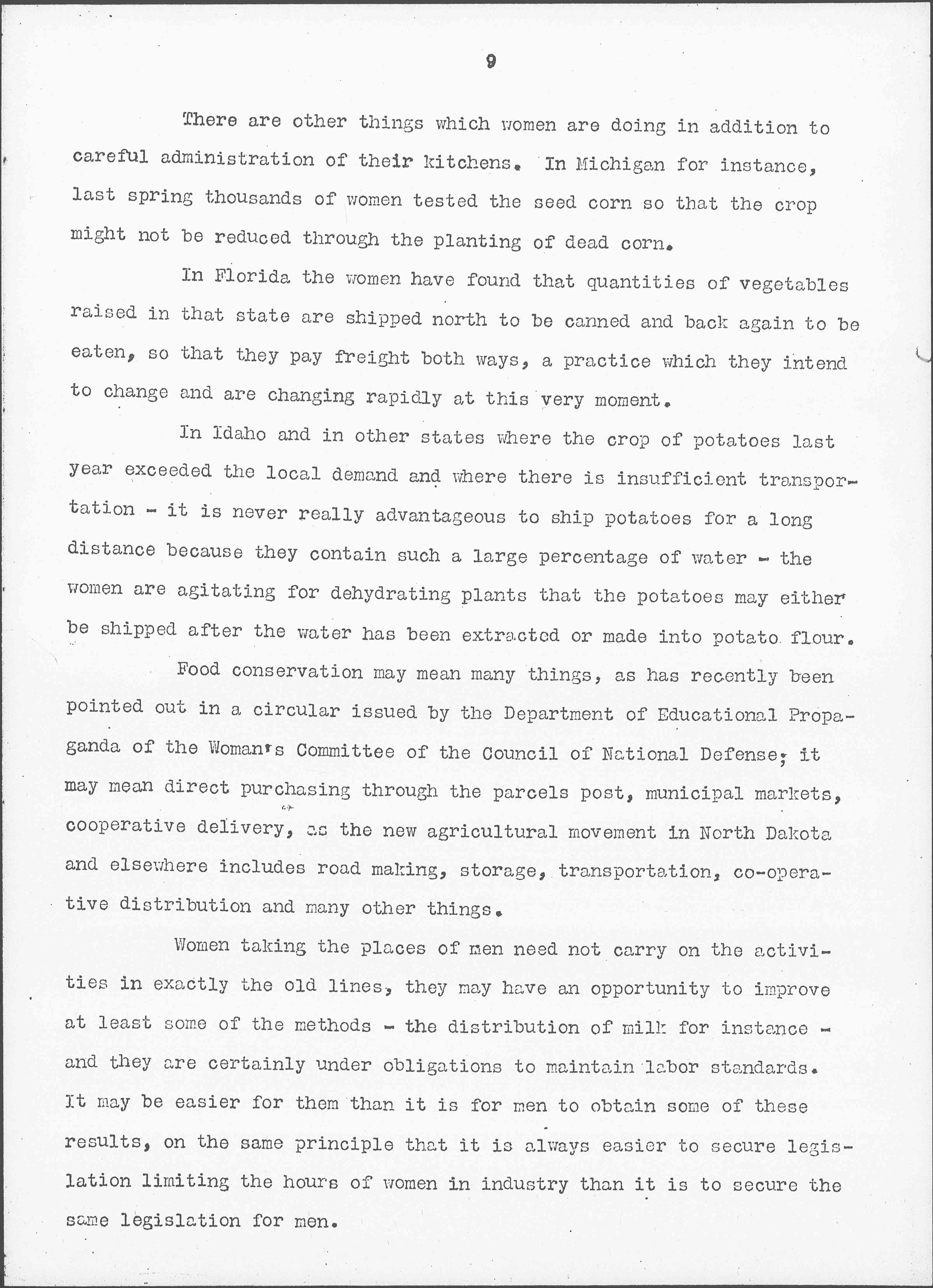 Women taking the places of men need not carry on the activities in exactly the old lines, they may have an opportunity to improve at least some of the methods -- the distribution of milk for instance -- and they are certainly under obligations to maintain labor standards. It may be easier for them than it is for men to obtain some of these results, on the same principle that it is always easier to secure legislation limiting the hours of women in industry than it is to secure the same legislation for men. [page 10]