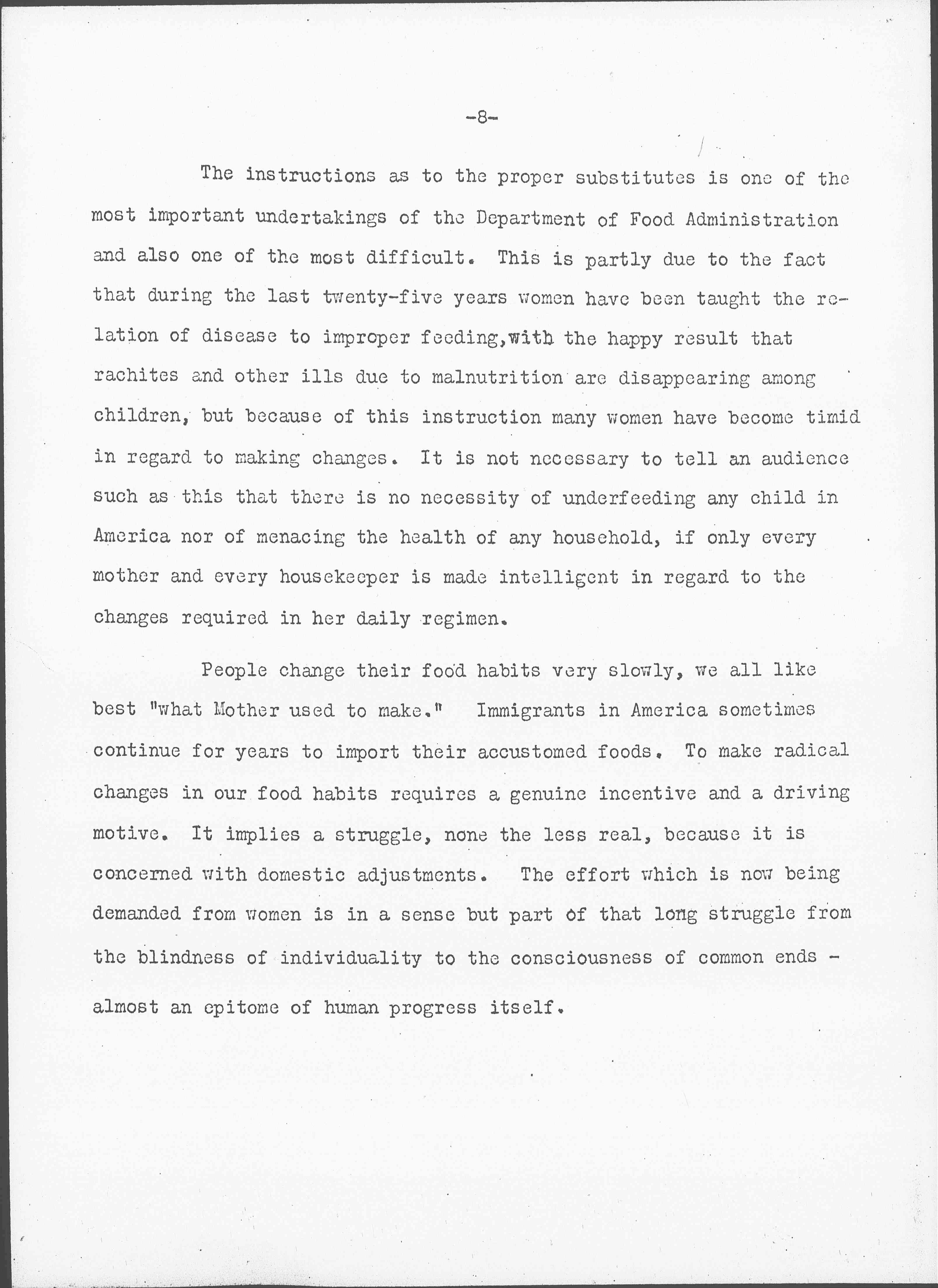 The instructions as to the proper substitutes is one of the most important undertakings of the Department of Food Administration and also one of the most difficult. This is partly due to the fact that during the last twenty-five years women have been taught the relation of disease to improper feeding, with the happy result that [rickets] and other ills due to malnutrition are disappearing among children, but because of this instruction many women have become timid in regard to making changes. it is not necessary to tell an audience such as this that there is no necessity of underfeeding any child in America nor of menacing the health of any household, if only every mother and every housekeeper is made intelligent in regard to the changes required in her daily regimen.