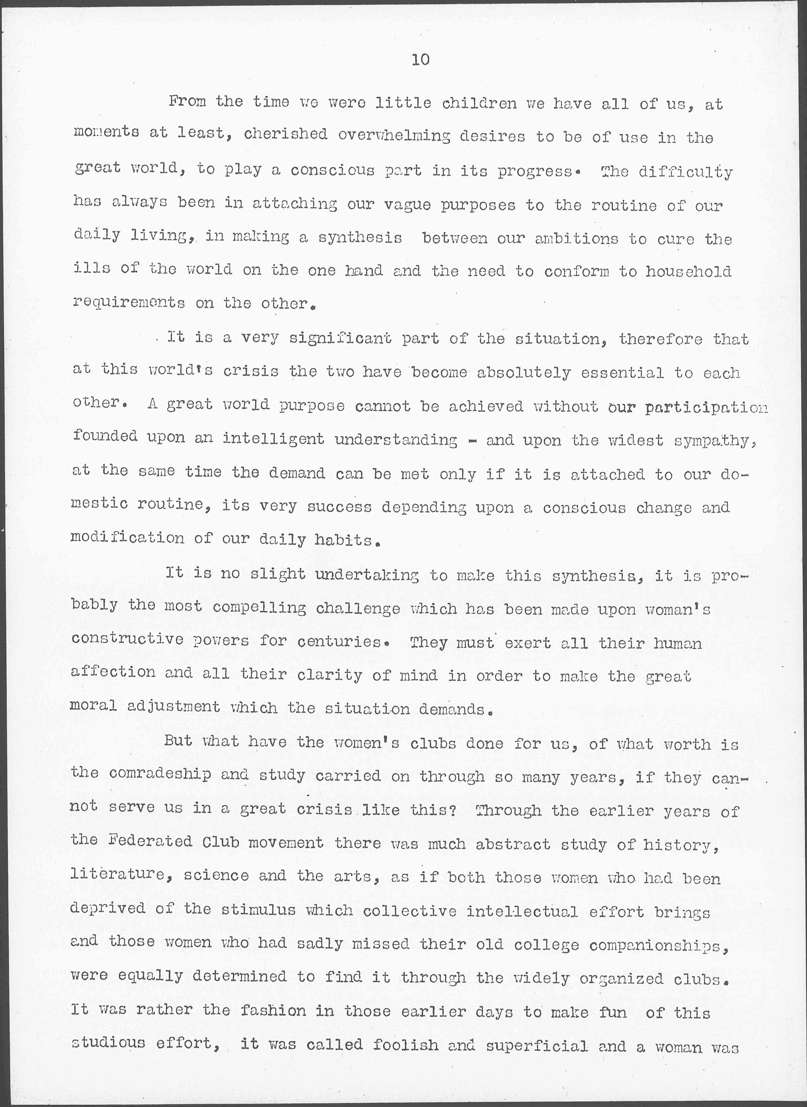 It is no slight undertaking to make this synthesis, it is probably the most compelling challenge which has been made upon woman's constructive powers for centuries. They must exert all their human affection and all their clarity of mind in order to make the great moral adjustment which the situation demands.