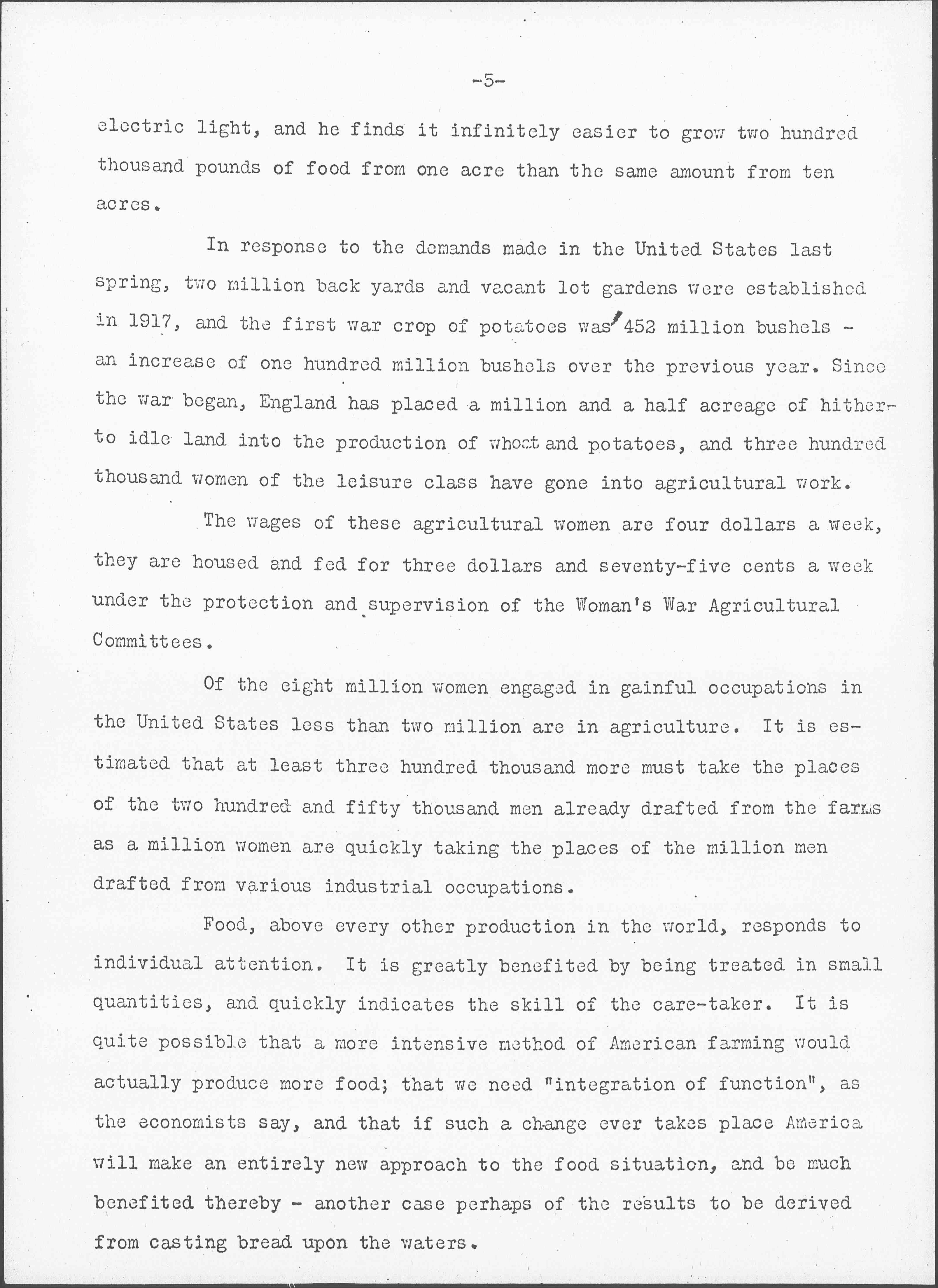 Food, above every other production in the world, responds to individual attention. It is greatly benefited by being treated in small quantities, and quickly indicates the skill of the care-taker. It is quite possible that a more intensive method of American farming would actually produce more food; that we need "integration of function", as the economists say, and that if such a change ever takes place America will make an entirely new approach to the food situation, and be much benefited thereby -- another case perhaps of the results to be derived from casting bread upon the waters. [page 6]