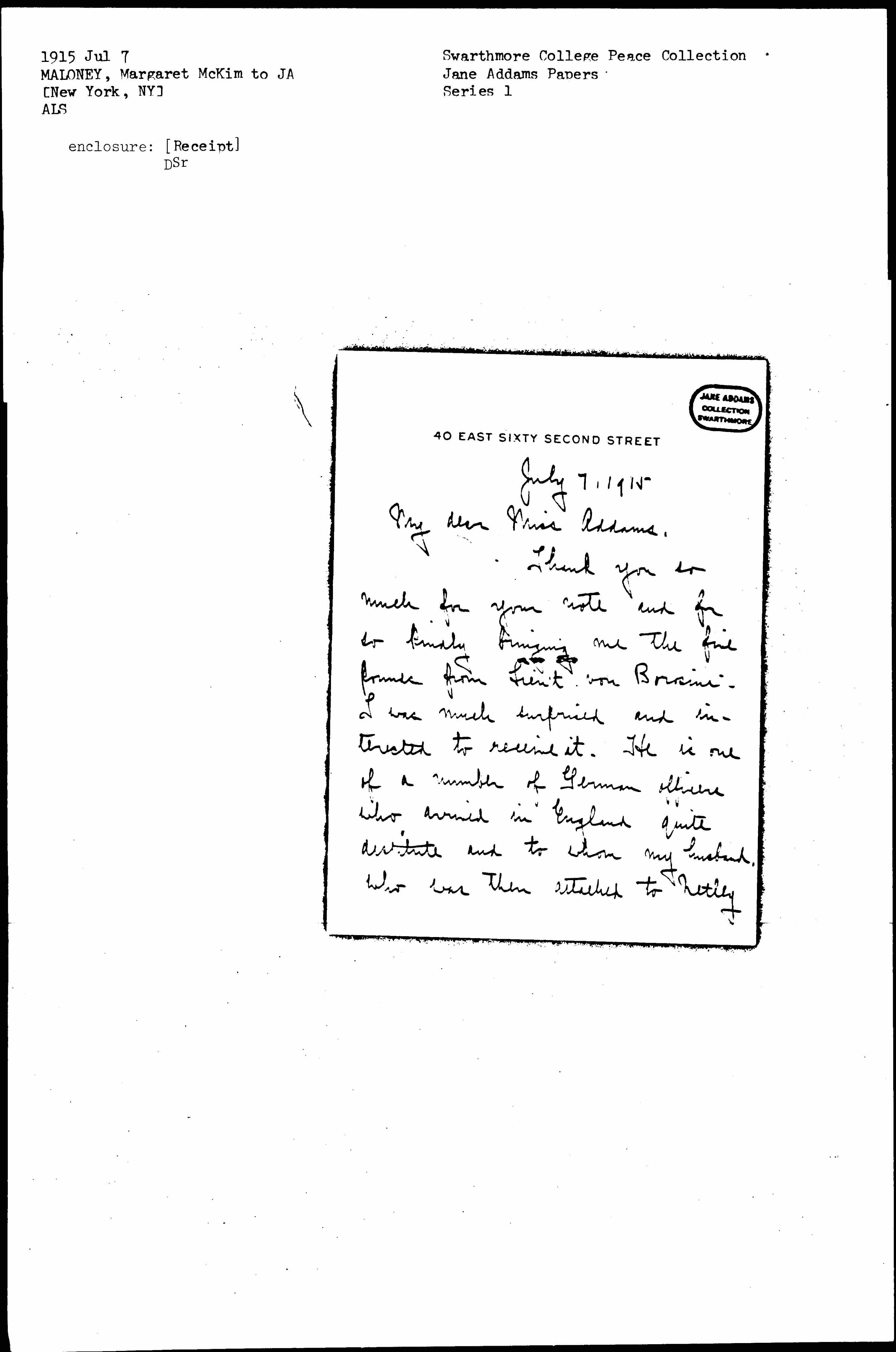 Thank you so much for your note and for so kindly bringing me the five pounds from Lieu't von Borosini. I was much surprised and interested to receive it. He is one of a number of German officers who arrived in England quite destitute and to whom my husband, who was then attached to Netley [page 2] Hospital, Southampton, lent some money.