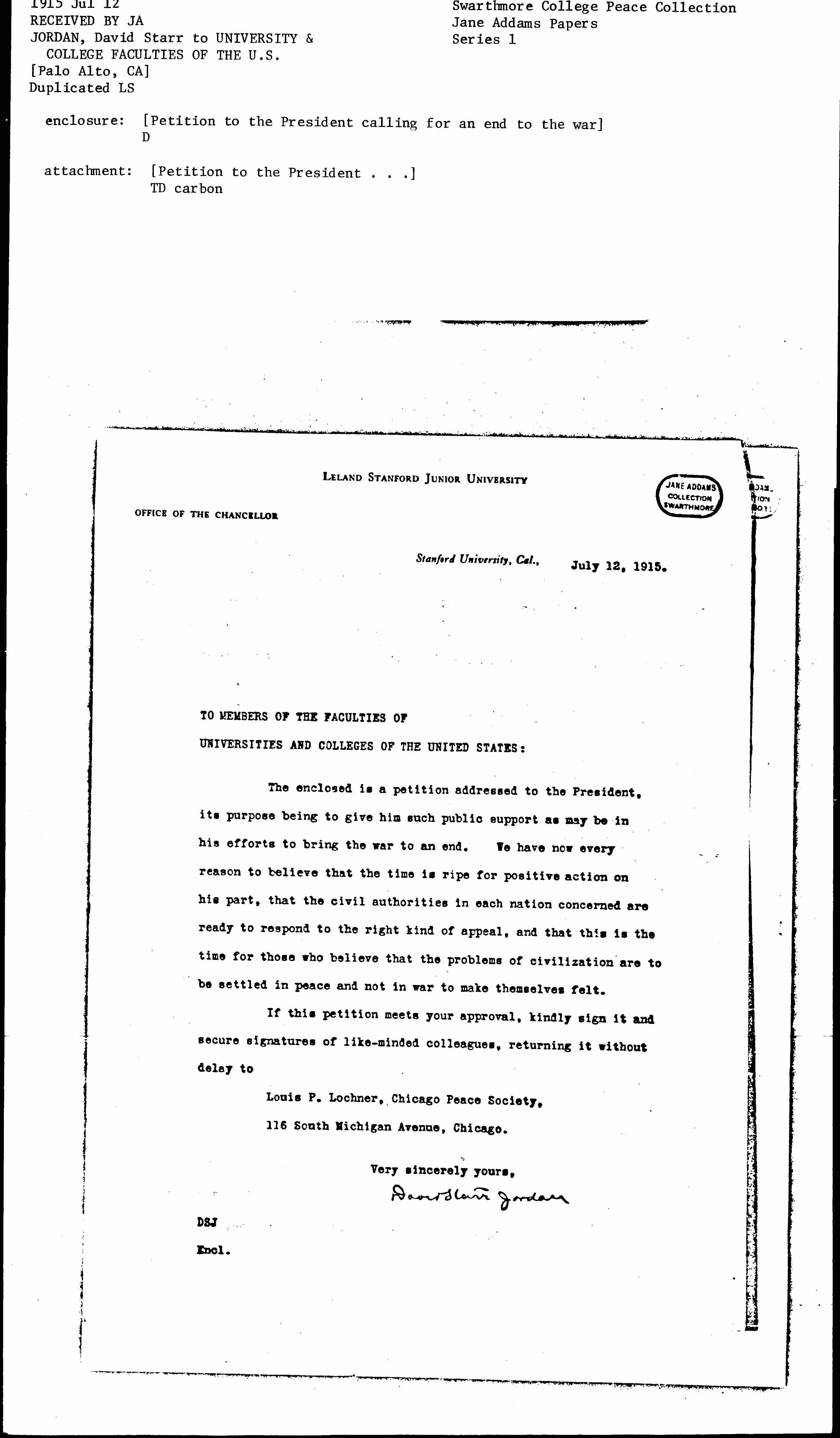 The enclosed is a petition addressed to the President, its purpose being to give him such public support as may be in his efforts to bring the war to an end. We have now every reason to believe that the time is ripe for positive action on his part, that the civil authorities in each nation concerned are ready to respond to the right kind of appeal, and that this is the time for those who believe that the problems of civilization are to be settled in peace and not in war to make themselves felt.
