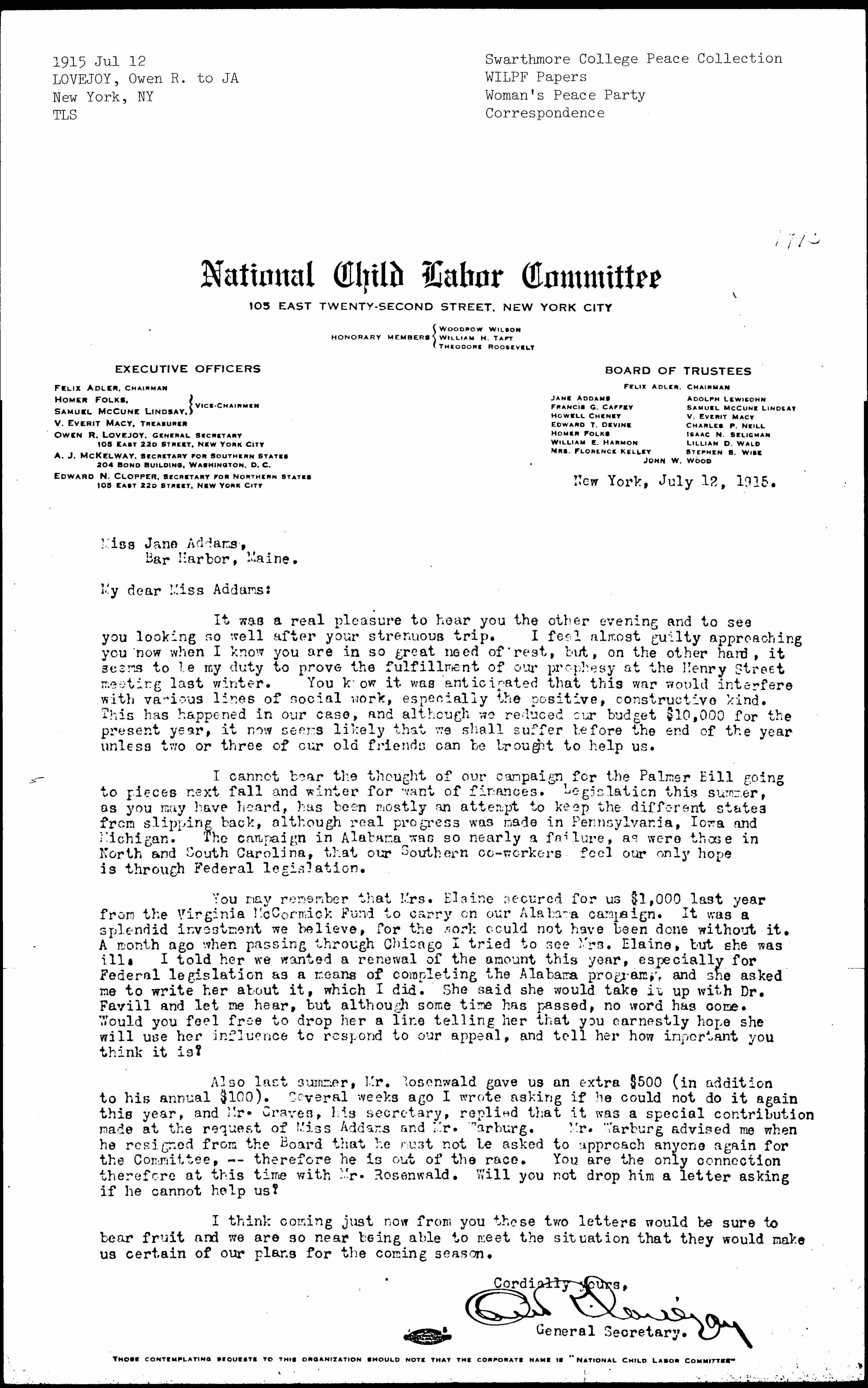 Also last summer, Mr. Rosenwald gave us an extra $500 (in addition to his annual $100). Several weeks ago I wrote asking if he could not do it again this year, and Mr. Graves, his secretary, replied that it was a special contribution made at the request of Miss Addams and Mr. Warburg. Mr. Warburg advised me when he resigned from the Board that he must not be asked to approach anyone again for the Committee, -- therefore he is out of the race. You are the only connection therefore at this time with Mr. Rosenwald. Will you not drop him a letter asking if he cannot help us?
