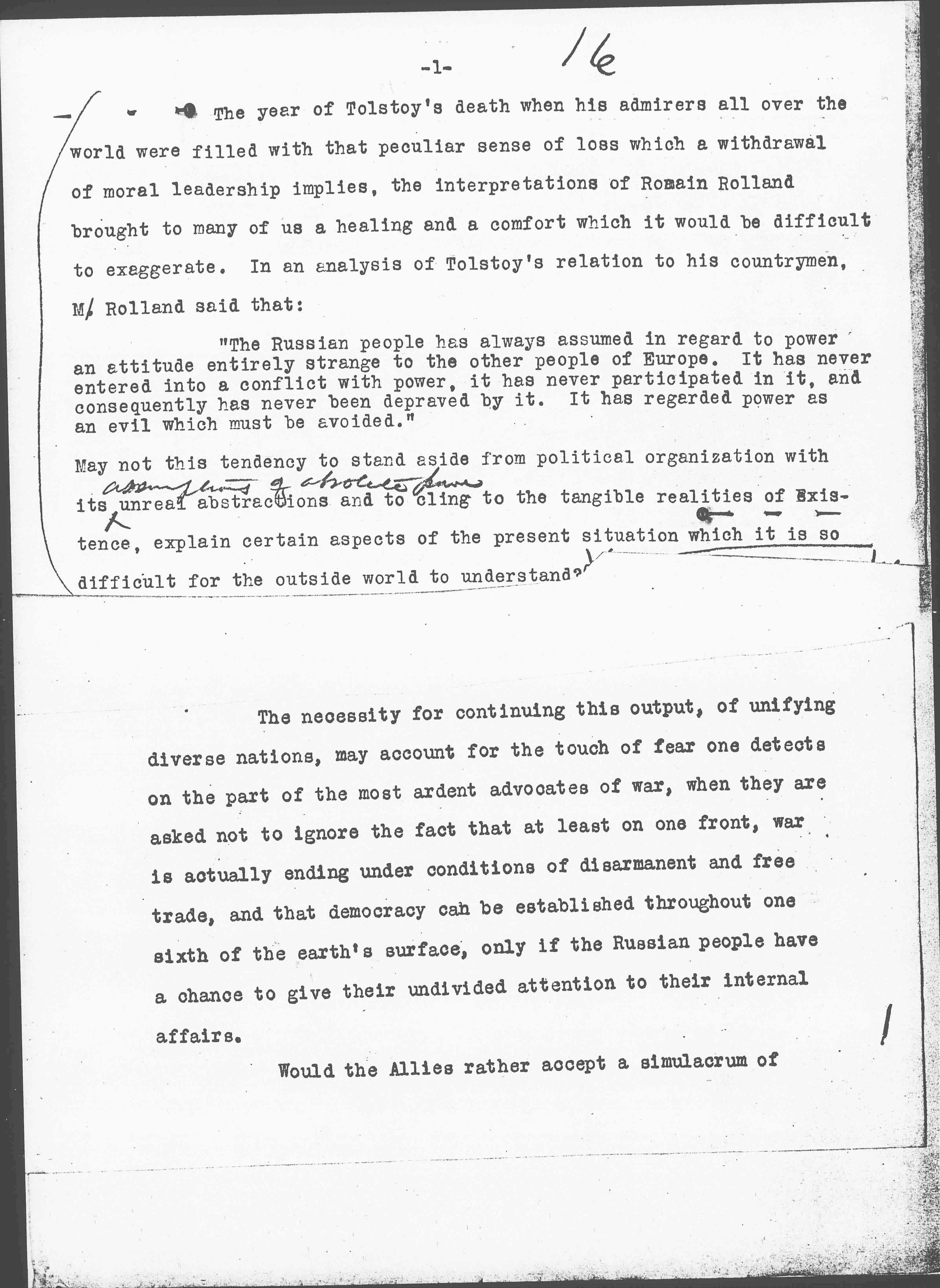 Certainly a sharp challenge of reality in two notable instances has come from Russia within a year and it is perhaps to be expected that Russia should be ↑have been↓ the first nation to apply the touchstone of reality to this warring world so absorbed in abstractions. [page 18]