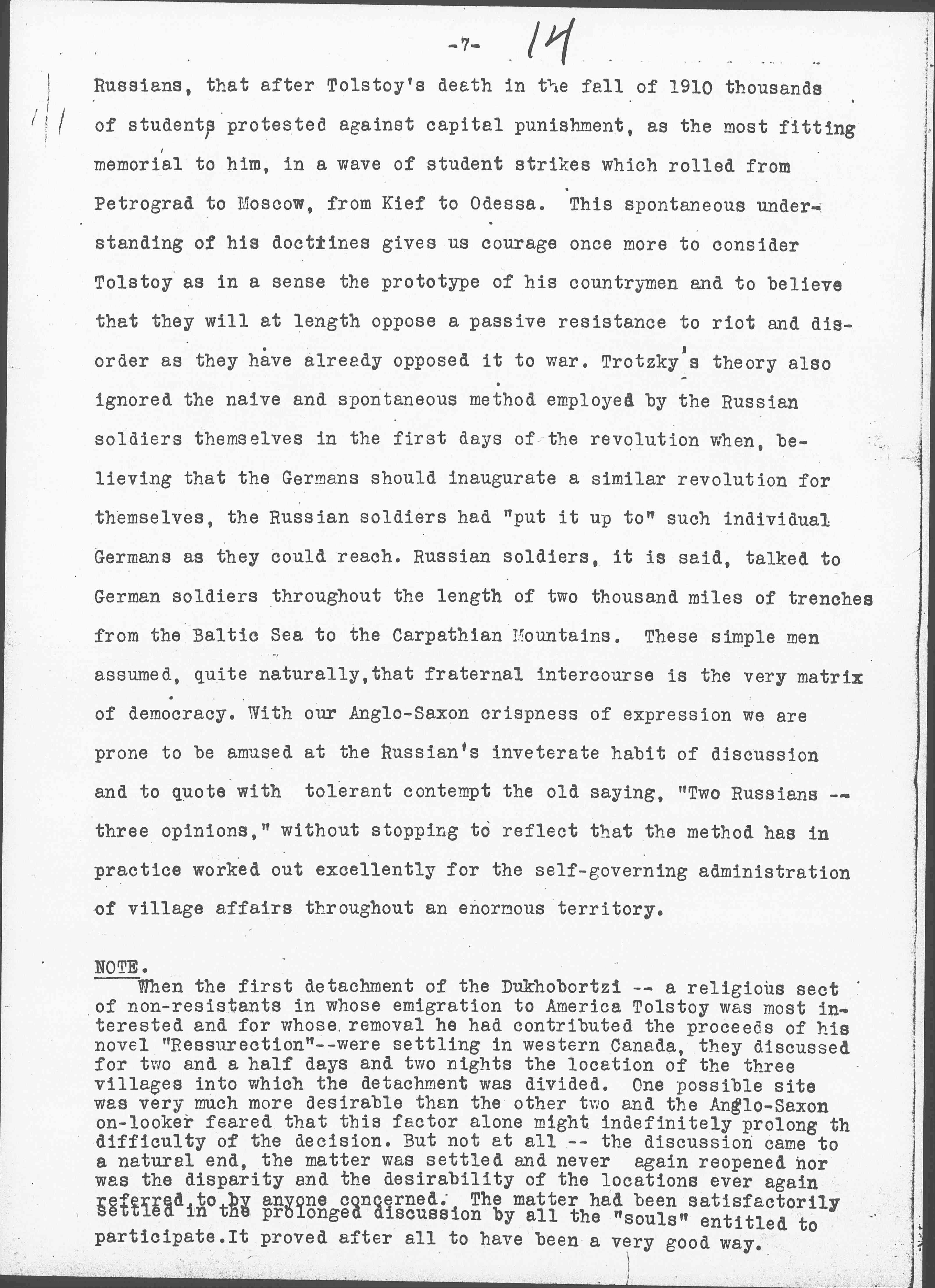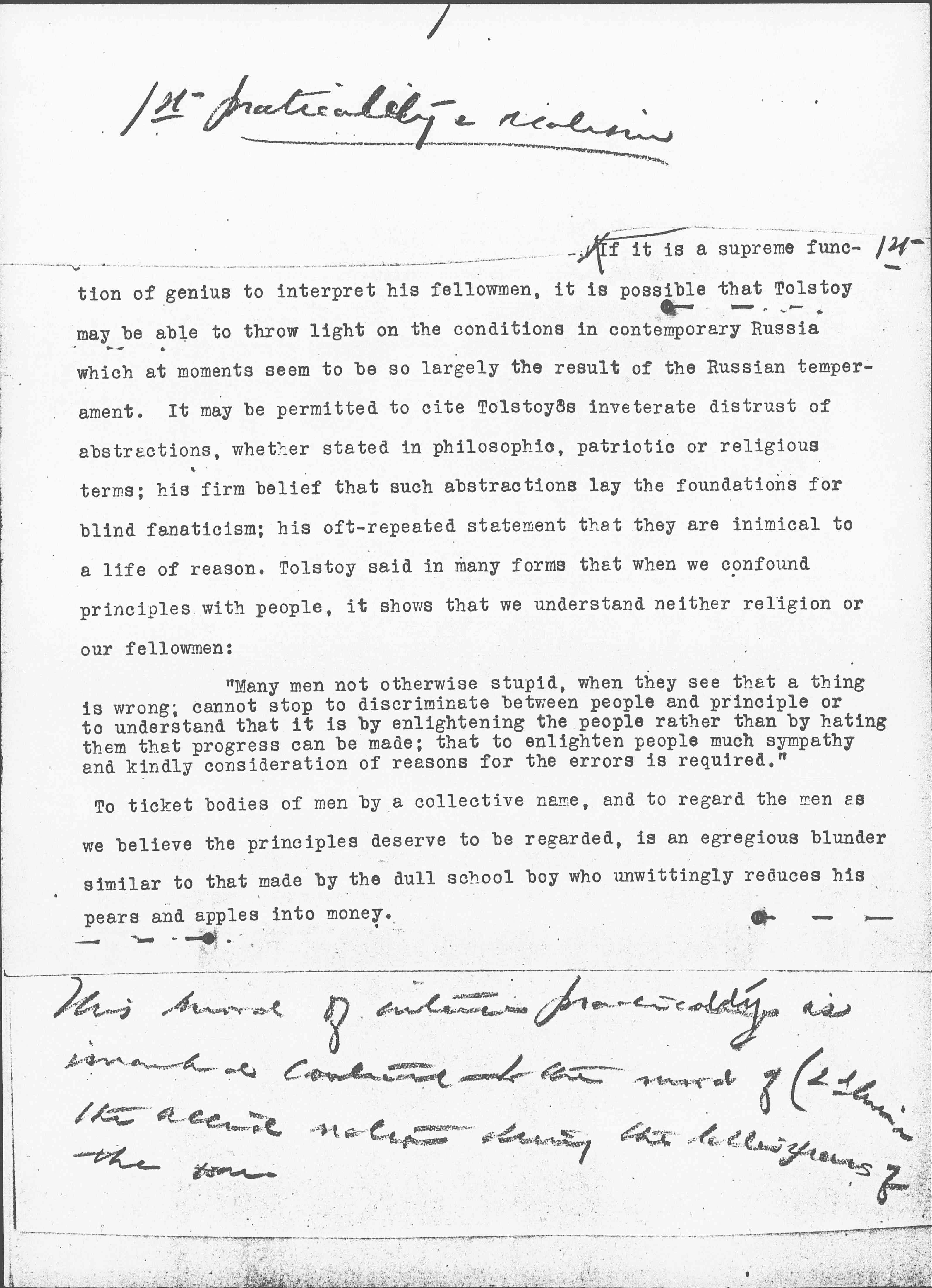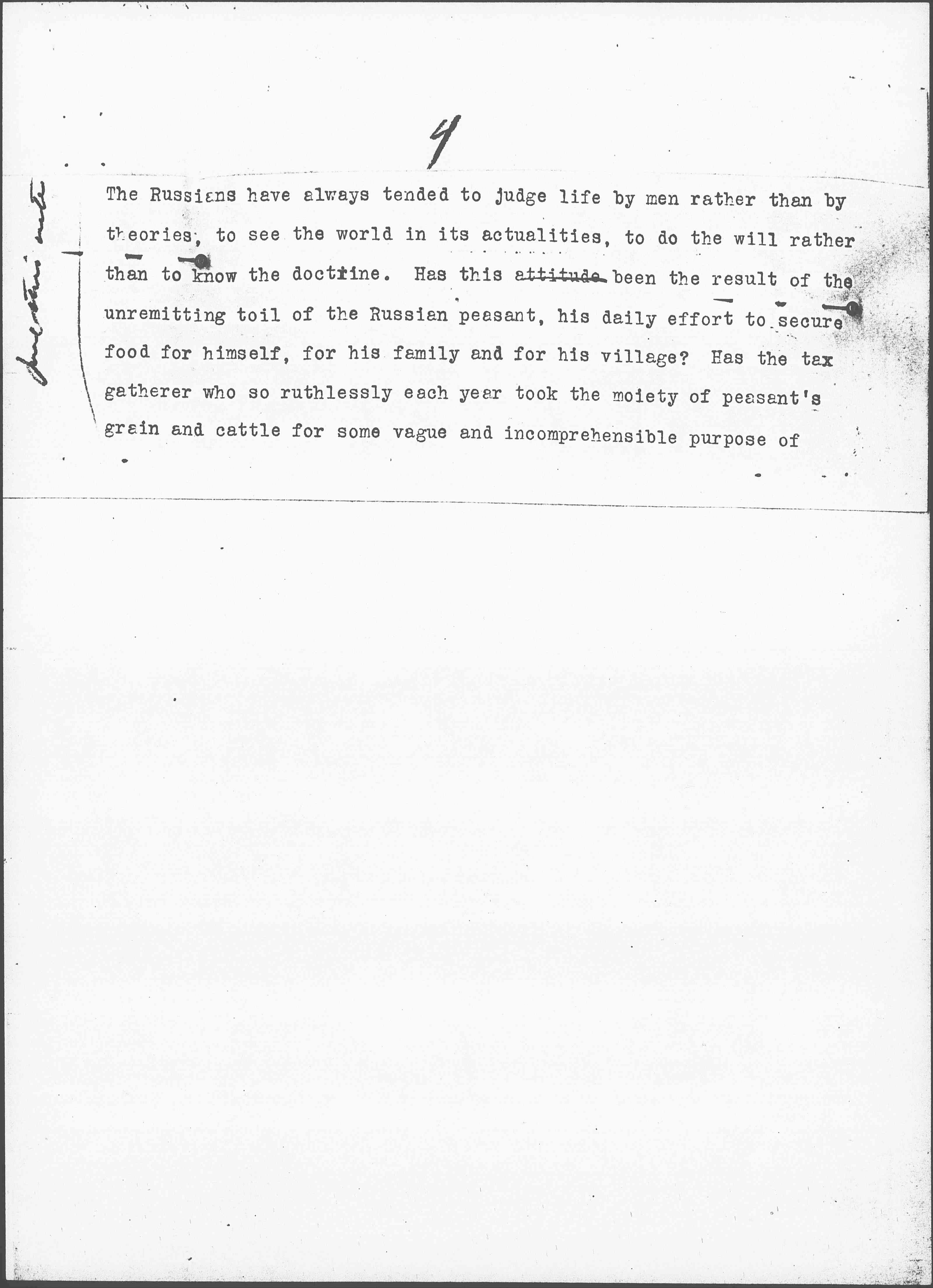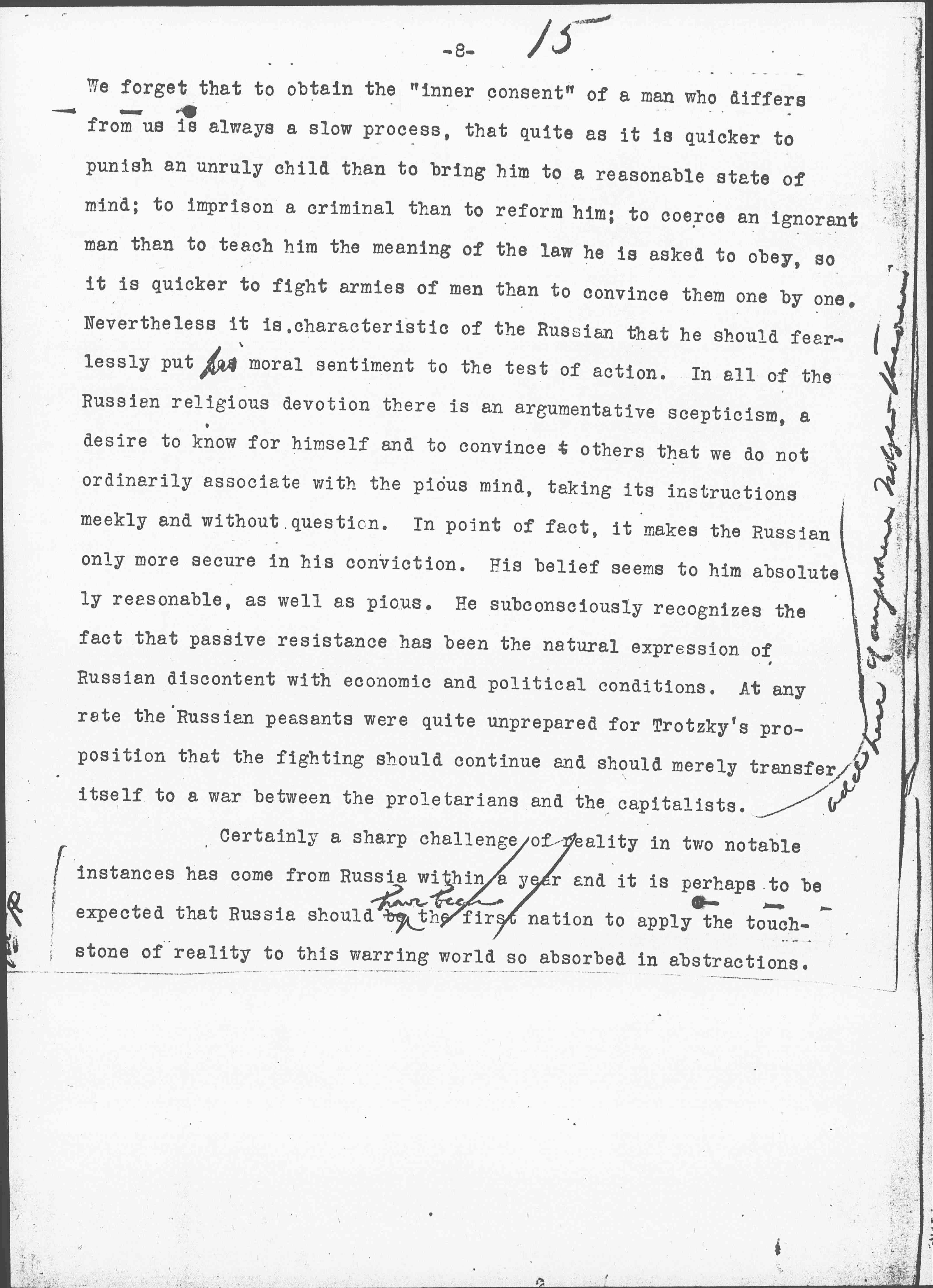 We forget that to obtain the "inner consent" of a man who differs from us is always a slow process, that quite as it is quicker to punish an unruly child than to bring him to a reasonable state of mind; to imprison a criminal than to reform him; to coerce an ignorant man than to teach him the meaning of the law he is asked to obey, so it is quicker to fight armies of men than to convince them one by one. Nevertheless it is characteristic of the Russian that he should fearlessly put [his] moral sentiment to the test of action. In all of the Russian religious devotion there is an argumentative [skepticism], a desire to know for himself and to convince others that we do not ordinarily associate with the pious mind, taking its instructions meekly and without question. In point of fact, it makes the Russian only more secure in his conviction. His belief seems to him absolutely reasonable, as well as pious. He subconsciously recognizes the fact that passive resistance has been the natural expression of Russian discontent with economic and political conditions. At any rate the Russian peasants were quite unprepared for [Trotsky's] proposition that the fighting should continue and should merely transfer itself to a war between the proletarians and the capitalists. [written in right margin] ↑add here if anywhere [Trotsky's] theories↓