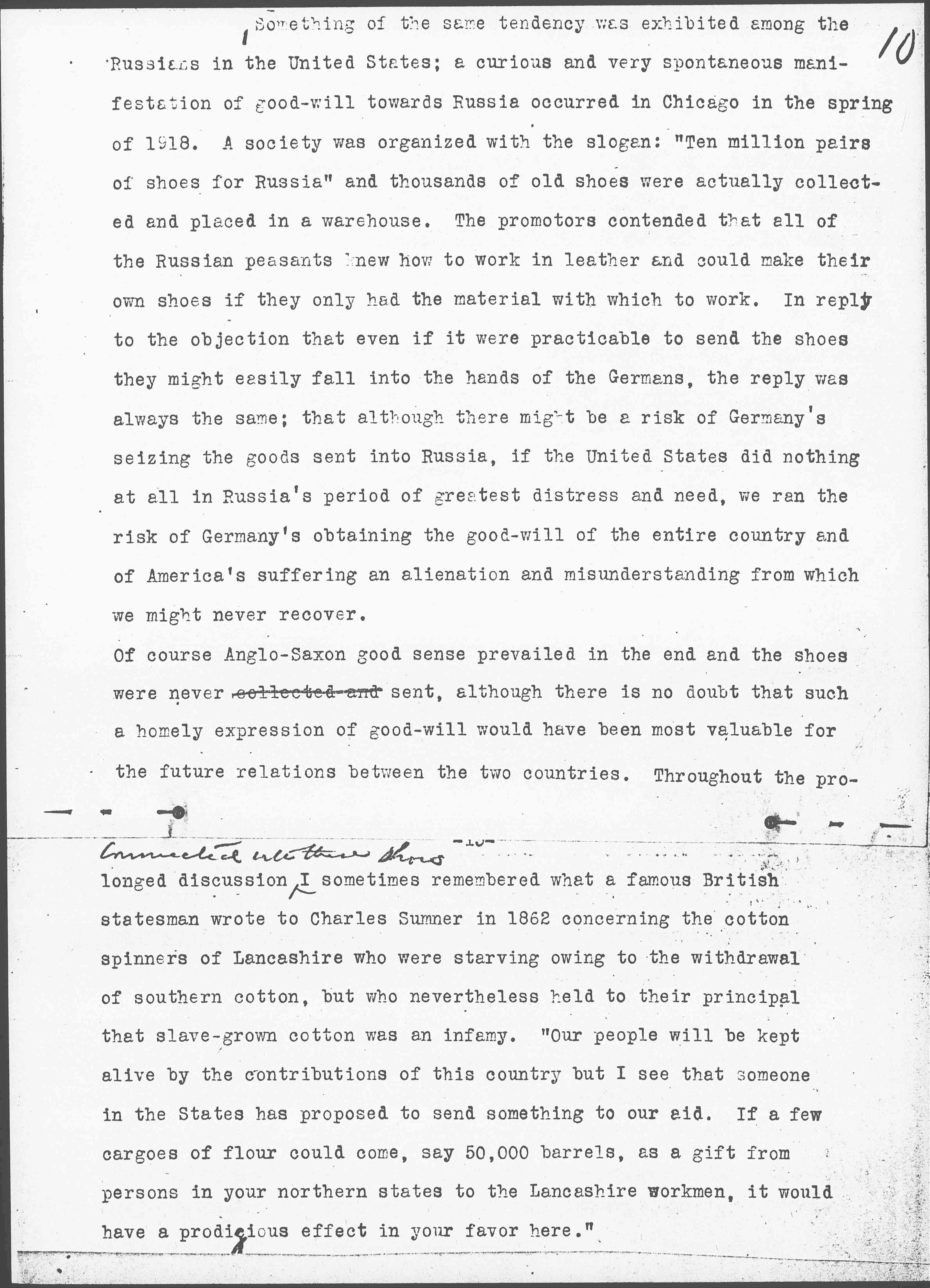 Of course Anglo-Saxon good sense prevailed in the end and the shoes were never collected and sent, although there is no doubt that such a homely expression of good-will would have been most valuable for the future relations between the two countries. Throughout the prolonged discussion ↑connected with these shoes↓ I sometimes remembered what a famous British statesman wrote to Charles Sumner in 1862 concerning the cotton spinners of Lancashire who were starving owing to the withdrawal of southern cotton, but who nevertheless held to their [principle] that slave-grown cotton was an infamy. "Our people will be kept alive by the contributions of this country but I see that someone in the States has proposed to send something to our aid. If a few cargoes of flour could come, say 50,000 barrels, as a gift from persons in your northern states to the Lancashire workmen, it would have a prodigious effect in your favor here." [page 13]