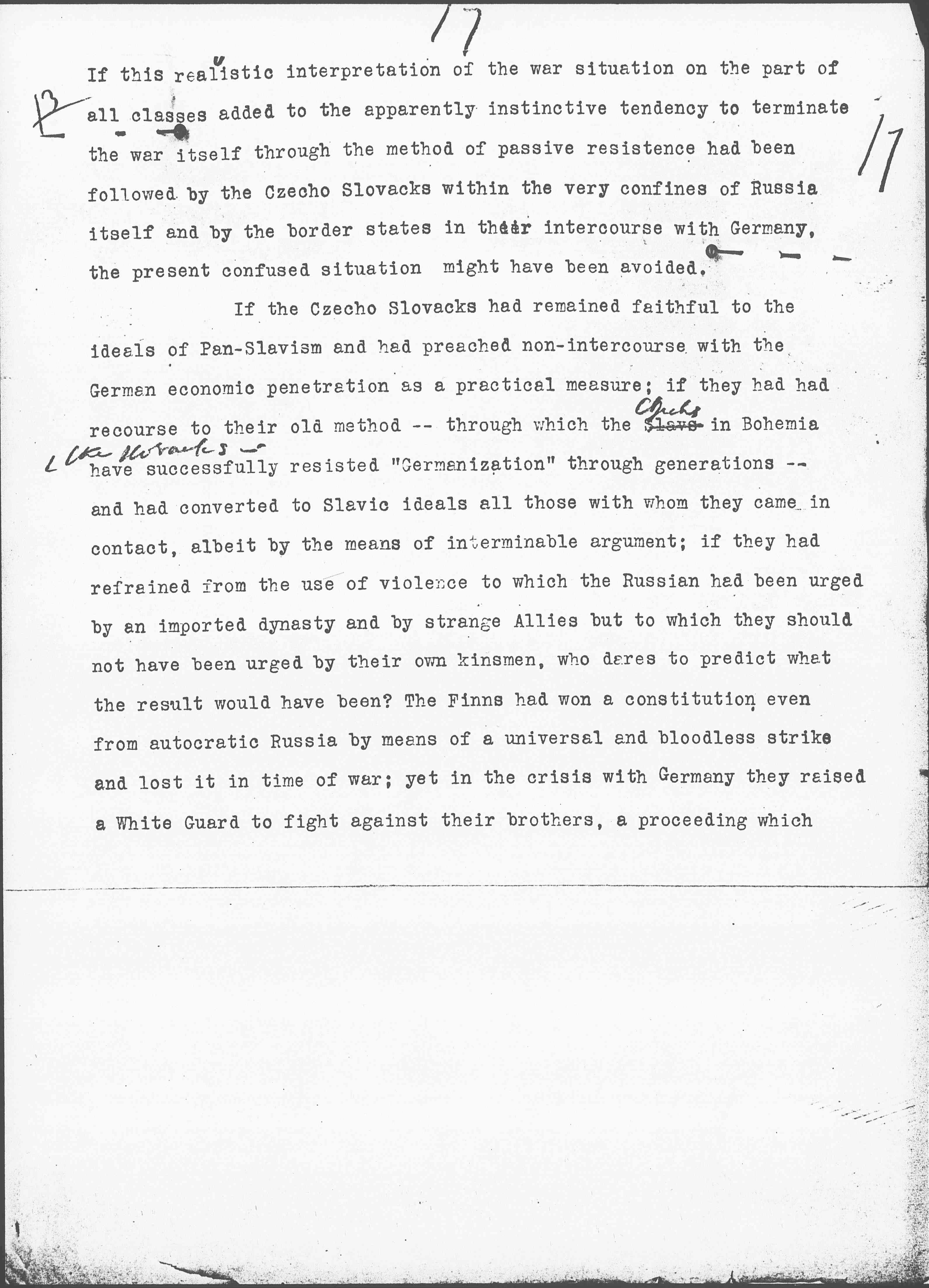 If the [Czechoslovaks] had remained faithful to the ideas of Pan-Slavism and had preached non-intercourse with the German economic penetration as a practical measure; if they had had recourse to their old method -- through which the Slavs ↑Czechs↓ in Bohemia ↑the Slovaks↓ have successfully resisted "Germanization" through generations -- and had converted to Slavic ideals all those with whom they came in contact, albeit by the means of interminable argument; if they had refrained from the use of violence to which the Russian had been urged by an imported dynasty and by strange Allies but to which they should not have been urged by their own kinsmen, who dares to predict what the result would have been? The Finns had won a constitution even from autocratic Russia by means of a universal and bloodless strike and lost it in time of war; yet in the crisis with Germany they raised a White Guard to fight against their brothers, a proceeding which [page 20] brought them help from military Germany, left them victorious over the representatives of the Bolsheviki but absolutely in the hands of the Germans.