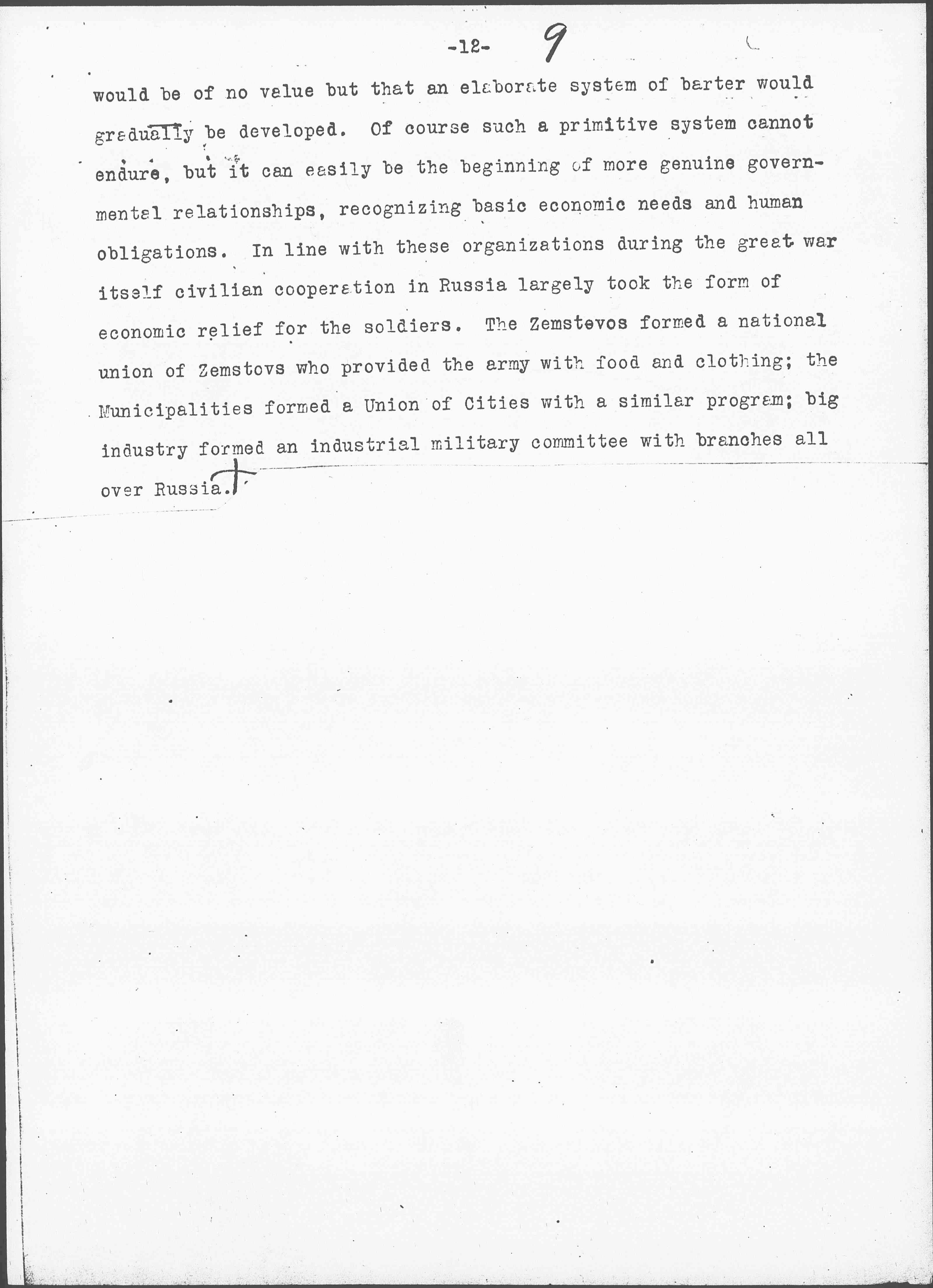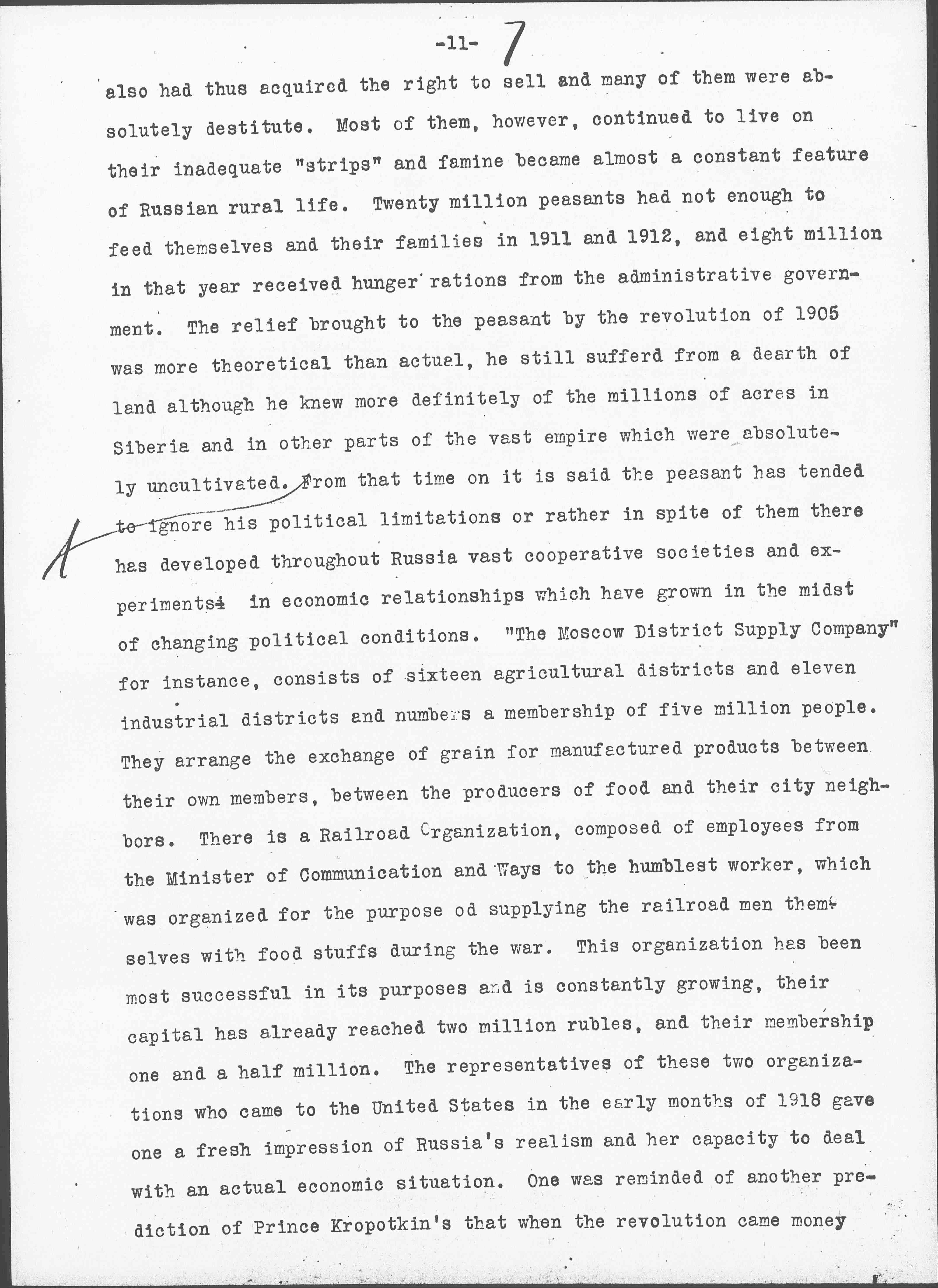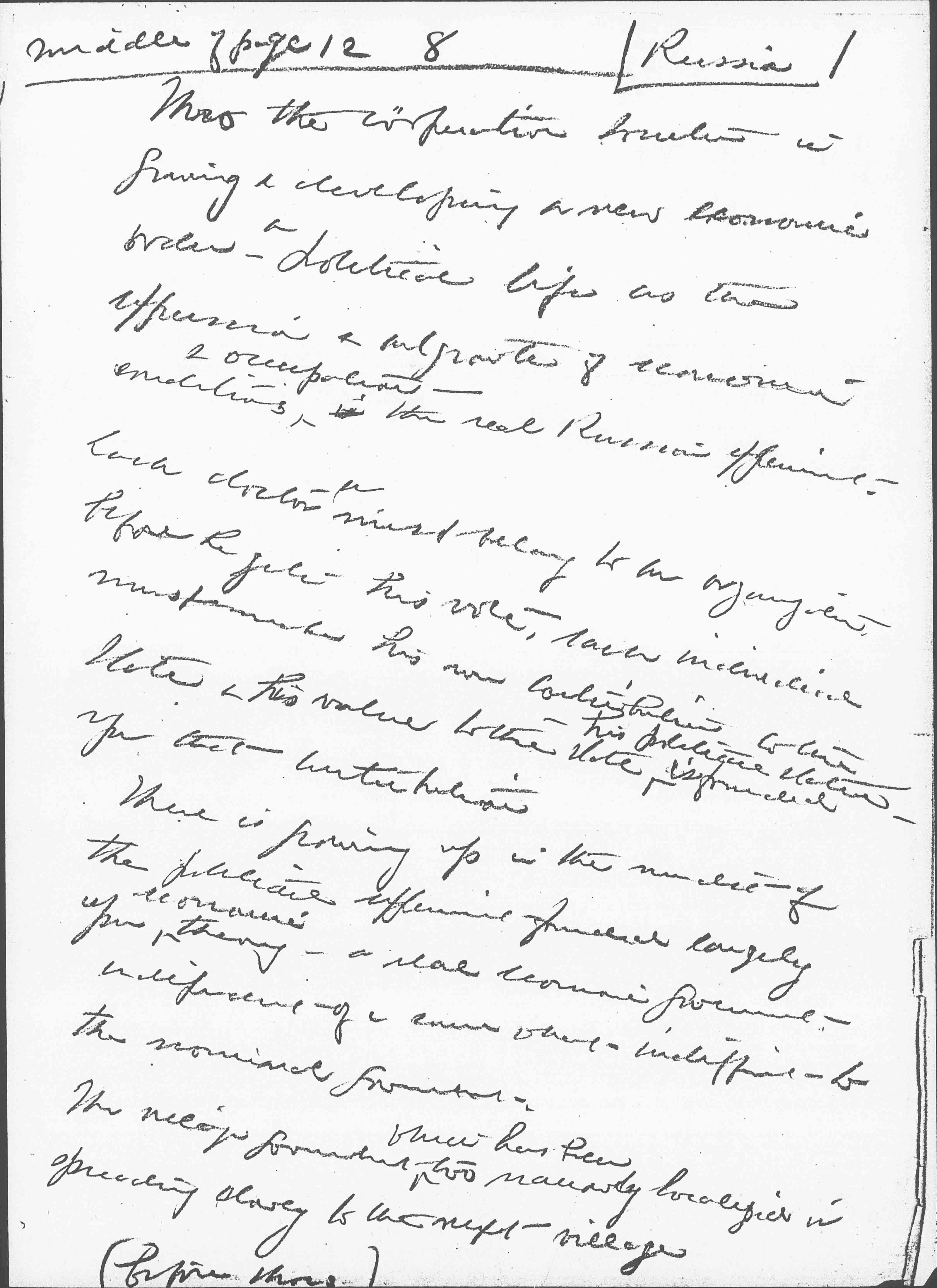 [Through] the cooperative societies in growing & developing a new economic order -- ↑a↓ political life as the expression & outgrowth of economic conditions ↑& occupation --↓ [illegible] the real Russian experiment.