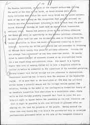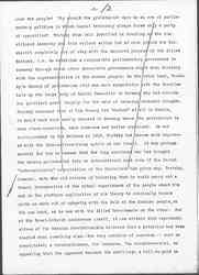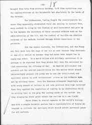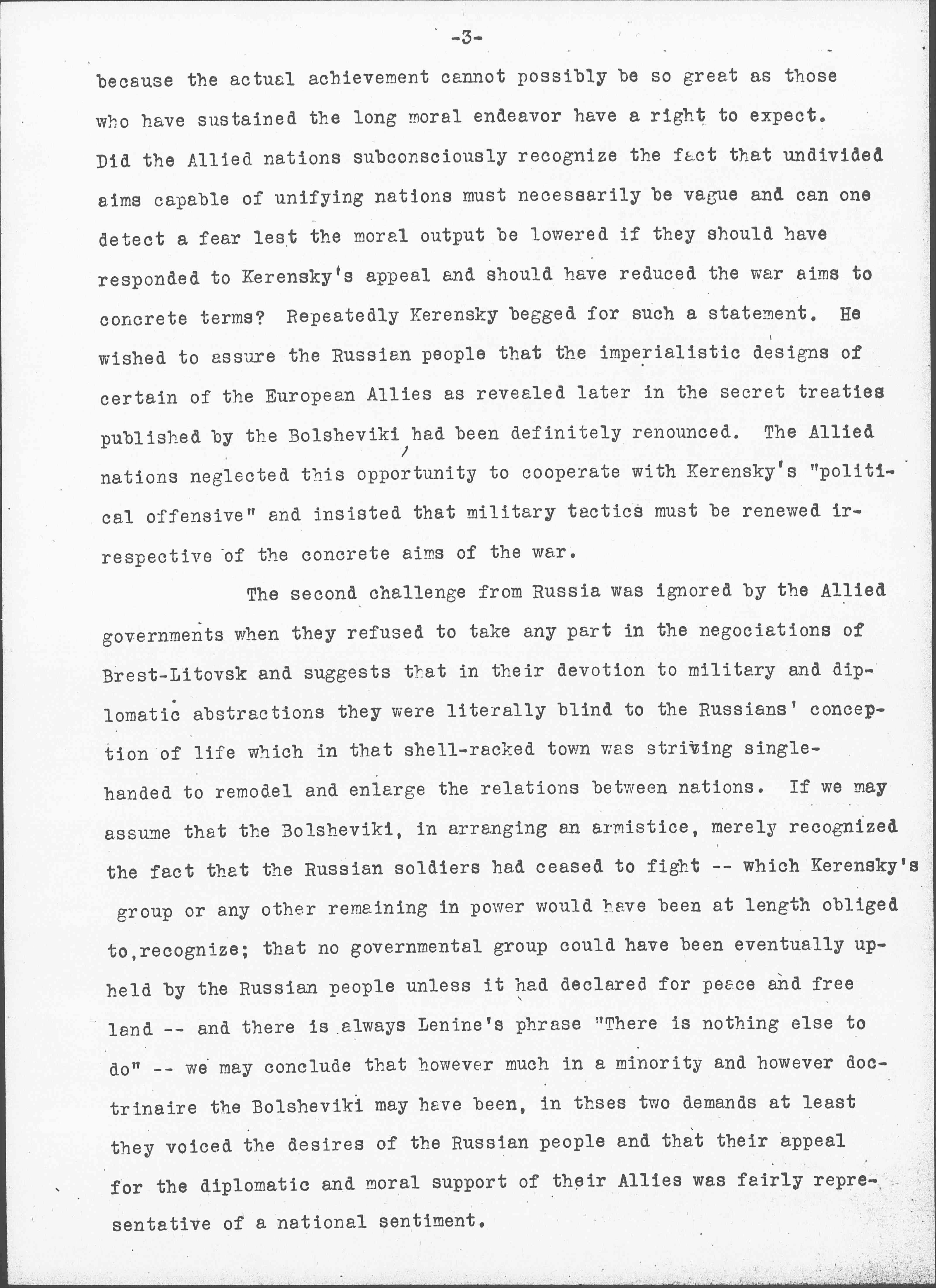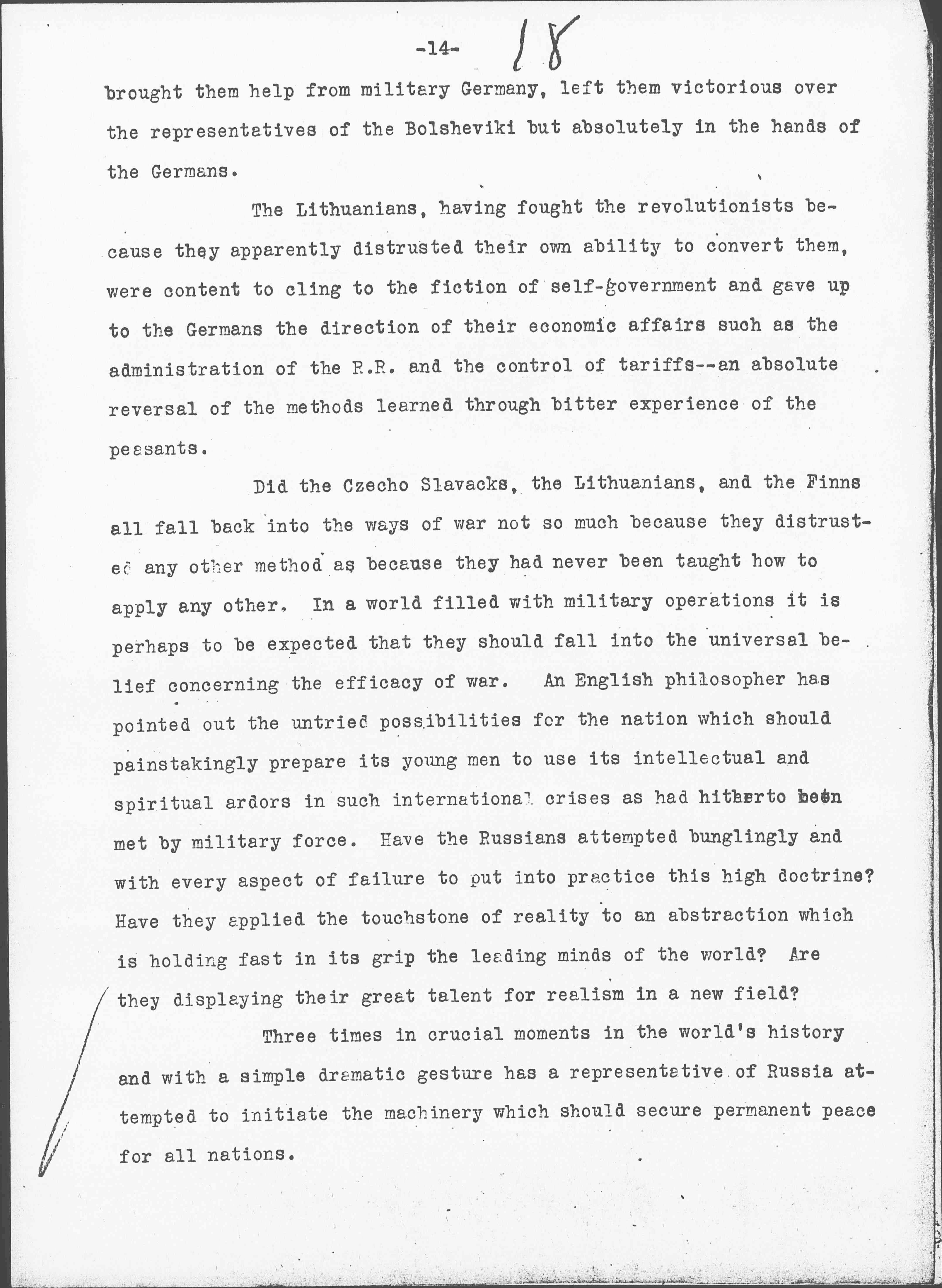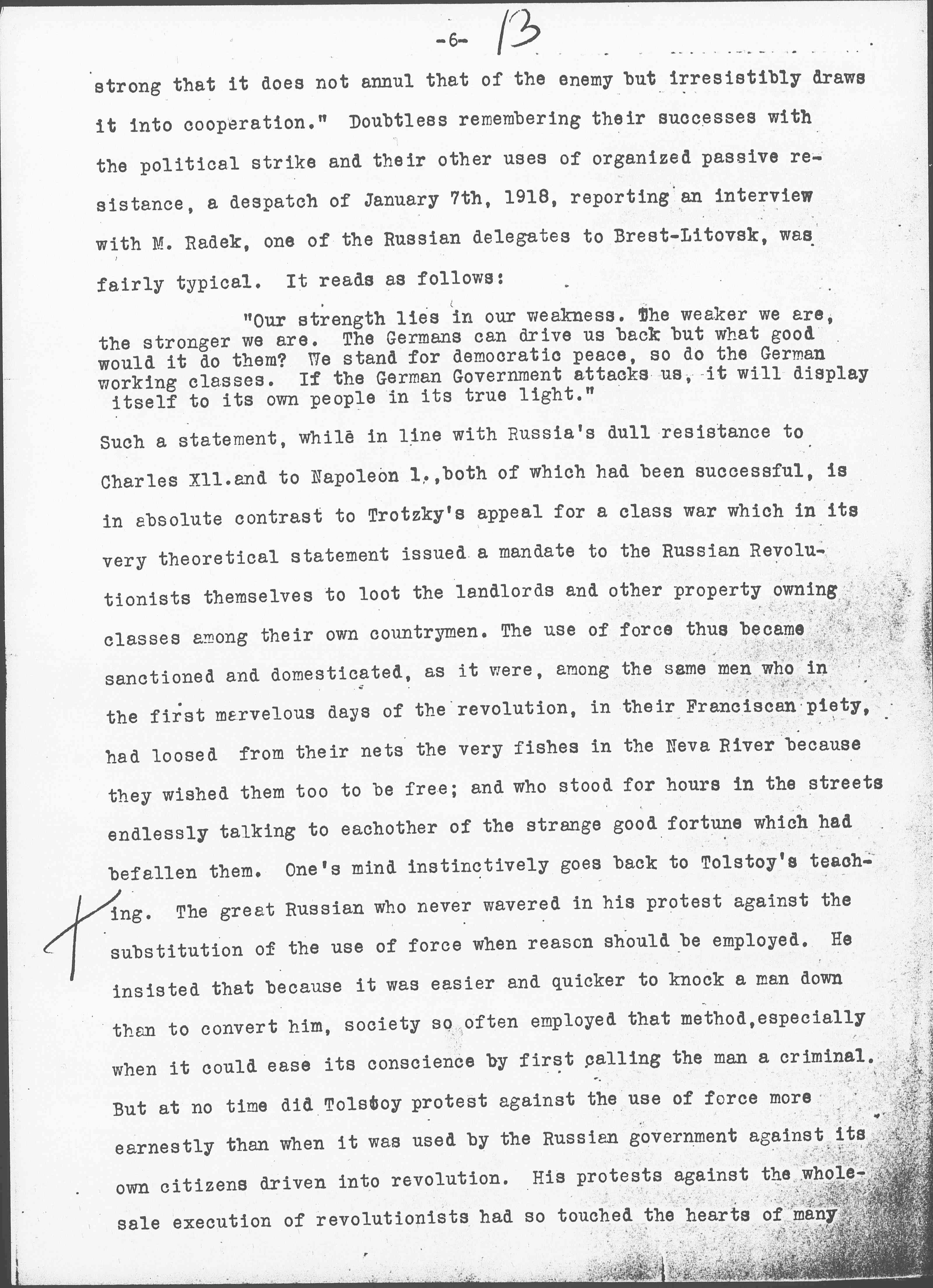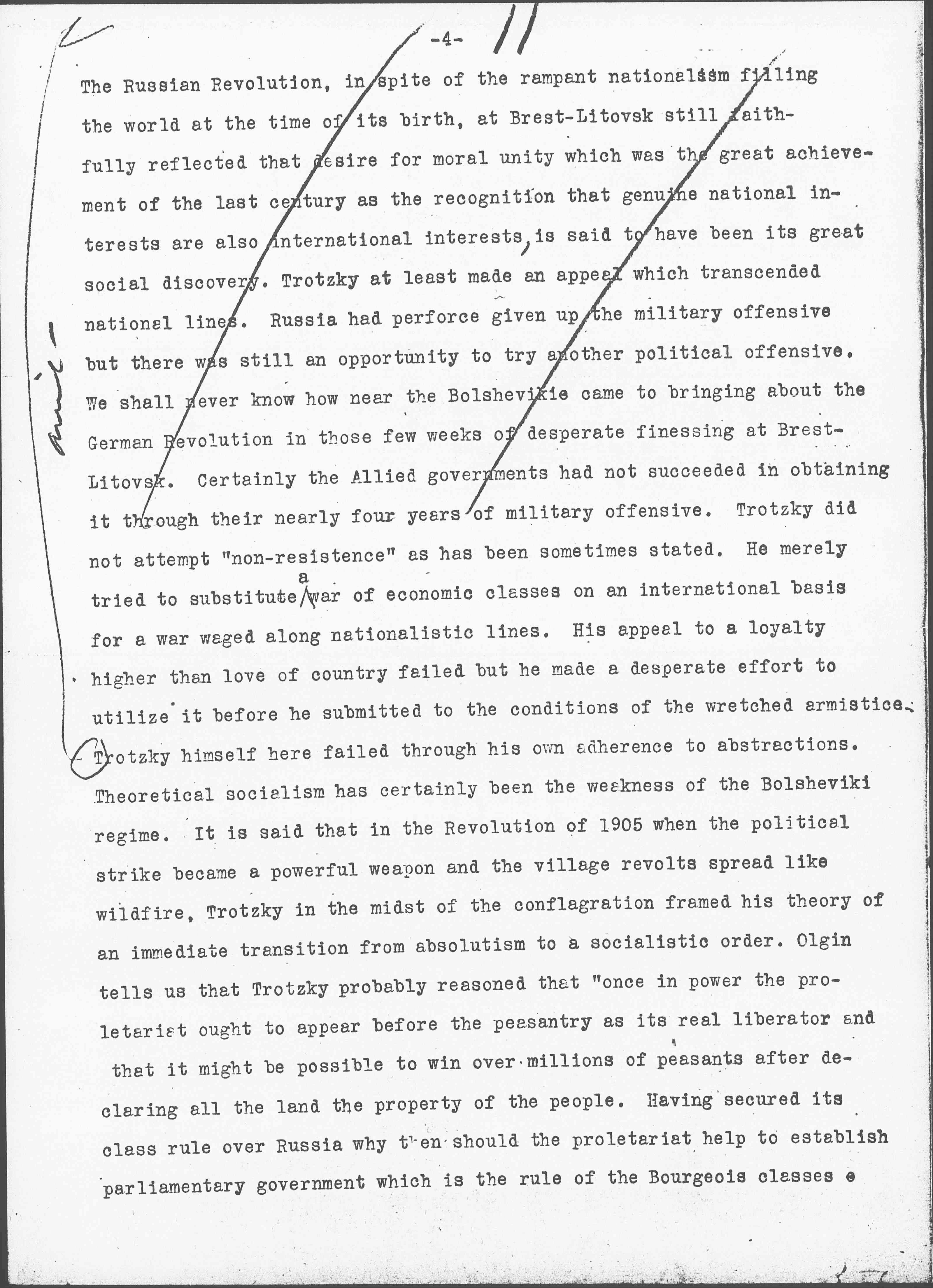 [written in left margin] ↑omit↓ The Russian Revolution, in spite of the rampant nationalism filling the world at the time of its birth, at Brest-Litovsk still faithfully reflected that desire for moral unity which was the great achievement of the last century as the recognition that genuine national interests are also international interests, is said to have been its great social discovery. [Trotsky] at least made an appeal which transcended national lines. Russia had perforce given up the military offensive but there was still an opportunity to try another political offensive. We shall never know how near the [Bolshevikis] came to bringing about the German Revolution in those few weeks of desperate finessing at Brest-Litovsk. Certainly the Allied governments had not succeeded in obtaining it through their nearly four years of military offensive. [Trotsky] did not attempt "non-[resistance]" as has been sometimes stated. He merely tried to substitute ↑a↓ war of economic classes on an international basis for a war waged along nationalistic lines. His appeal to a loyalty higher than love of country failed but he made a desperate effort to utilize it before he submitted to the conditions of the wretched armistice. [Trotsky] himself here failed through his own adherence to abstractions. Theoretical socialism has certainly been the weakness of the Bolsheviki regime. It is said that in the Revolution of 1905 when the political strike became a powerful weapon and the village revolts spread like wildfire, [Trotsky] in the midst of the conflagration framed his theory of an immediate transition from absolutism to a socialistic order. Olgin tells us that [Trotsky] probably reasoned that "once in power the proletariat ought to appear before the peasantry as its real liberator and that it might be possible to win over millions of peasants after declaring all the land the property of the people." Having secured its class rule over Russia why then should the proletariat help to establish parliamentary government which is the rule of the Bourgeois classes [page 14] over the people? Why should the proletariat open up an era of parliamentary politics in which Social Democracy always forms only a party of opposition? [Trotsky] thus felt justified in breaking up the Constituent Assembly and this violent action had at once placed the Bolsheviki completely out of step with the declared purpose of the Allied Nations, i.e. to establish a responsible parliamentary government in Germany through which other democratic governments might deal directly with the representatives of the German people. On the other hand, [Trotsky's] theory of proletarian rule was more sympathetic with the theories held by the large body of Social Democrats in Germany who had striven for political power largely for the sake of securing economic changes. [Trotsky] reasoned that if his theory had "worked" at all in Russia, it would much more easily succeed in Germany where the proletariat is more class-conscious, more numerous and better organized. As war correspondent in the Balkans in [1912], [Trotsky] had become much impressed with the internationalizing spirit of war itself. It was perhaps natural for him to assume that the long continued war had brought the German proletariat into an international mood even if the formal "Internationale" organization of the Socialists had given way. [Trotsky], however, made the old mistake of believing that he could carry out a theory irrespective of the actual experiences of the people about him and in the stubborn application of his theory he eventually became quite as much out of sympathy with the bulk of the Russian people, on the one hand, as he was with the Allied Governments on the other. For at the Brest-Litovsk conference itself, it was evident that representatives of the Russian Revolutionists believed that a situation had been reached when something else -- the very antidote of coercion -- must be substituted; a reasonableness, for instance, "so uncontroversial, so appealing that the opponent becomes the auxiliary; a will-to-good so [page 15] strong that it does not annul that of the enemy but irresistibly draws it into cooperation." Doubtless remembering their success with the political strike and their other uses of organized passive resistance, a [dispatch] of January 7th, 1918, reporting an interview with [Mr.] Radek, one of the Russian delegates to Brest-Litovsk, was fairly typical. It reads as follows: