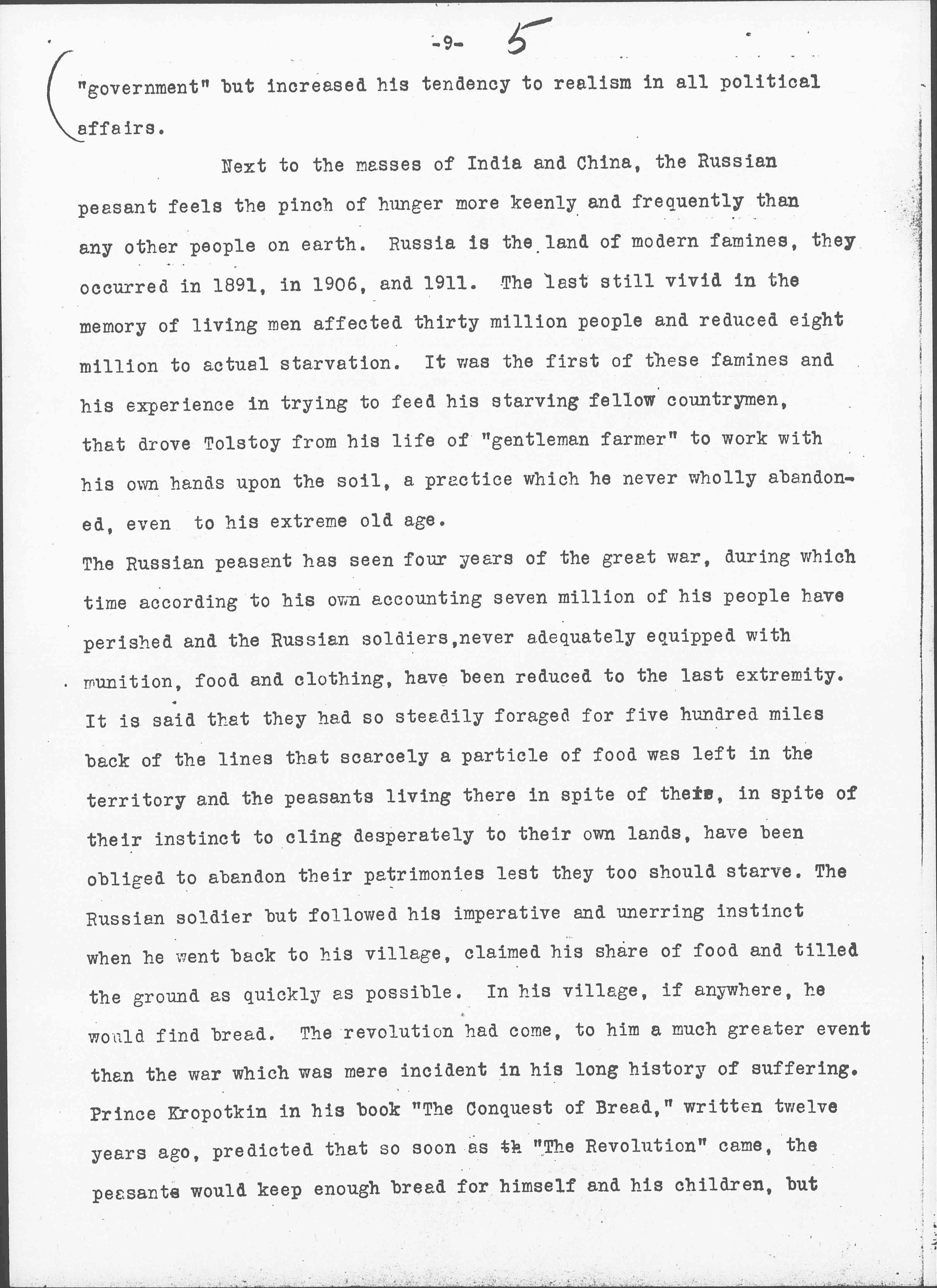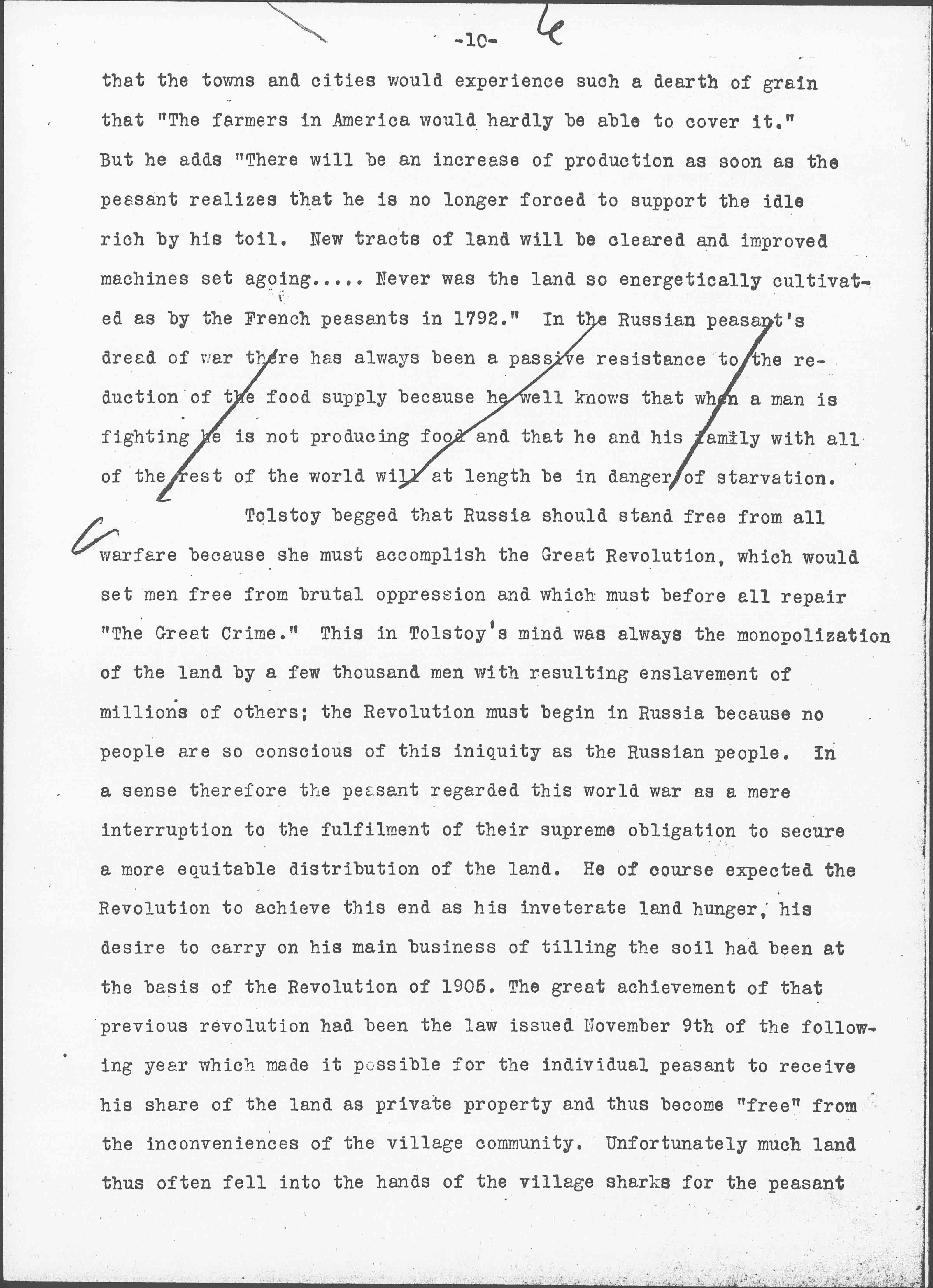 Tolstoy begged that Russia should stand free from all warfare because she must accomplish the Great Revolution, which would set men free from brutal oppression and which must before all repair "The Great Crime." This in Tolstoy's mind was always the monopolization of the land by a few thousand men with resulting enslavement of millions of others; the Revolution must begin in Russia because no people are so conscious of this iniquity as the Russian people. In a sense therefore the peasant regarded this world war as a mere interruption to the fulfilment of their supreme obligation to secure a more equitable distribution of the land. He of course expected the Revolution to achieve this end as his inveterate land hunger, his desire to carry on his main business of tilling the soil had been at the basis of the Revolution of 1905. The great achievement of that previous revolution had been the law issued November 9th of the following year which made it possible for the individual peasant to receive his share of the land as private property and thus become "free" from the inconveniences of the village community. Unfortunately much land thus often fell into the hands of the village sharks for the peasant [page 9] also had thus acquired the right to sell and many of them were absolutely destitute. Most of them, however, continued to live on their inadequate "strips" and famine became almost a constant feature of Russian rural life. Twenty million peasants had not enough to feed themselves and their families in 1911 and 1912, and eight million in that year received hunger rations from the administration government. The relief brought to the peasant by the revolution of 1905 was more theoretical than actual, he still [suffered] from a dearth of land although he knew more definitely of the millions of acres in Siberia and in other parts of the vast empire which were absolutely uncultivated.