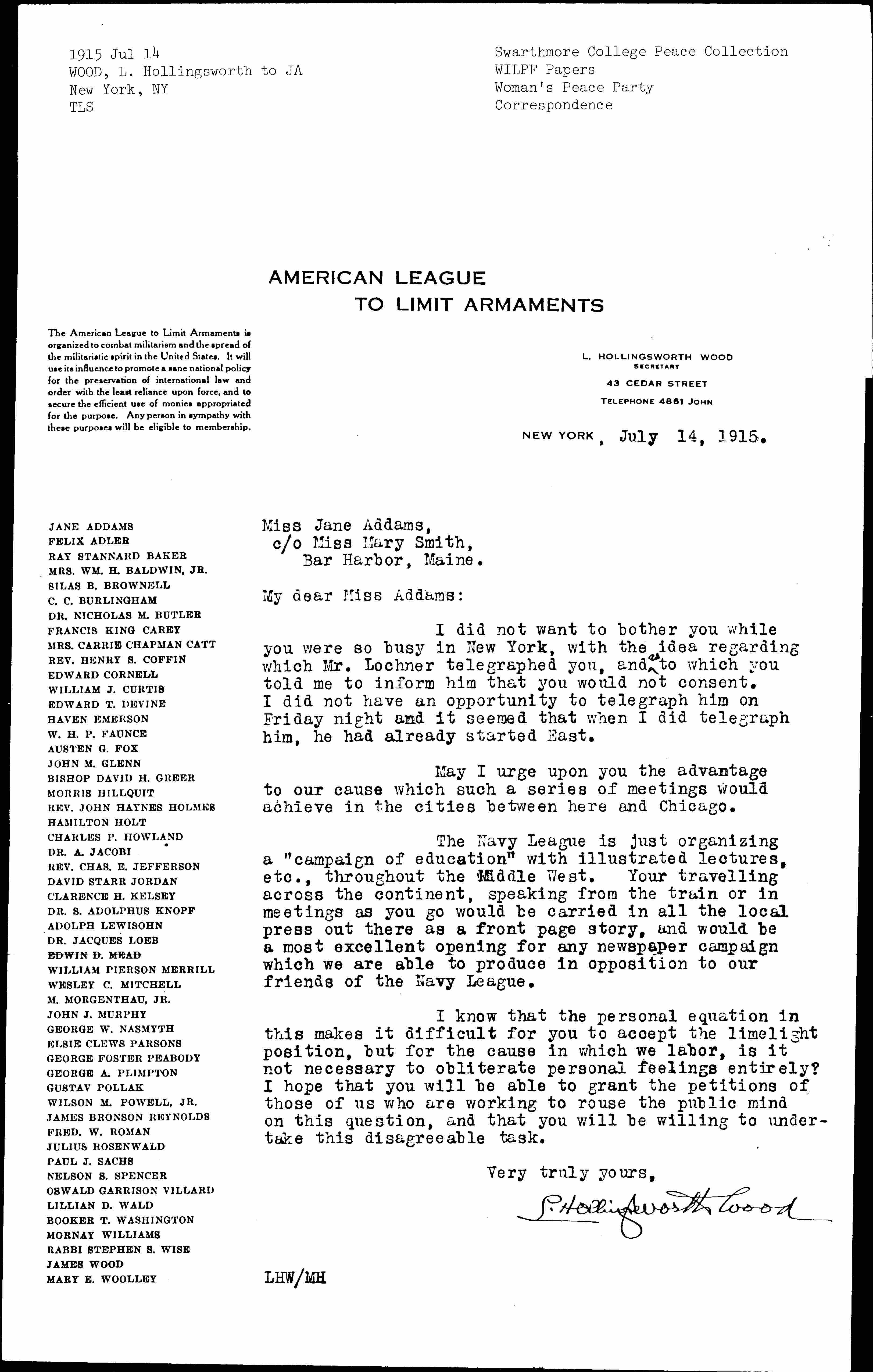 The Navy League is just organizing a "campaign of education" with illustrated lectures, etc., throughout the Middle West. Your [traveling] across the continent, speaking from the train or in meetings as you go would be carried in all the local press out there as a front page story, and would be a most excellent opening for any newspaper campaign which we are able to produce in opposition to our friends of the Navy League.