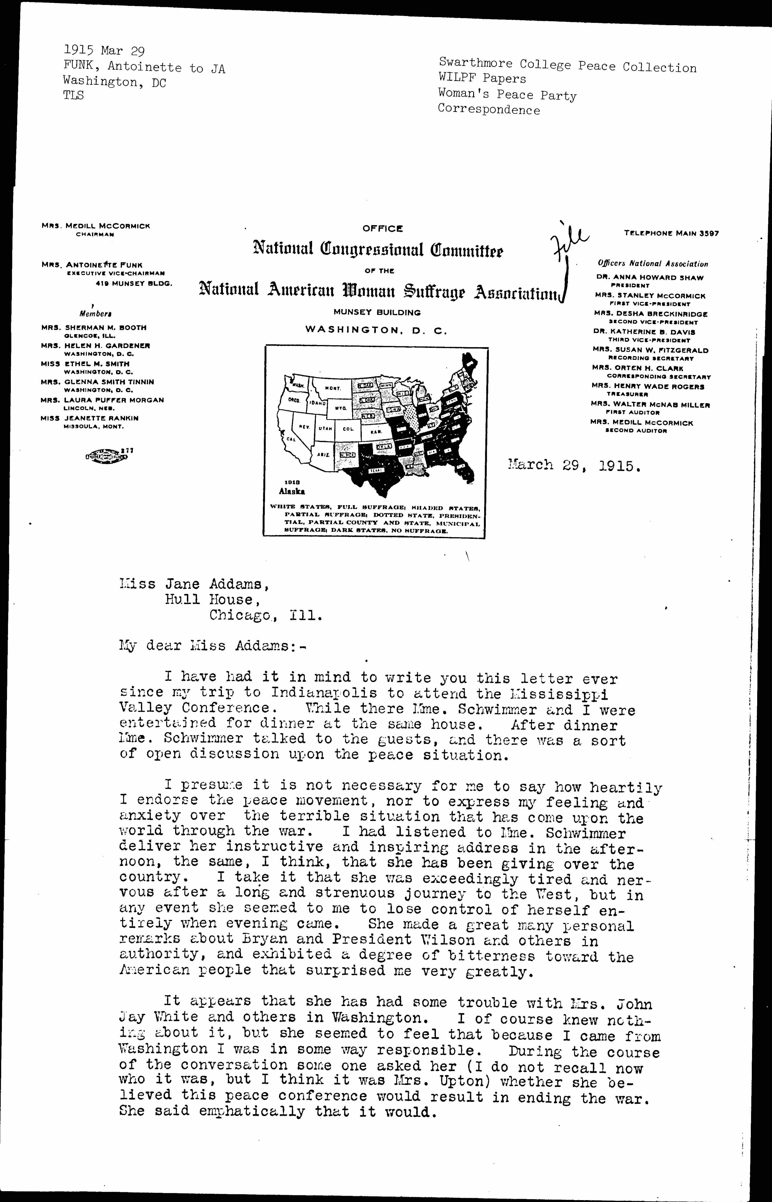 I have had it in mind to write you this letter ever since my trip to Indianapolis to attend the Mississippi Valley Conference. While there Mme. Schwimmer and I were entertained for dinner at the same house. After dinner Mme. Schwimmer talked to the guests, and there was a sort of open discussion upon the peace situation.