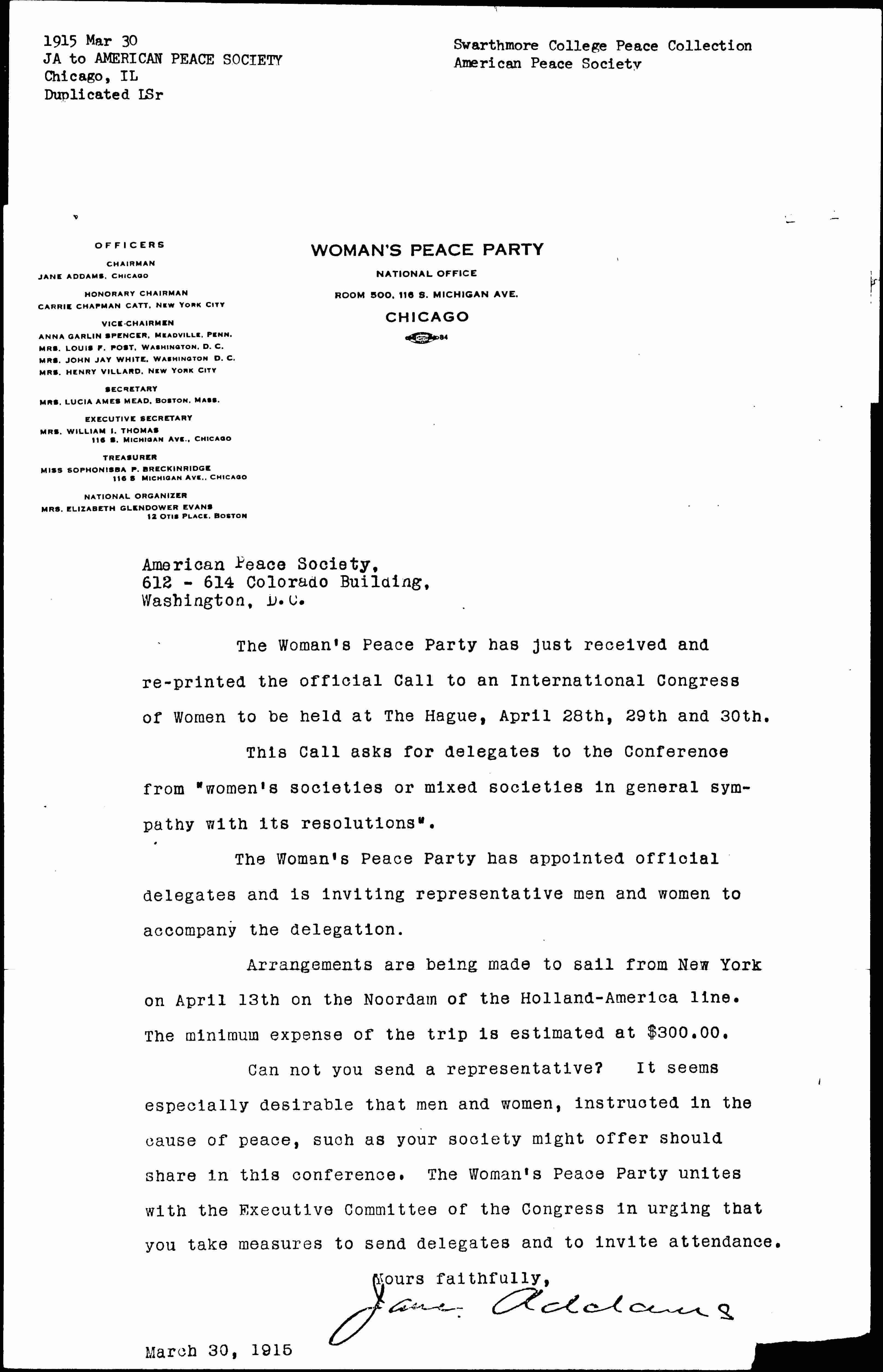Can not you send a representative? It seems especially desirable that men and women, instructed in the cause of peace, such as your society might offer should share in this conference. The Woman's Peace Party unites with the Executive Committee of the Congress in urging that you take measures to send delegates and to invite attendance.
