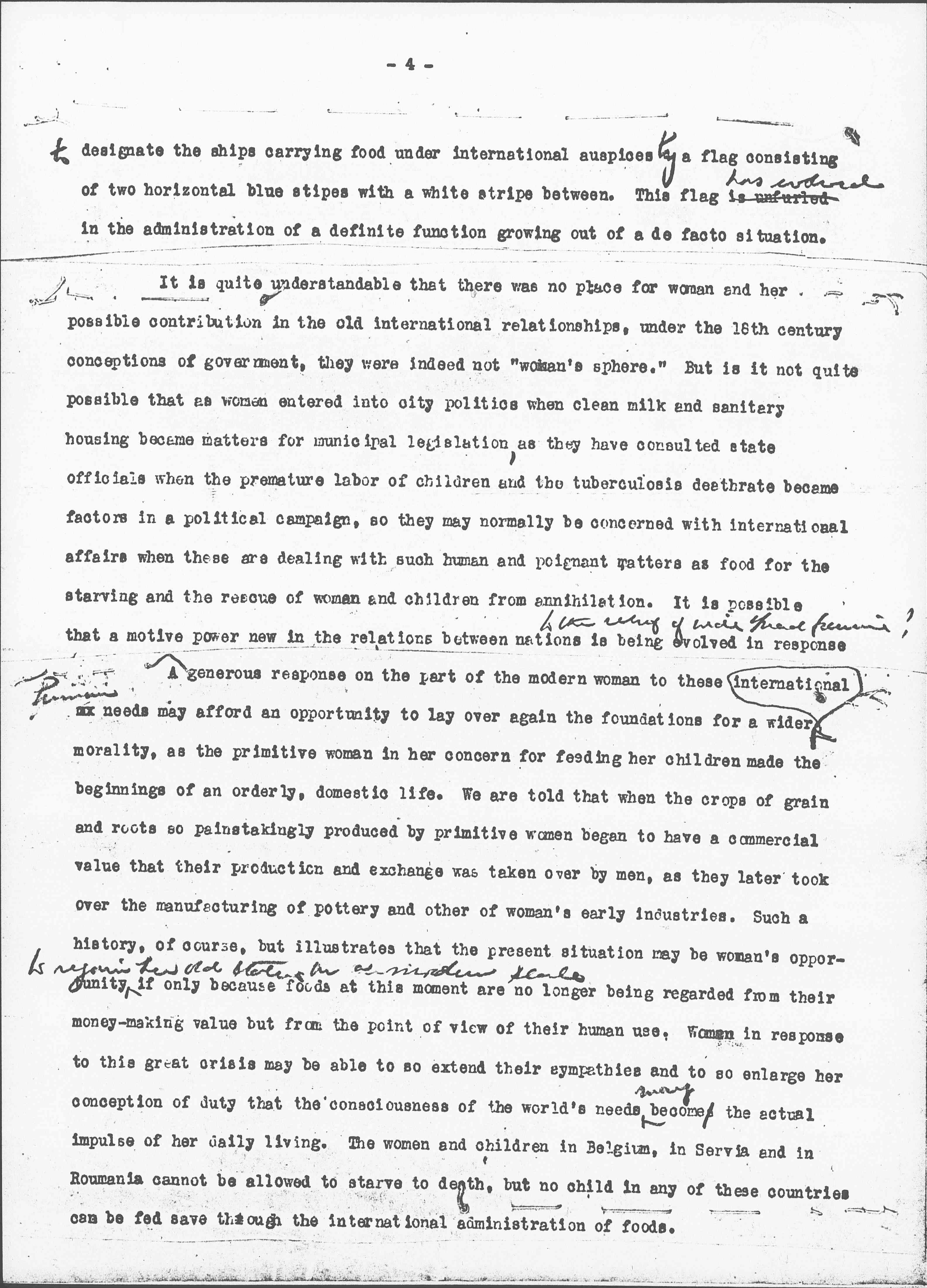 A generous response on the part of the modern woman to these ↑human↓ [illegible] needs may afford an opportunity to lay over again the foundations for a wider international morality, as the primitive woman in her concern for feeding her children made the beginnings of an orderly, domestic life. We are told that when the crops of grain and roots so painstakingly produced by primitive women began to have a commercial value that their production and exchange was taken over by men, as they later took over the manufacturing of pottery and other of woman’s early industries. Such a history, of course, but illustrates that the present situation may be woman’s opportunity ↑to regain her old status on a modern scale↓ if only because foods at this moment are no longer being regarded from their money-making value but from the point of view of their human use. Women in response to this great crisis may be able to so extend their sympathies and to so enlarge her conception of duty that the consciousness of the world’s needs ↑may↓ become the actual impulse of her daily living. The women and children in Belgium, in [Serbia] and in [Romania] cannot be allowed to starve to death, but no child in any of these countries can be fed save through the international administration of foods. [page 5]