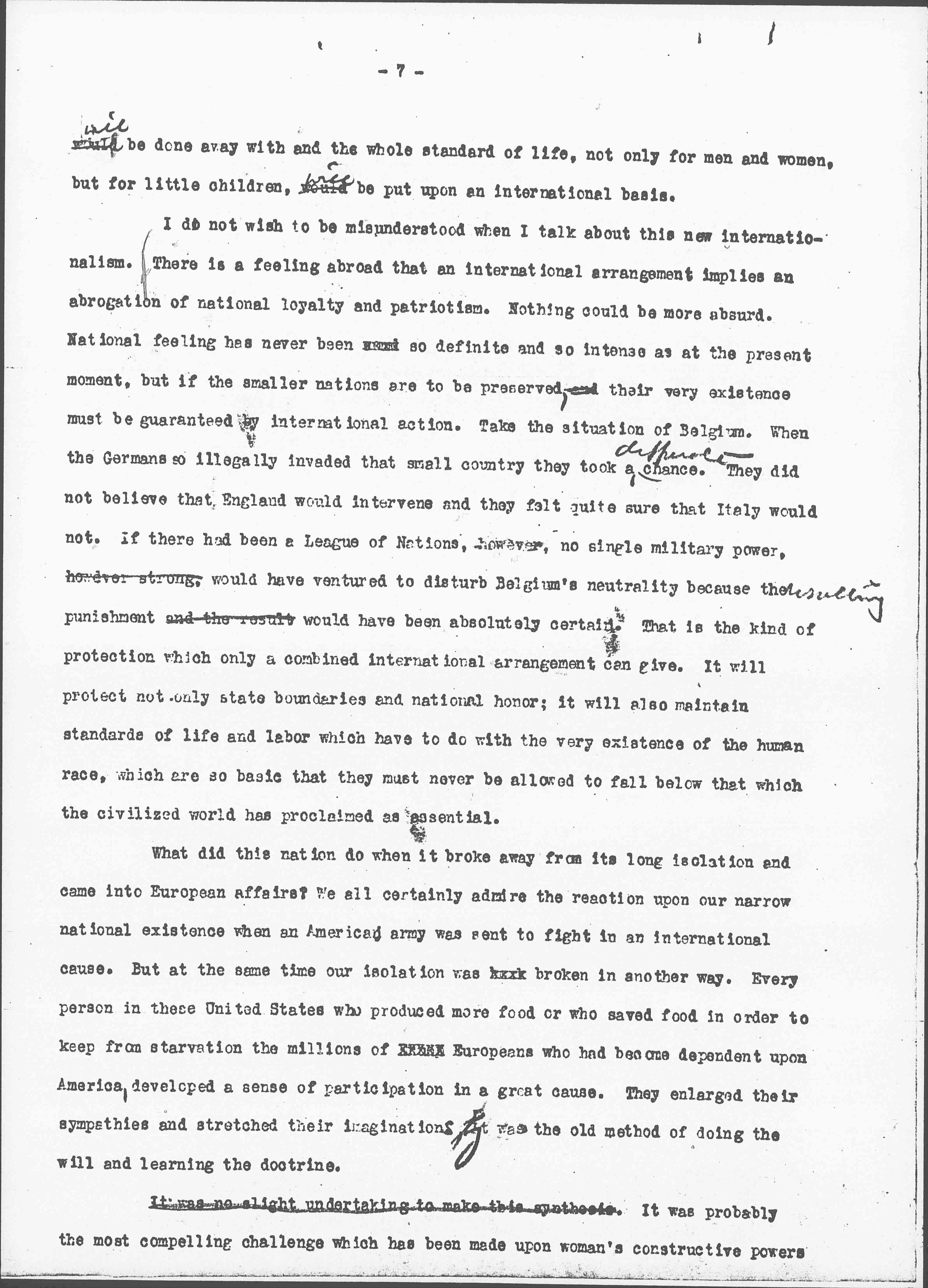 I do not wish to be misunderstood when I talk about this new internationalism. There is a feeling abroad that an international arrangement implies an abrogation of national loyalty and patriotism. Nothing could be more absurd. National feeling has never been [illegible] so definite and so intense as at the present moment, but if the smaller nations are to be preserved, and their very existence must be guaranteed by international action. Take the situation of Belgium. When the Germans so illegally invaded that small country they took a ↑desperate↓ chance. They did not believe that England would intervene and they felt quite sure that Italy would not. If there had been a League of Nations, however, no single military power, however strong, would have ventured to disturb Belgium’s neutrality because the ↑resulting↓ punishment and the result would have been absolutely certain. That is the kind of protection which only a combined international arrangement can give. It will protect not only state boundaries and national honor; it will also maintain standards of life and labor which have to do with the very existence of the human race, which are so basic that they must never be allowed to fall below that which the civilized world has proclaimed as essential.