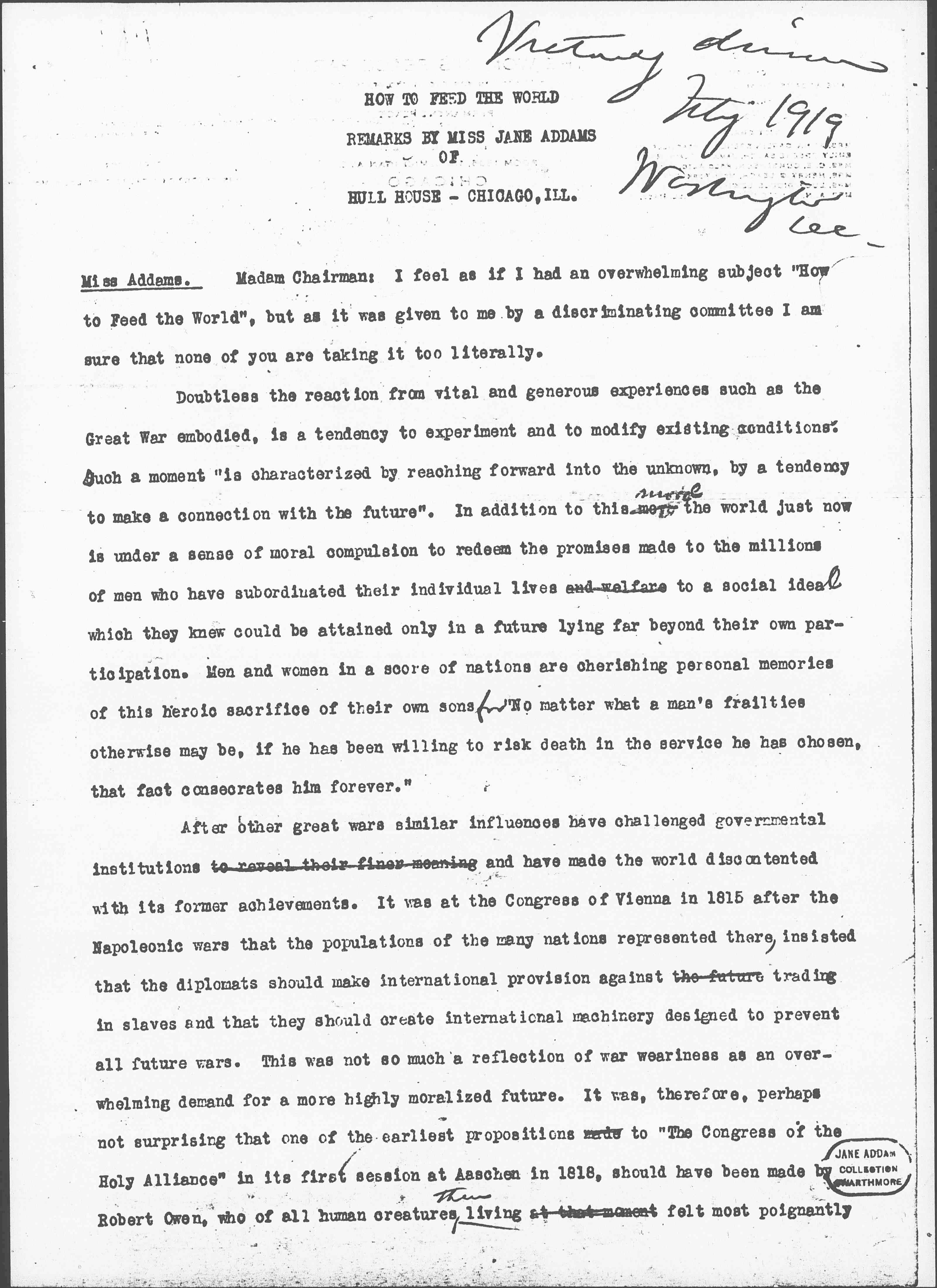 Miss Addams. Madam Chairman: I feel as if I had an overwhelming subject “How to Feed the World”, but as it was given to me by a discriminating committee I am sure that none of you are taking it too literally.