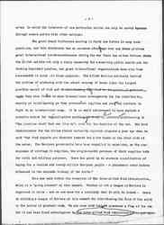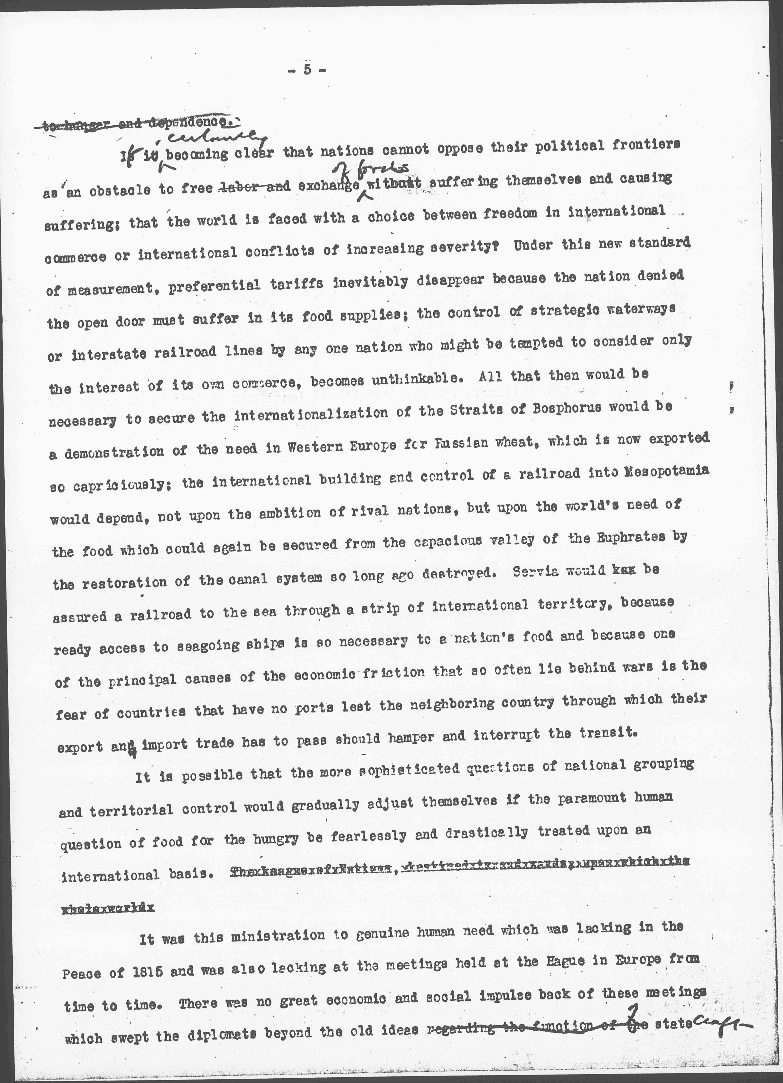 to hunger and dependence. It is ↑certainly↓ becoming clear that nations cannot oppose their political frontiers as an obstacle to free labor and exchange ↑of foods↓ without suffering themselves and causing suffering; that the world is faced with a choice between freedom in international commerce or international conflicts of increasing severity? Under this new standard of measurement, preferential tariffs inevitably disappear because the nation denied the open door must suffer in its food supplies; the control of strategic waterways or interstate railroad lines by any one nation who might be tempted to consider only the interest of its own commerce, becomes unthinkable. All that then would be necessary to secure the internationalization of the Straits of Bosphorus would be a demonstration of the need in Western Europe for Russian wheat, which is now exported so capriciously; the international building and control of a railroad into Mesopotamia would depend, not upon the ambition of rival nations, but upon the world’s need of the food which could again be secured from the capacious valley of the Euphrates by the restoration of the canal system so long ago destroyed. [Serbia] [illegible] be assured a railroad to the sea through a strip of international territory, because ready access to seagoing ships is so necessary to a nations' food and because one of the principal causes of the economic friction that so often lie behind wars is the fear of countries that have no ports lest the neighboring country through which their export and import trade has to pass should hamper and interrupt the transit.