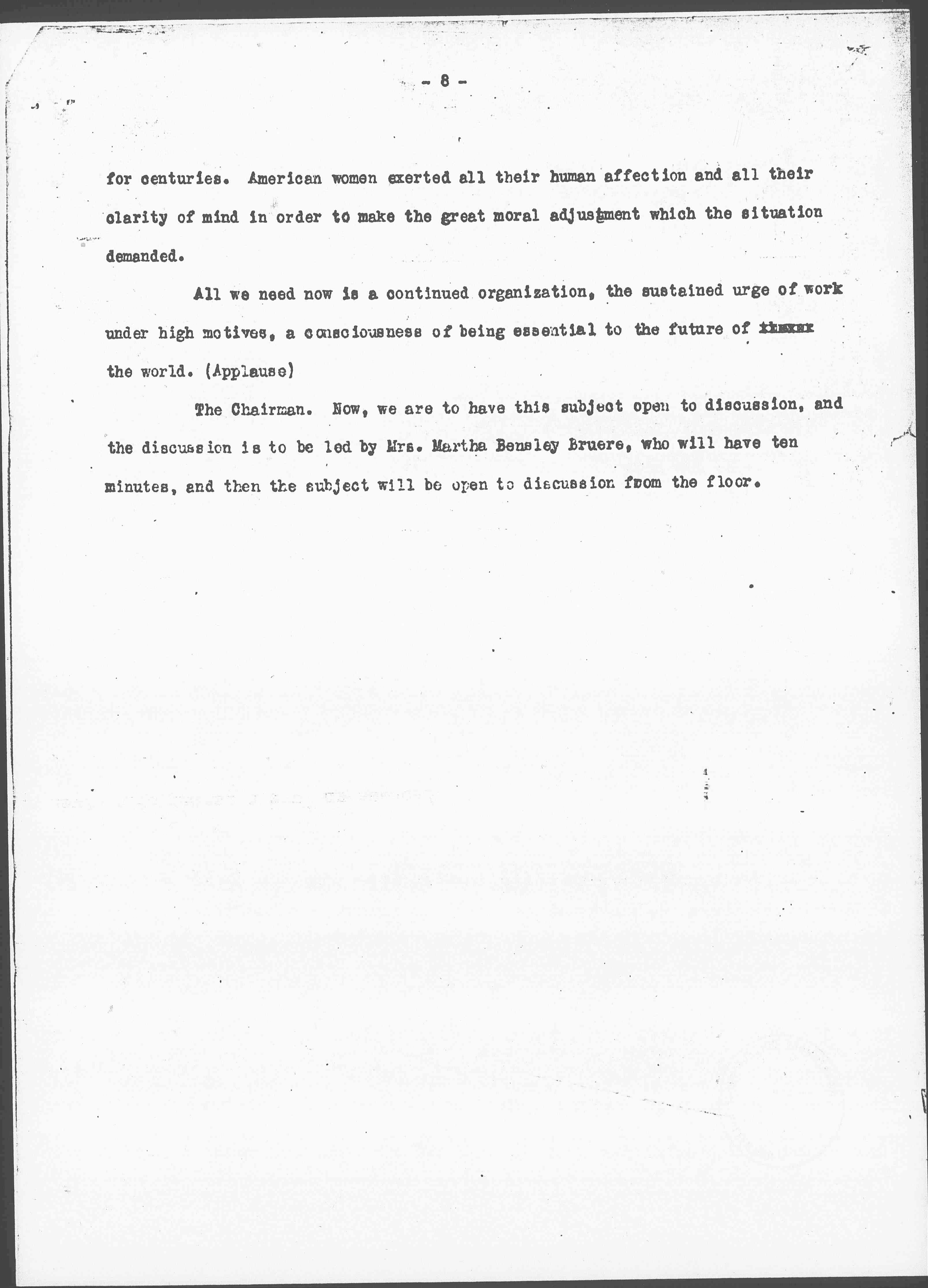 All we need now is a continued organization, the sustained urge of work under high motives, a consciousness of being essential to the future of [illegible] the world. (Applause)