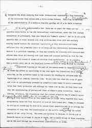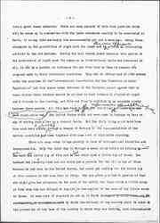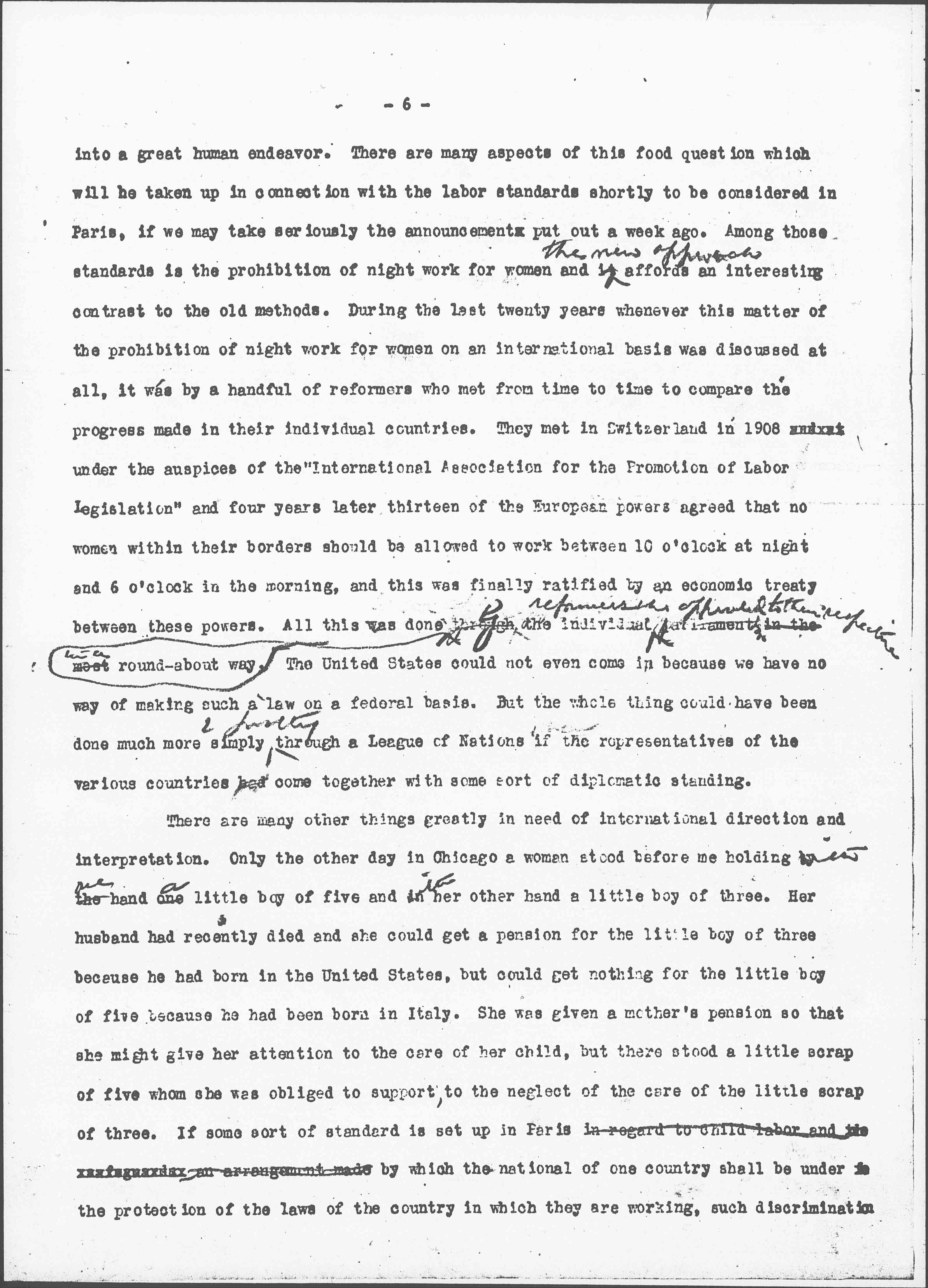 It was this ministration to genuine human need which was lacking in the Peace of 1815 and was also lacking at the meetings held at The Hague in Europe from time to time. There was no great economic and social impulse back of these meetings which swept the diplomatic beyond the old ideas regarding the function of the ↑of↓ state↑craft↓ [page 6] into a great human endeavor. There are many aspects of this food question which will be taken up in connection with the labor standards shortly to be considered in Paris, if we may take seriously the announcement put out a week ago. Among those standards is a prohibition of night work for women and it ↑the new approach↓ affords an interesting contrast to the old methods. During the last twenty years whenever this matter of the prohibition of night work for women on an international basis was discussed at all, it was by a handful of reformers who met from time to time to compare the progress made in their individual countries. They met in Switzerland in 1908 [illegible] under the auspices of the “International Association for the Promotion of Labor Legislation” and four years later thirteen of the European powers agreed that no women within their borders should be allowed to work between 10 o’clock at night and 6 o’clock in the morning, and this was finally ratified by an economic treaty between these powers. All this was done ↑in a↓ round-about way through the ↑by↓ individual ↑reformers who appealed to their respective↓ Parliaments. The United States could not even come in because we have no way of making such a law on a federal basis. But the whole thing could have been done much more simply ↑& [swiftly]↓ through a League of Nations if ↑[illegible]↓ the representatives of the various countries had come together with some sort of diplomatic standing.