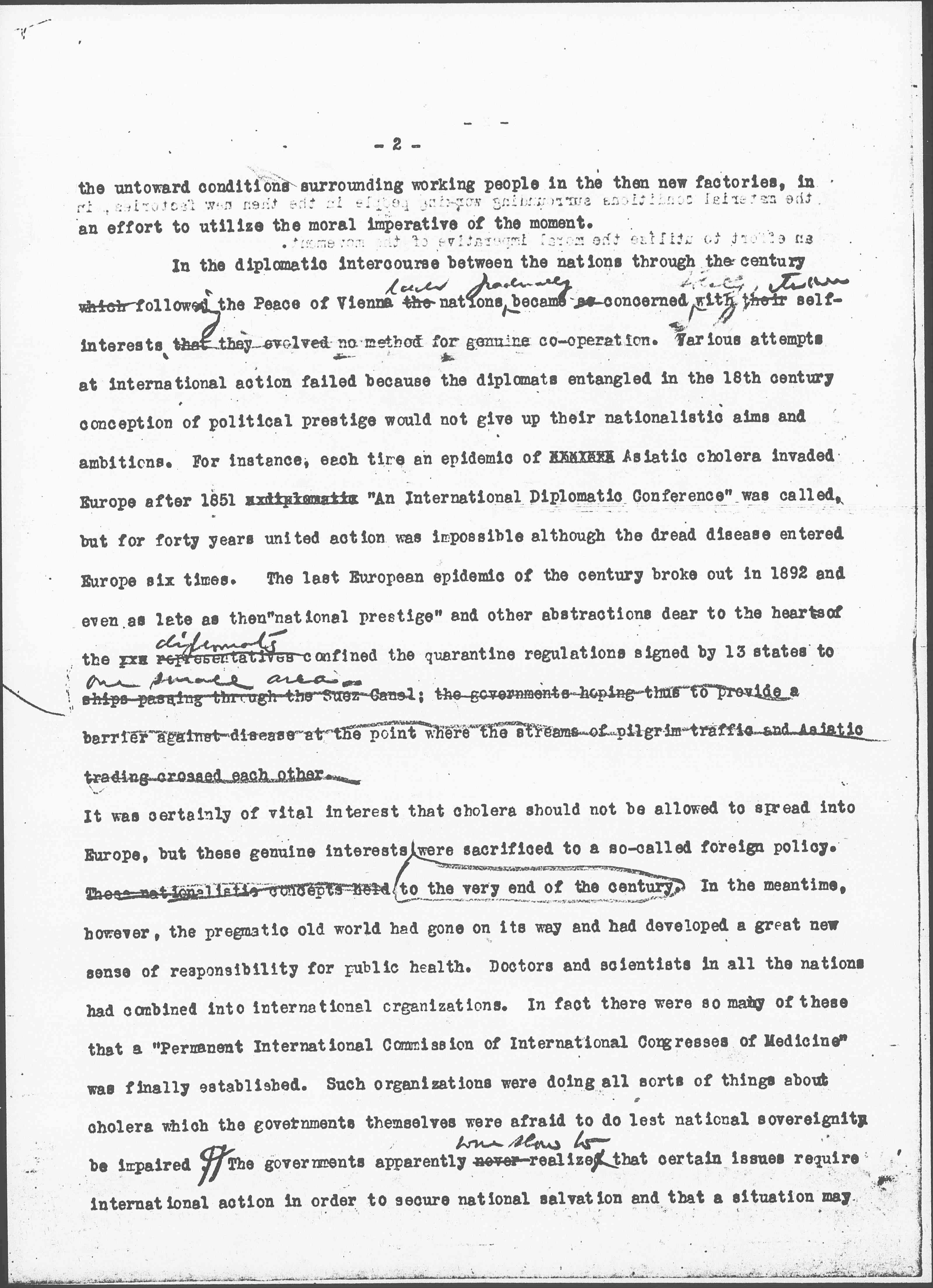 In the diplomatic intercourse between the nations through the century which following the Peace of Vienna the ↑each↓ nations ↑[productivity?]↓ became as concerned with ↑[illegible]↓ their ↑its own↓ self-interests, that they evolved no method for genuine [cooperation]. Various attempts at international action failed because the diplomats entangled in the 18th century conception of political prestige would not give up their nationalistic aims and ambitions. For instance, each time an epidemic of [illegible] Asiatic cholera invaded Europe after 1851 [illegible] “An International Diplomatic Conference” was called, but for forty years united action was impossible although the dread disease entered Europe six times. The last European epidemic of the century broke out in 1892 and even as late then “national prestige” and other abstractions dear to the hearts of the [illegible] representatives ↑diplomats↓ confined the quarantine regulations signed by 13 states to ↑one small area --↓ ships passing through the Suez Canal; the governments hoping thus to provide a barrier against disease at the point where the streams of pilgrim traffic and Asiatic trading crossed each other.