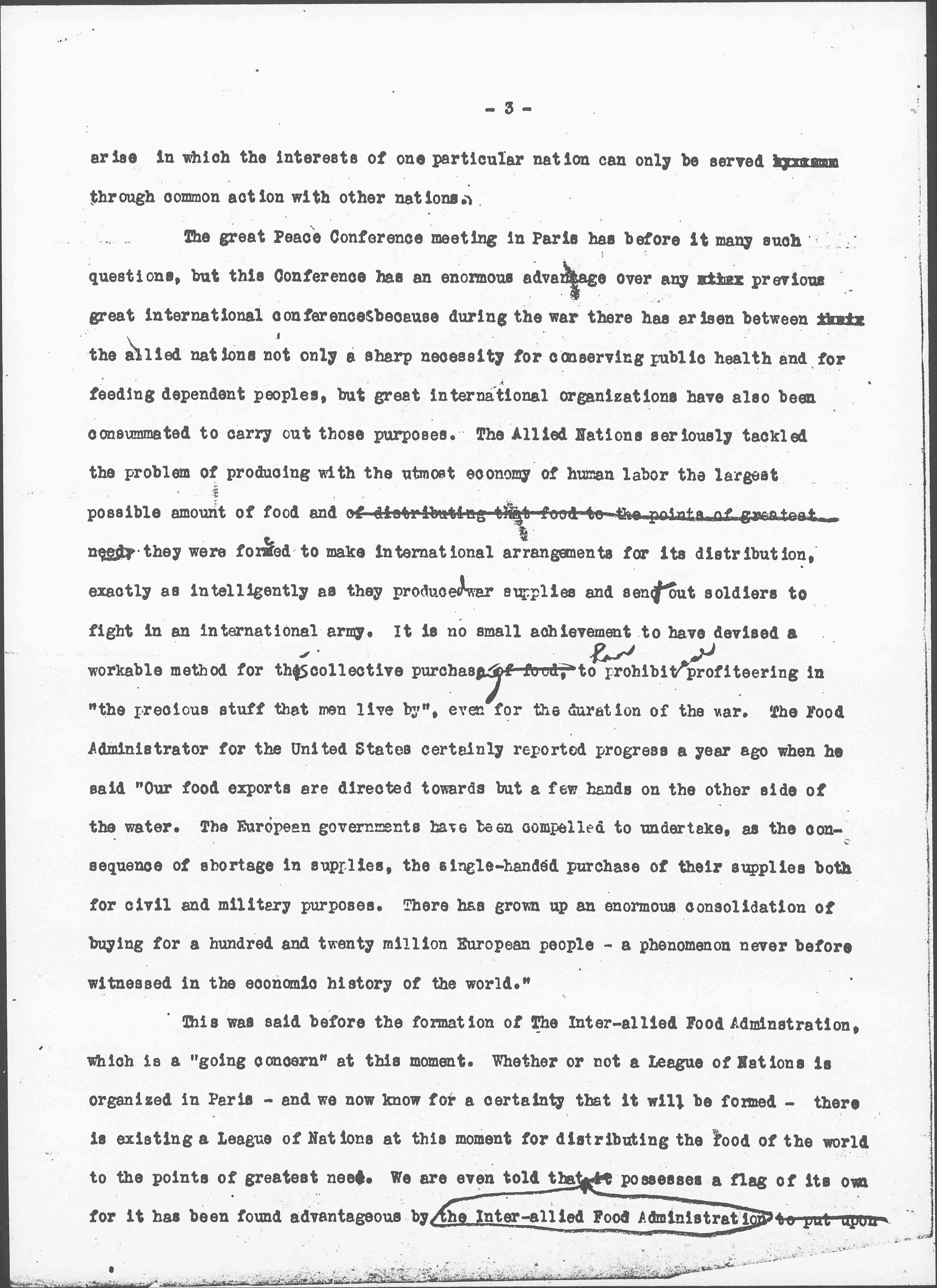 The great Peace Conference meeting in Paris has before it many such questions, but this Conference has an enormous advantage over any [illegible] previous great international conferences because during the war there has arisen between [illegible] the allied nations not only a sharp necessity for conserving public health and for feeding dependent peoples, but great international organizations have also been consummated to carry out those purposes. The Allied Nations seriously tackled the problem of producing with the utmost economy of human labor the largest possible amount of food and of distributing that food to the points of greatest need, they were forced to make international arrangements for its distribution, exactly as intelligently as they produced war supplies and sent out soldiers to fight in an international army. It is no small achievement to have devised a workable method for this collective purchase of food, to ↑have↓ prohibited profiteering in “the precious stuff that men live by”, even for the duration of the war. The Food Administrator for the United States certainly reported progress a year ago when he said “Our food exports are directed towards but a few hands on the other side of the water. The European governments have been compelled to undertake, as the consequence of shortage in supplies, the single-handed purchase of their supplies both for civil and military purposes. There has grown up an enormous consolidation of buying for a hundred and twenty million European people -- a phenomenon never before witnessed in the economic history of the world.”