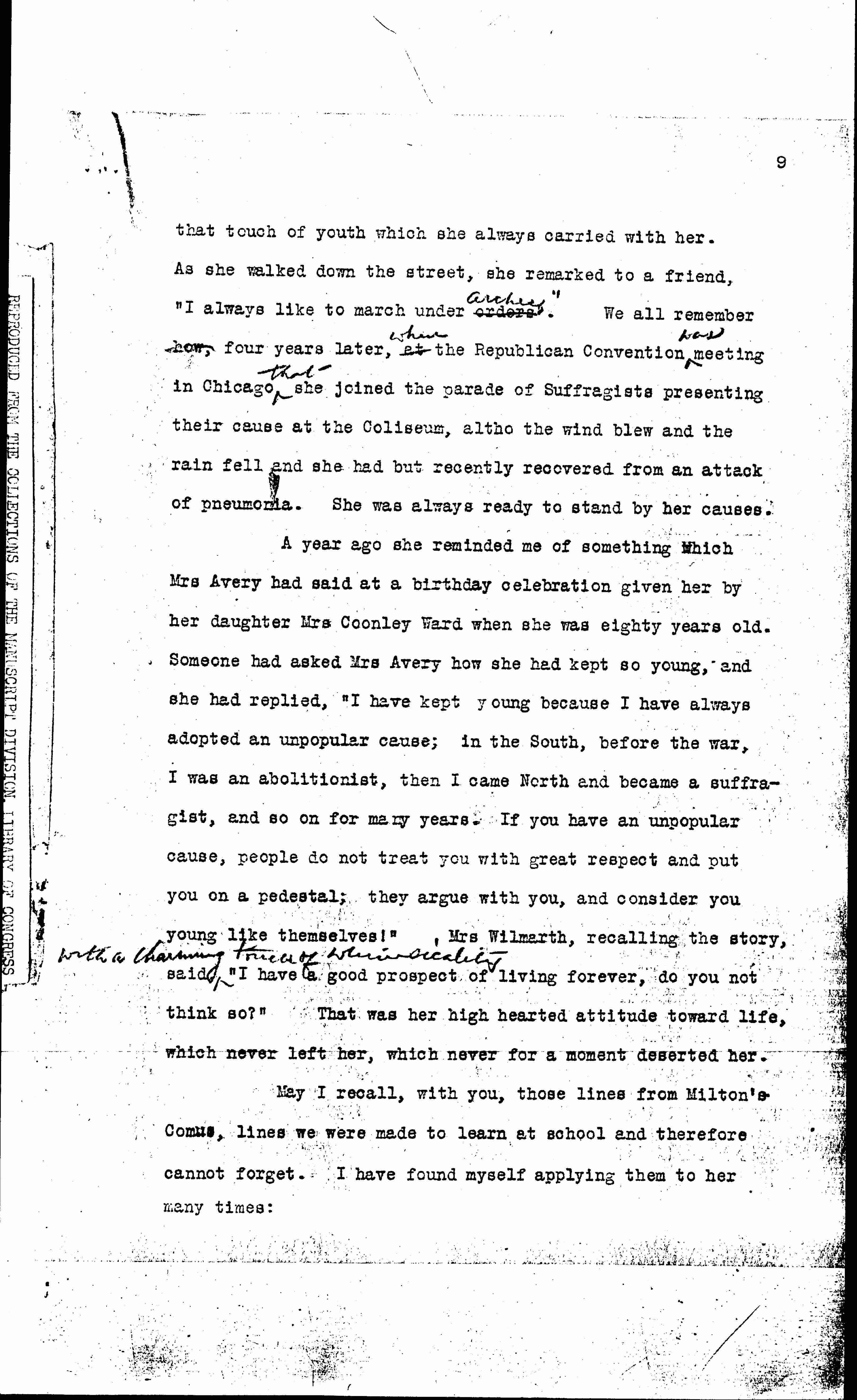Something she said when she came out of the Progressive Convention, where she sat as a delegate in 1912, illustrates [page 10] that touch of youth which she always carried with her. As she walked down the street, she remarked to a friend, “I always like to march under orders ↑arches↓.” We all remember how, four years later, at ↑when↓ the Republican Convention ↑was↓ meeting in Chicago ↑that↓ she joined the parade of Suffragists presenting their cause at the Coliseum, [although] the wind blew and the rain fell and she had but recently recovered from an attack of pneumonia. She was always ready to stand by her causes.